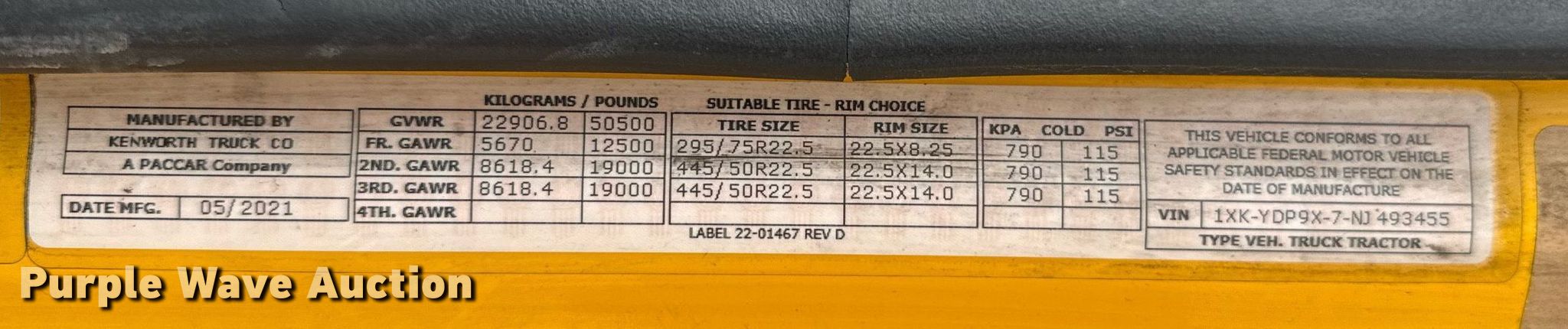 Purple Wave is selling a used Truck Tractor in Oklahoma. This item is a 2022 Kenworth T680 semi truck with the following: Miles: 456,135 on odometer, Engine hours: 10,679 on meter, VIN: 1XKYDP9X7NJ493455, Unit #: 22536