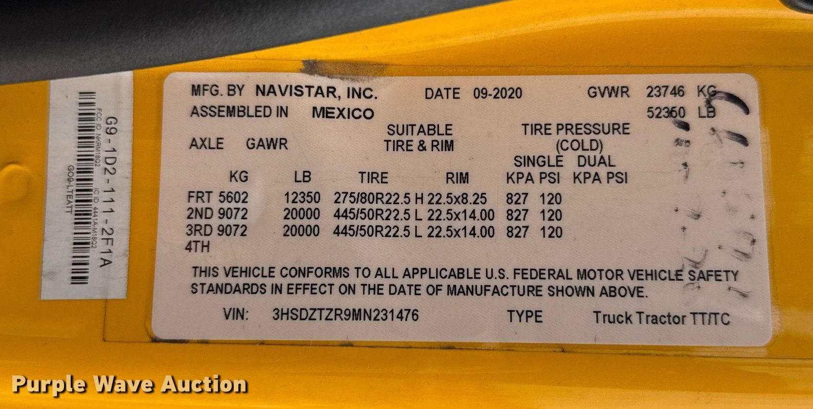 Purple Wave is selling a used Truck Tractor in Oklahoma. This item is a 2021 International LT625 semi truck with the following: Miles: 597,679 on odometer, Engine hours: 12,036 on meter, VIN: 3HSDZTZR9MN231476, Unit #: 21902