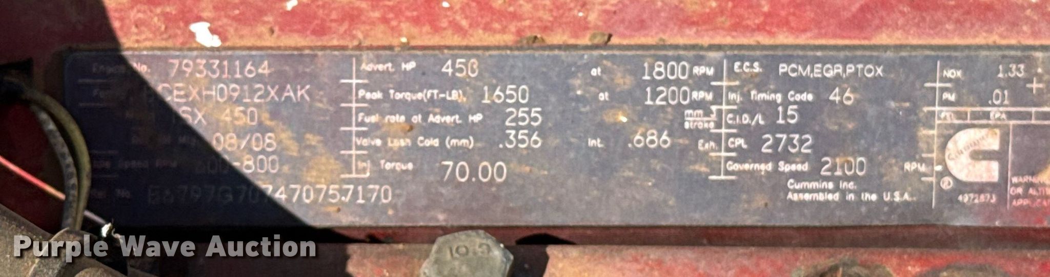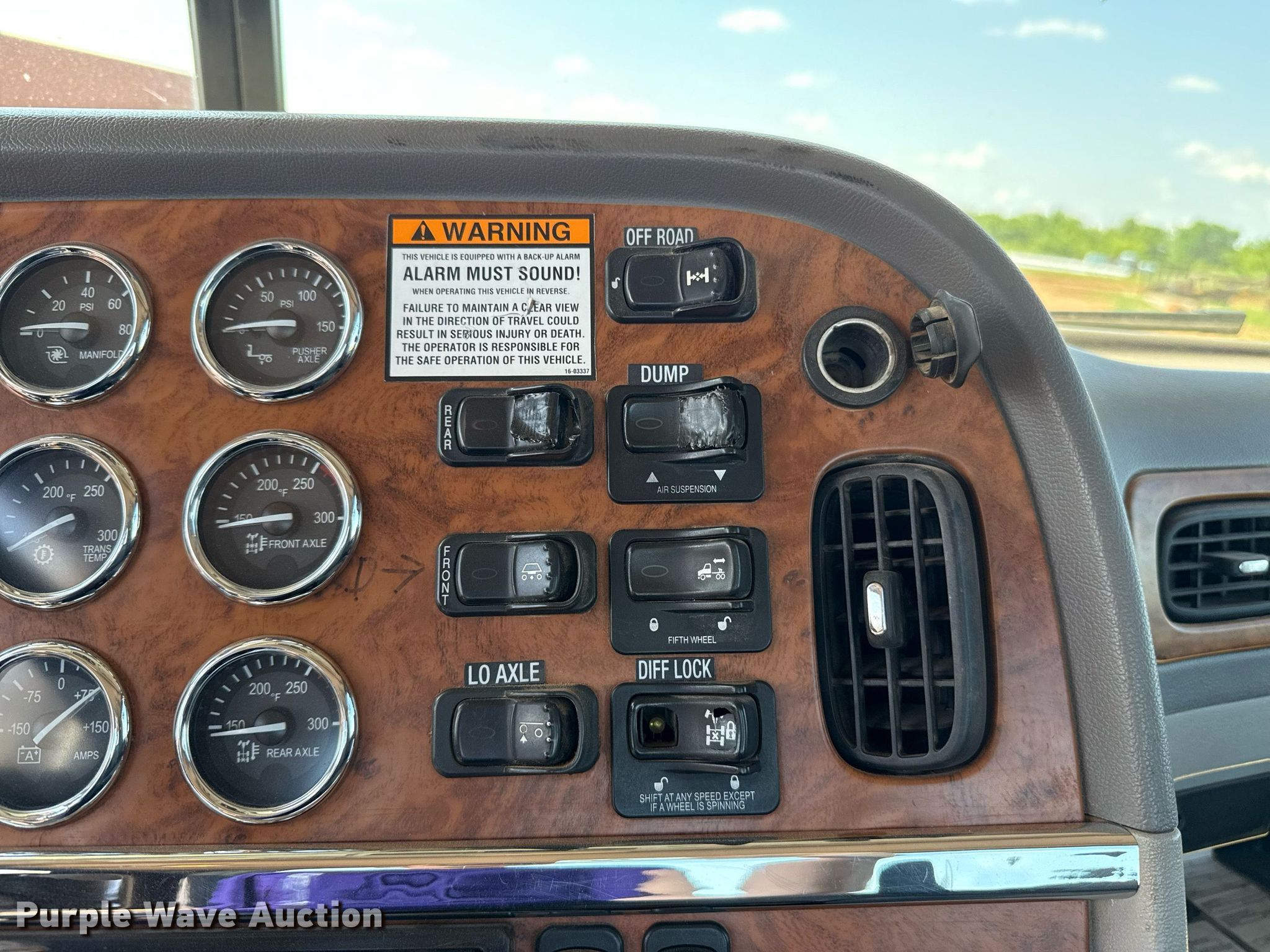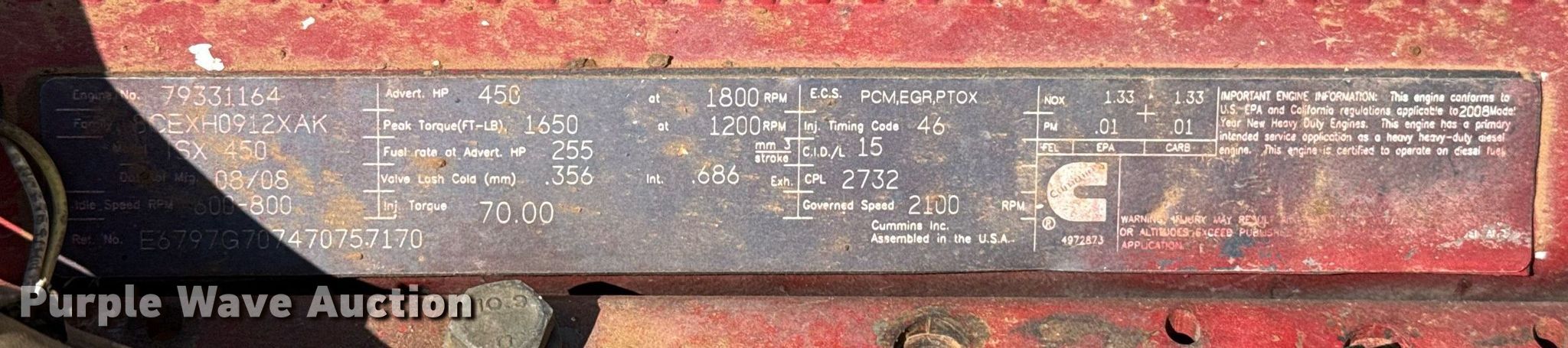 2009 Peterbilt 367 semi truck. Miles: 542,776 on odometer, Hours: 9,906 on meter, VIN: 1XPTD4EX69D783067. Engine Cummins ISX 450, Displacement: 15.0L, Cylinders: 6, Fuel type: Diesel, Engine brake. Transmission Allison, Automatic. Chassis Axles: Triple, Pusher axle, Differential lock: Full, Suspension: Air Dump valves, Brakes: Air, GVWR: 72,670 lbs FAWR: 14,320 lbs, IAWR: 23,000 lbs, RAWR: 23,000 lbs, Lift axle GAWR: 12,350 lbs. Interior AC, Heat, Heated mirrors, Power windows, Power locks, Cruise control, Air ride cab. Features Deck plate: Aluminum, Fifth wheel type: Air operated, Sliding, Fuel tank: Dual. Tires Size: 11R24.5, Lift axle: 295/75R22.5. Notes Windshield chipped or cracked. Oklahoma title. Title distribution may be delayed up to 14 days from verification of funds. Pintail Oilfield Services. 5700 East 750 Road. Guthrie, OK 73044