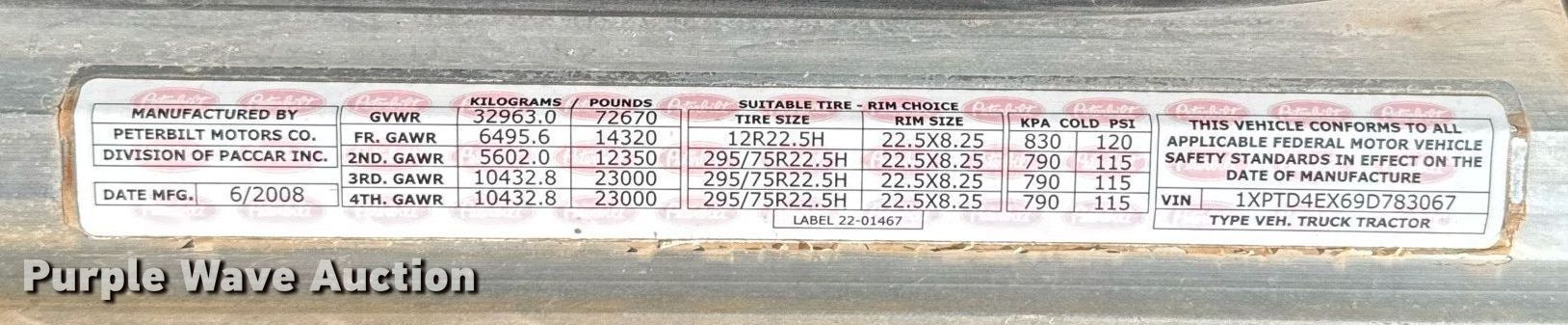 Purple Wave is selling a used Truck Tractor in Oklahoma. This item is a 2009 Peterbilt 367 semi truck with the following: Miles: 542,776 on odometer, Hours: 9,906 on meter, VIN: 1XPTD4EX69D783067