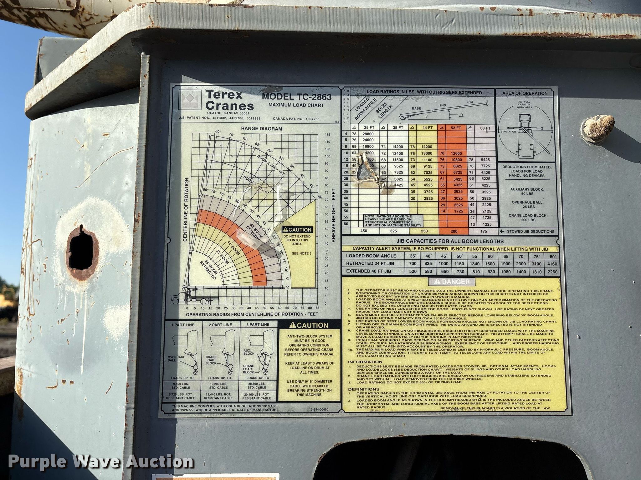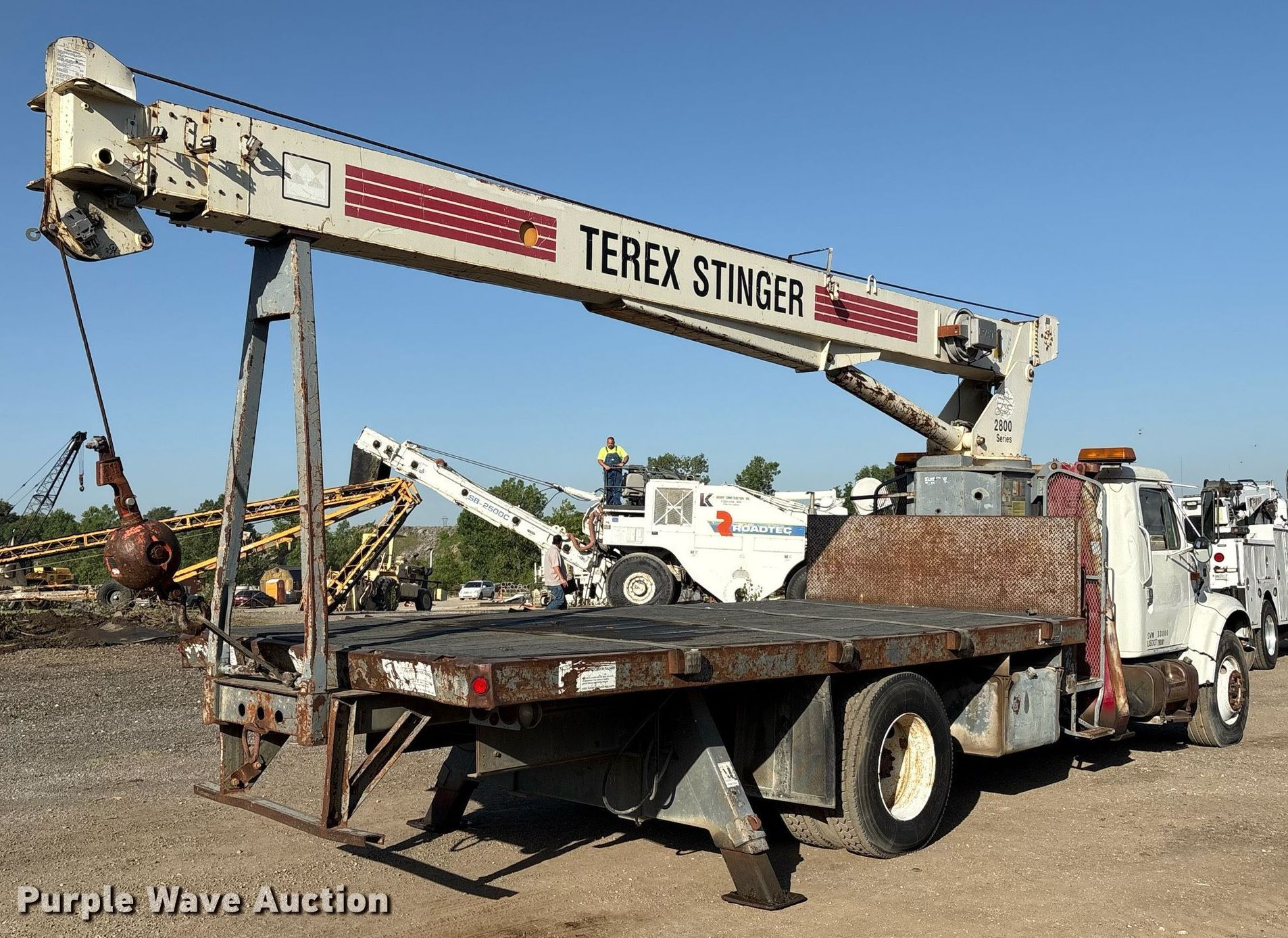 2000 International 4700 crane truck. Miles: 217,720 on odometer, VIN: 1HTSCAAN2YH247360. Engine International DT466E, Displacement: 7.6L, Cylinders: 6, Fuel type: Diesel. Transmission Manual, Speed: 7. Chassis Axles: Single, Suspension: Spring, Brakes: Air, PTO. Interior AC, Heat. Features Flatbed Terex, 18' L x 96" W, Crane Terex TC2863 Serial: 45905992140, Boom Telescopic, Maximum boom length: 63' Sections: 3, Maximum lift capacity: 28,800 lbs, Jib: 25', Boom controls Ground, Crane block Sheaves: 1, Capacity: 7 tons, Crane ball & hook, Lift chart. Tires Size: 11R22.5. Oklahoma title. Title distribution may be delayed up to 14 days from verification of funds. Becco Contractors Inc. Tulsa, OK 74116
