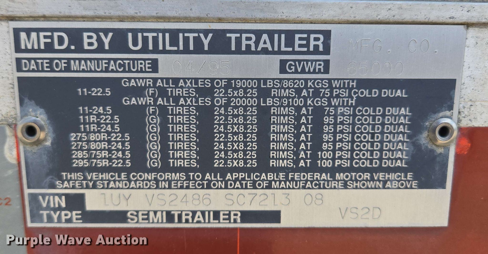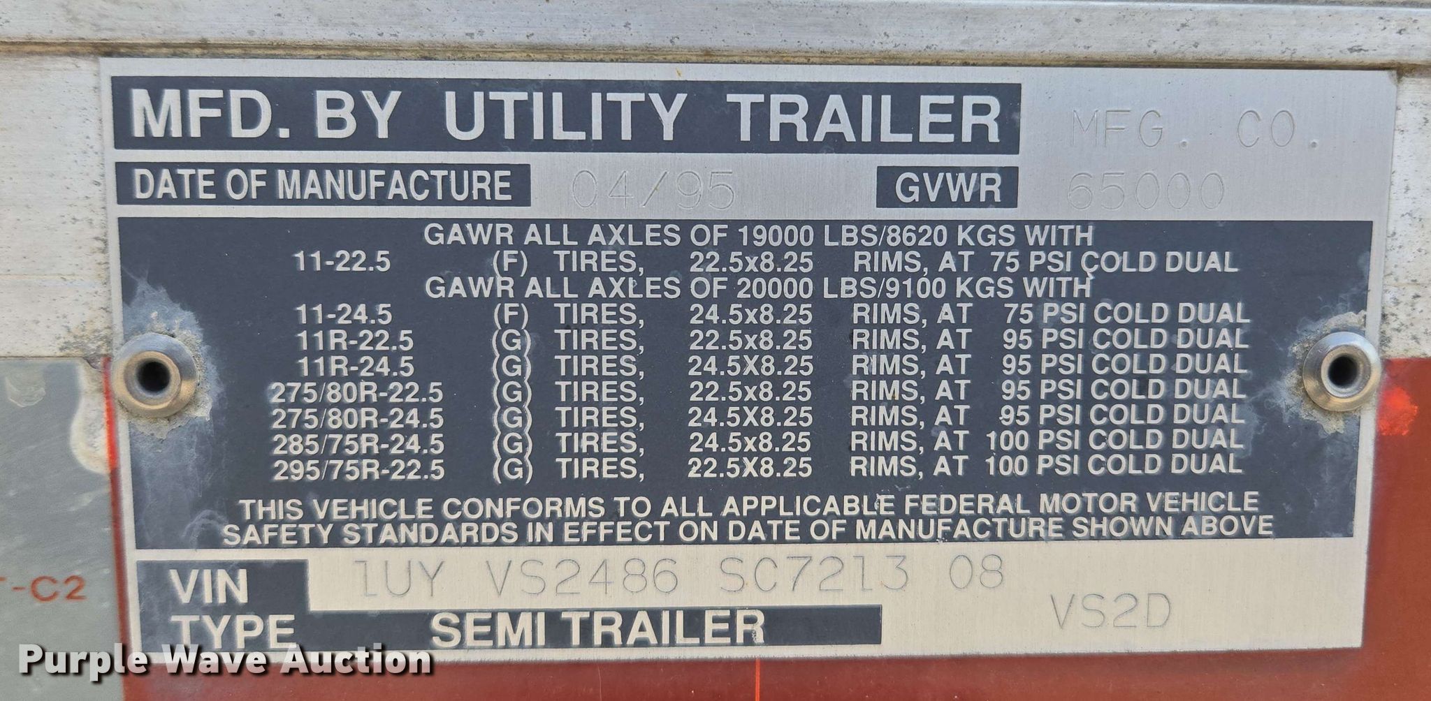 1995 Utility Trailer Manufacturer dry van trailer. VIN: 1UYVS2486SC721308. Dimensions Overall: 48' L x 102" W, Body: 48' L x 102" W. Features Deck type: Aluminum. Chassis Landing gear: Dual, Suspension: Spring, Brakes: Air, Axles: Tandem, GVWR: 65,000 lbs. Tires Steel wheels, Size: 295/75R22.5. Notes Contents not included, Door damage. Missouri title. Title distribution may be delayed up to 14 days from verification of funds. LT Delivery, Inc.. Northmoor, MO 64151