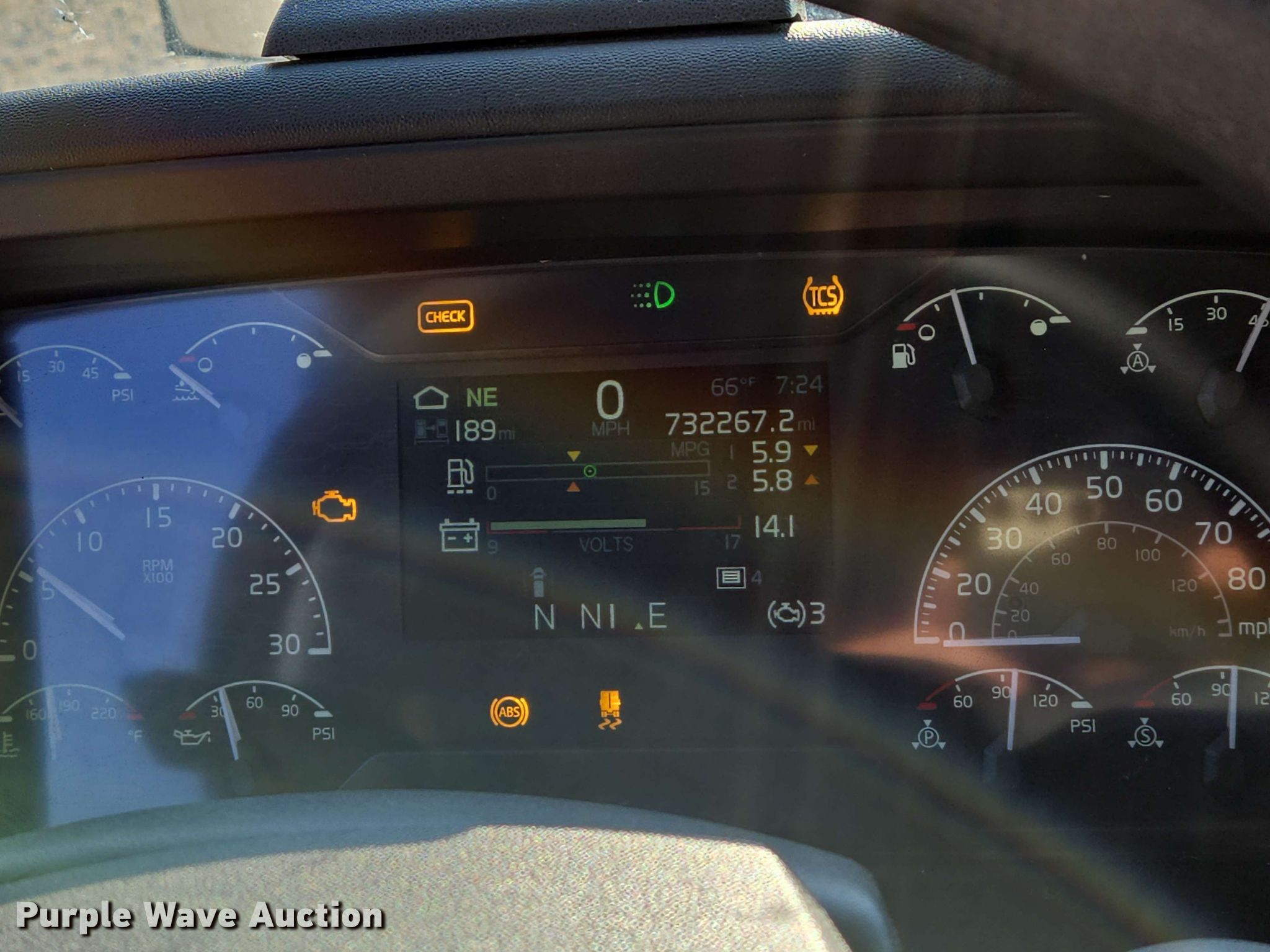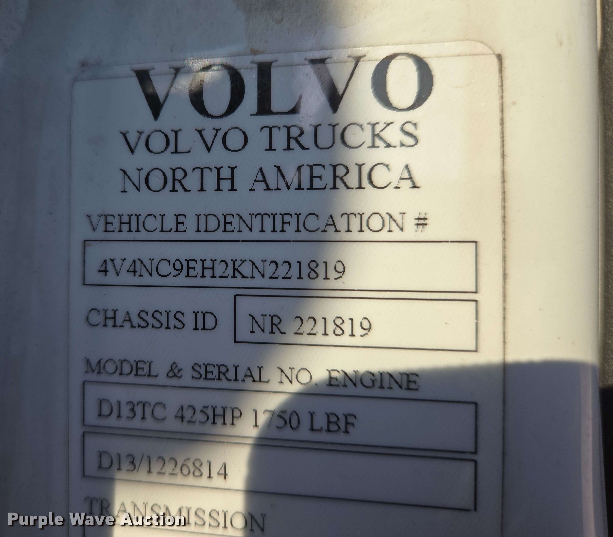 2019 Volvo VNL 760 semi truck. Miles: 732,267 on odometer, Hours: 27,839 on meter, VIN: 4V4NC9EH2KN221819. Engine Volvo D13M-455, Serial: 1226814, Displacement: 12.8L, Cylinders: 6, Fuel type: Diesel, HP: 425. Transmission Volvo I-Shift, Automated manual. Chassis Axles: Tandem, Differential lock: Inter-axle, Suspension: Air, Brakes: Air. Interior AC, Heat, Power windows, Power locks, Cruise control, Air ride cab, Sleeper Sleeper length: 60", Beds: Double bunk, Rear climate control. Features Deck plate: Aluminum, Fifth wheel type: Air operated, Sliding, Fuel tank: Dual. Tires Size: 295/75R22.5. Notes Dash warning indicator: Check engine, ABS, Traction control. Oklahoma title. Title has a lien that will be released following the close of the auction. Title distribution may be delayed up to 30 days from verification of funds. GROW Trucking. Ringwood, OK 73768