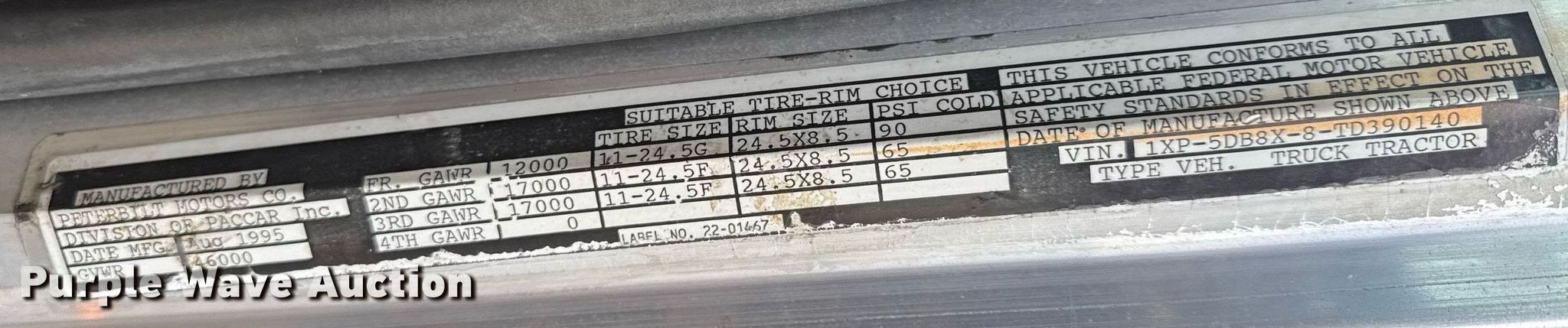 Purple Wave is selling a used Truck Tractor in Oklahoma. This item is a 1996 Peterbilt 379 semi truck with the following: Miles: 175,606 on odometer, VIN: 1XP5DB8X8TD390140