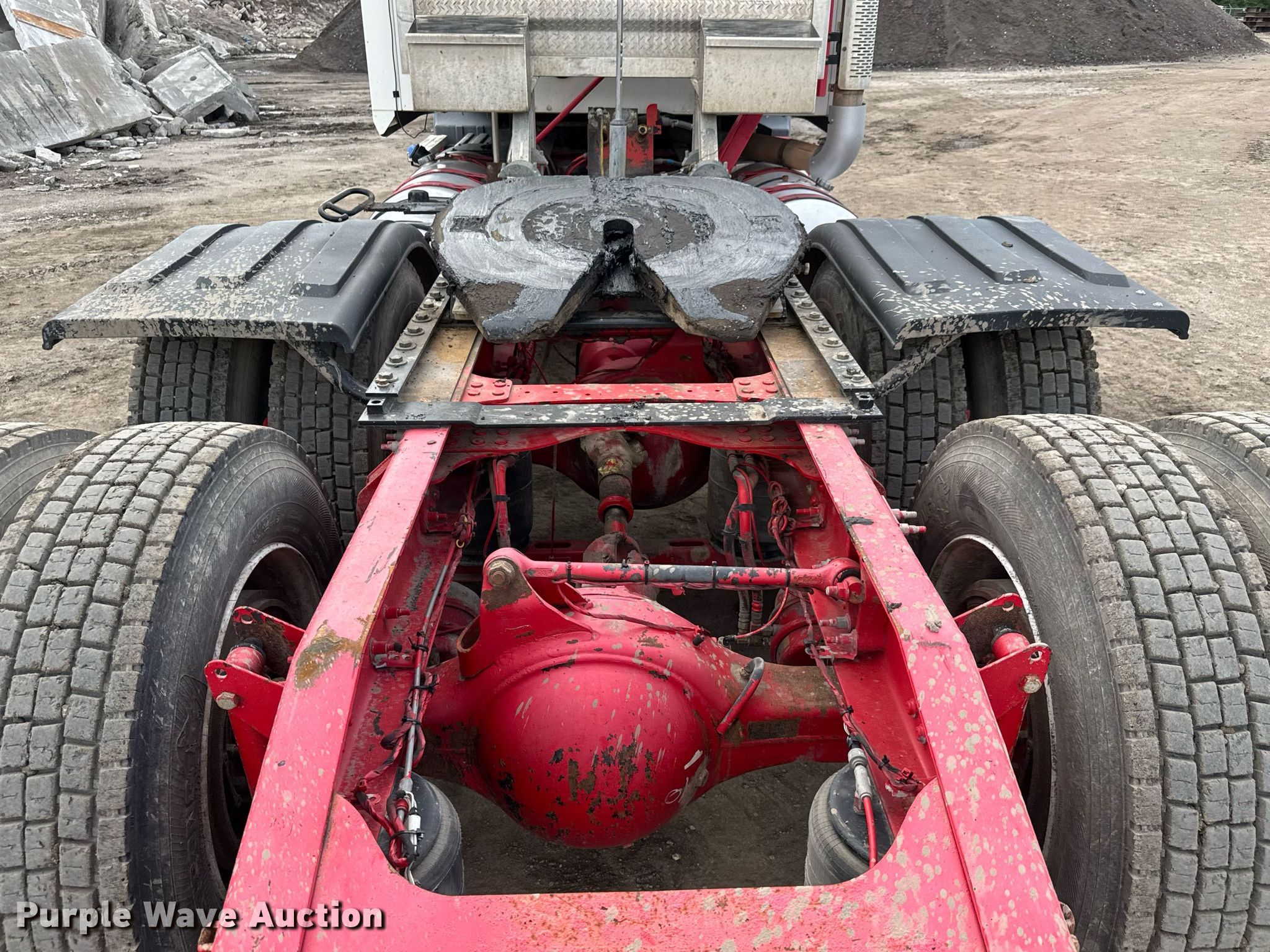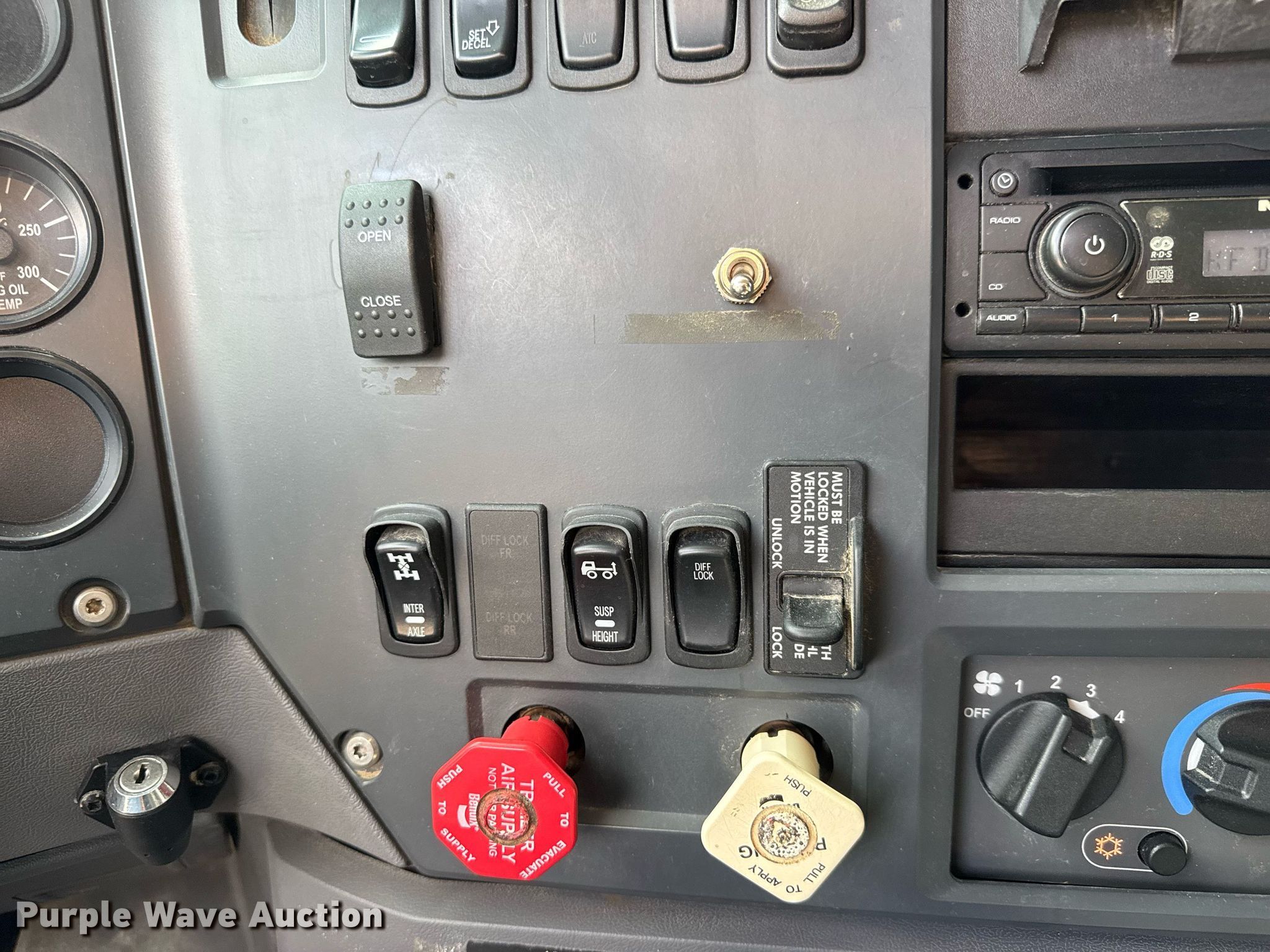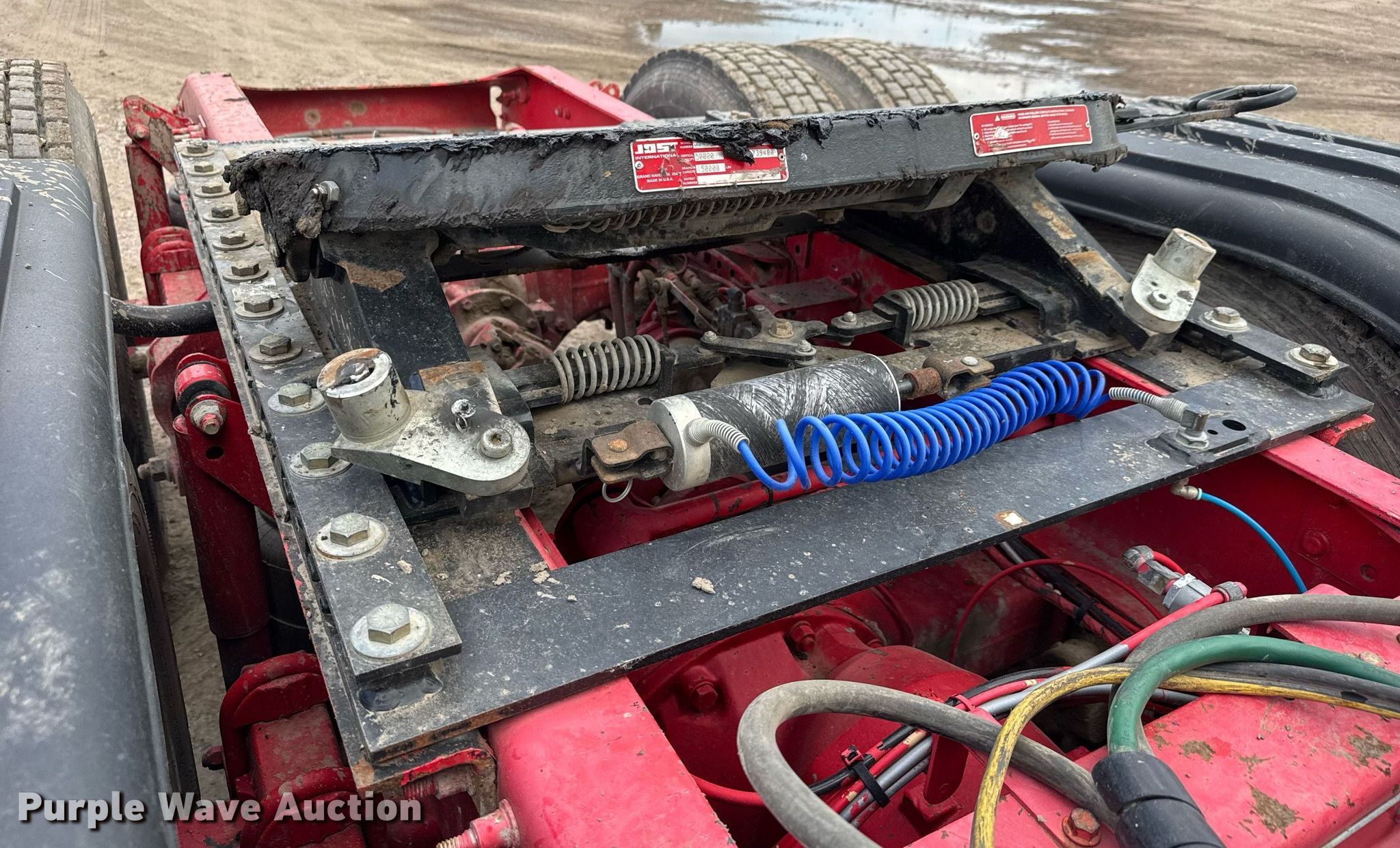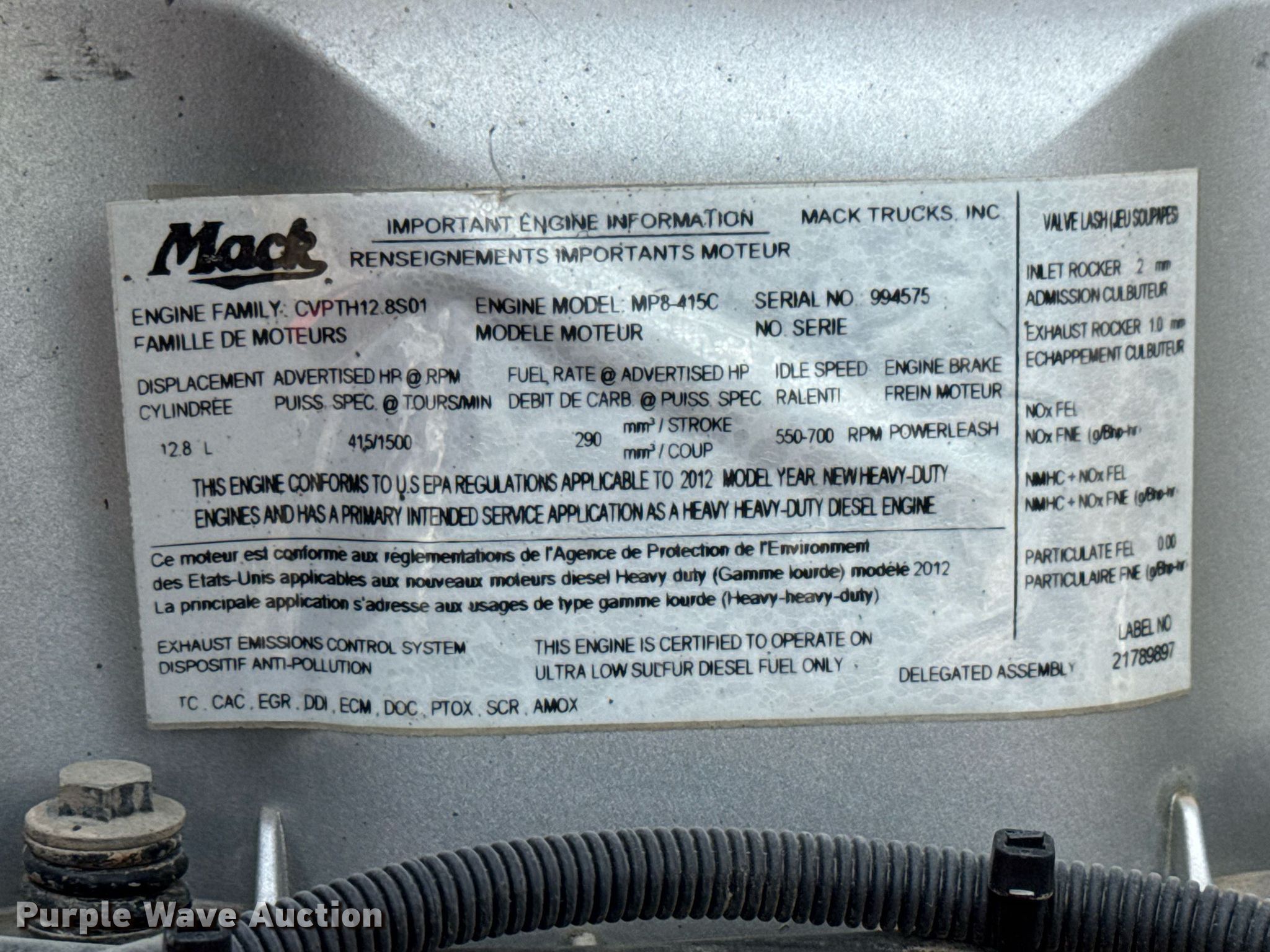 2013 Mack CXU613 semi truck. Miles: 75,294 on odometer, Hours: 1,302 on meter, VIN: 1M1AW09Y9DM027367. Engine Mack MP8-415C, Displacement: 12.8L, Cylinders: 6, Fuel type: Diesel, Engine brake. Transmission Eaton Fuller, Manual, Speed: 13. Chassis Axles: Tandem, Differential lock: Inter-axle, Suspension: Air Dump valves, Brakes: Air, PTO, Wet kit, GVWR: 52,000 lbs FAWR: 12,000 lbs, IAWR: 20,000 lbs, RAWR: 20,000 lbs. Interior AC, Heat, Heated mirrors, Cruise control, Air ride cab, Sleeper Sleeper length: 46", Beds: Single, Rear climate control. Features Deck plate: Aluminum, Fifth wheel type: Air operated, Sliding, Fuel tank: Dual. Tires Size: 11R24.5. Notes Dash warning indicator: Electrical fault. Kansas title. Title distribution may be delayed up to 14 days from verification of funds. Dondlinger & Sons Construction. Wichita, KS 67217