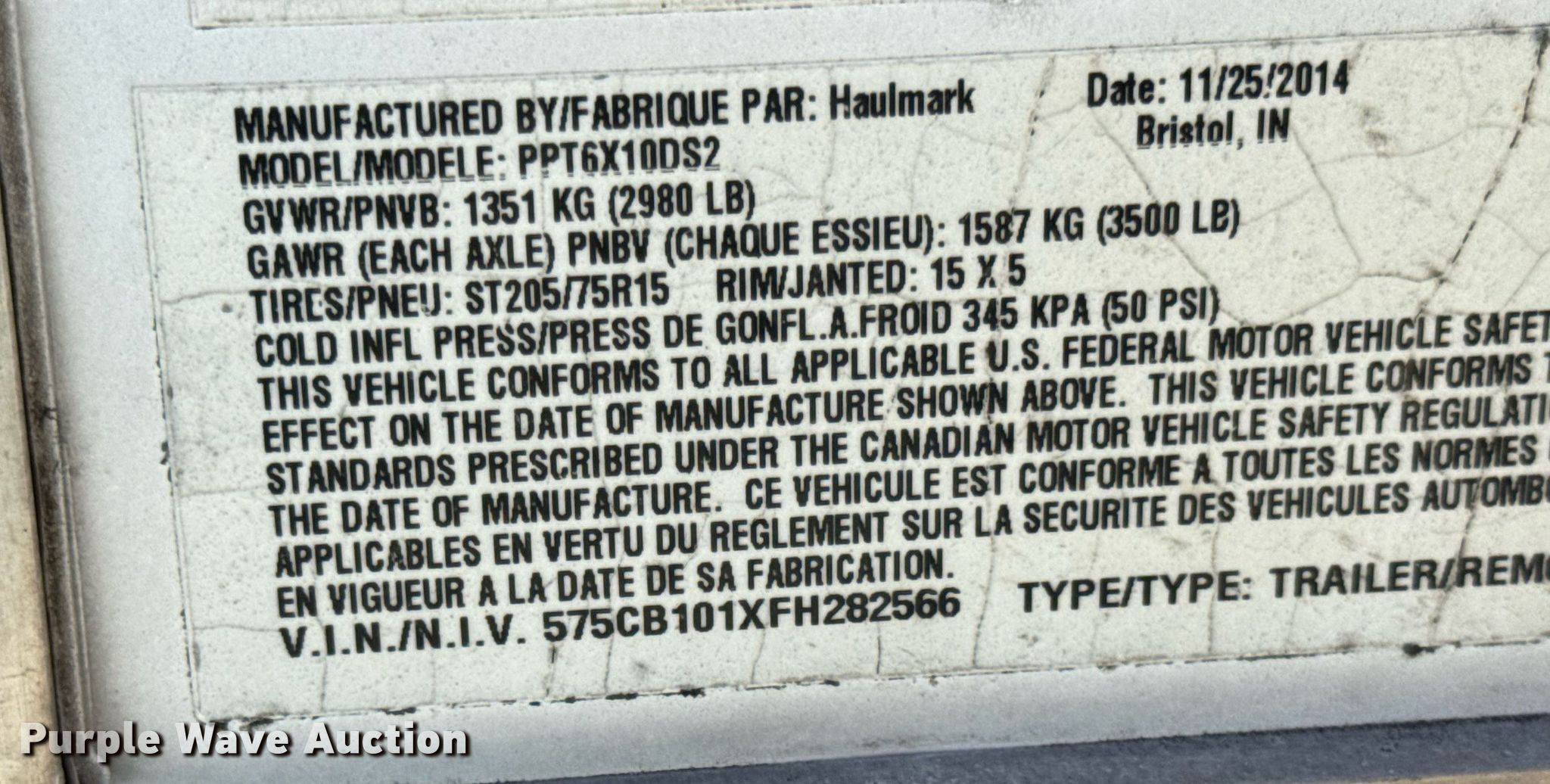 Purple Wave is selling a used Enclosed Cargo Trailer in Illinois. This item is a 2015 Haulmark PPT6X10DS2 enclosed cargo trailer with the following: VIN: 575CB101XFH282566