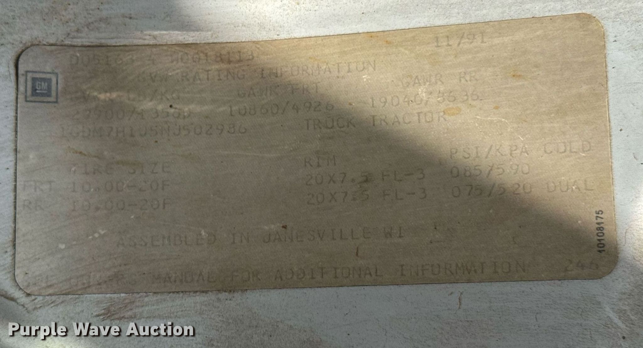 1992 GMC C7 flatbed truck. Miles: 249,168 on odometer, VIN: 1GDM7H1J5NJ502986. Engine Caterpillar 3116, Displacement: 6.6L, Cylinders: 6, Fuel type: Diesel. Transmission Manual, Speed: 6. Chassis Axles: Single, Suspension: Spring, Brakes: Air, GVWR: 29,900 lbs. Interior Heat. Features Flatbed 10' L x 96" W, Gooseneck, Auxiliary fuel tank Hose, Nozzle. Tires Front: 11R22.5, Rear: 10.00-20. Notes Dash warning indicator: Brake. Oklahoma title. Title distribution may be delayed up to 14 days from verification of funds. MK Excavation, LLC. Stillwater, OK 74074