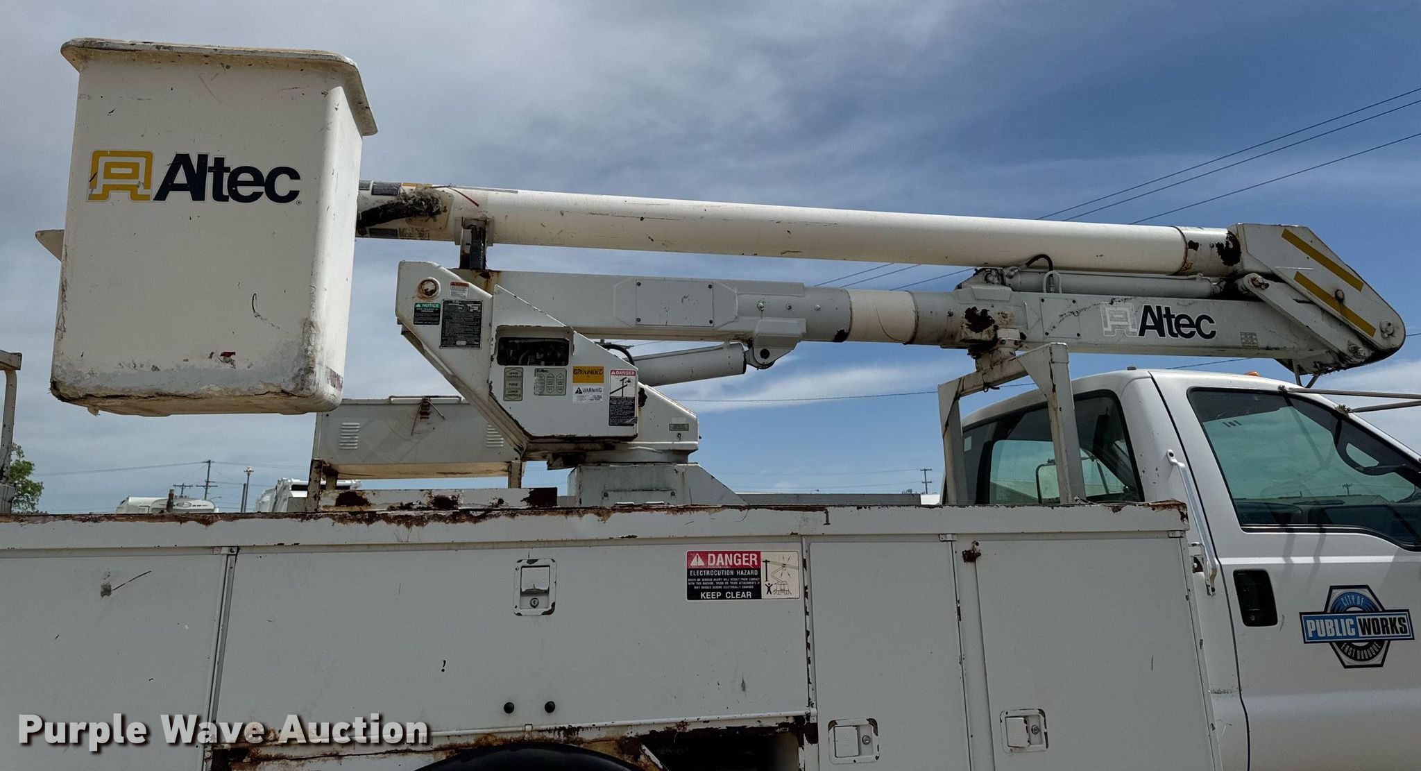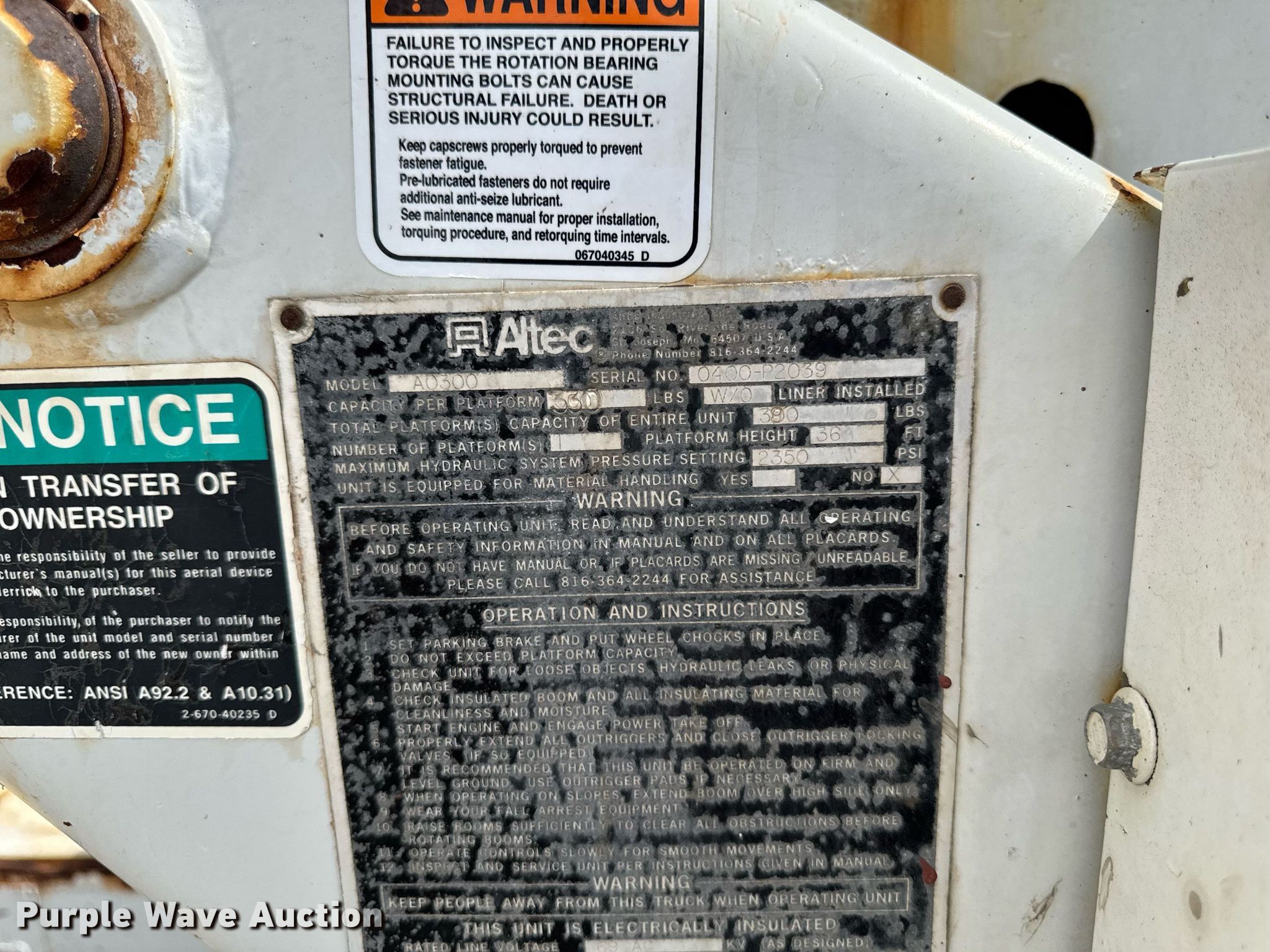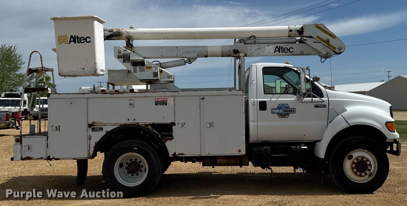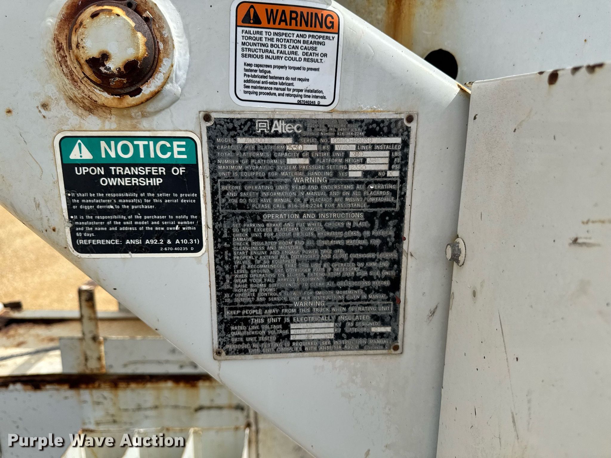 2000 Ford F650 Super Duty bucket truck. Miles: 361,812 on odometer, Hours: 8,620 on meter, VIN: 3FDWF654XYMA44292. Engine Cummins, Displacement: 5.9L, Cylinders: 6, Fuel type: Diesel. Transmission Manual, Speed: 6. Chassis Axles: Single, Suspension: Spring, Brakes: Air, PTO, GVWR: 26,000 lbs. Interior AC, Heat, Auxiliary controls, Brake controller. Features Bed Altec, Serial: 1761041800, 11' 4" L x 94" W, Boom Altec A0300, Serial: 0400-P2039, Mast height: 36', Maximum lift capacity: 330 lbs, Boom type: Articulating, Man basket, Boom controls Ground, Platform/ basket.. Tires Front: 11R22.5, Rear: 295/75R22.5. Notes Utility bed door issues. Iowa title. Title distribution may be delayed up to 30 days from verification of funds. Kilburg Equpment. Sabula, IA 52070