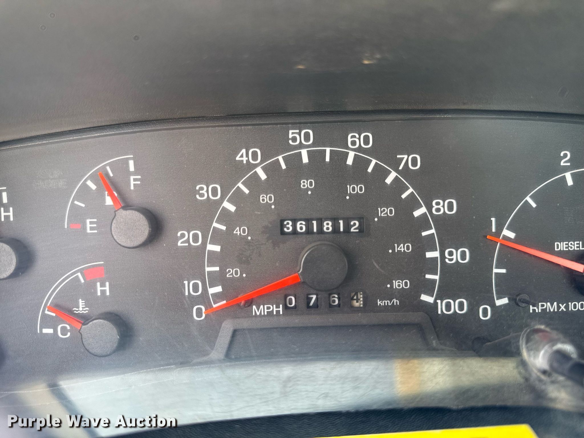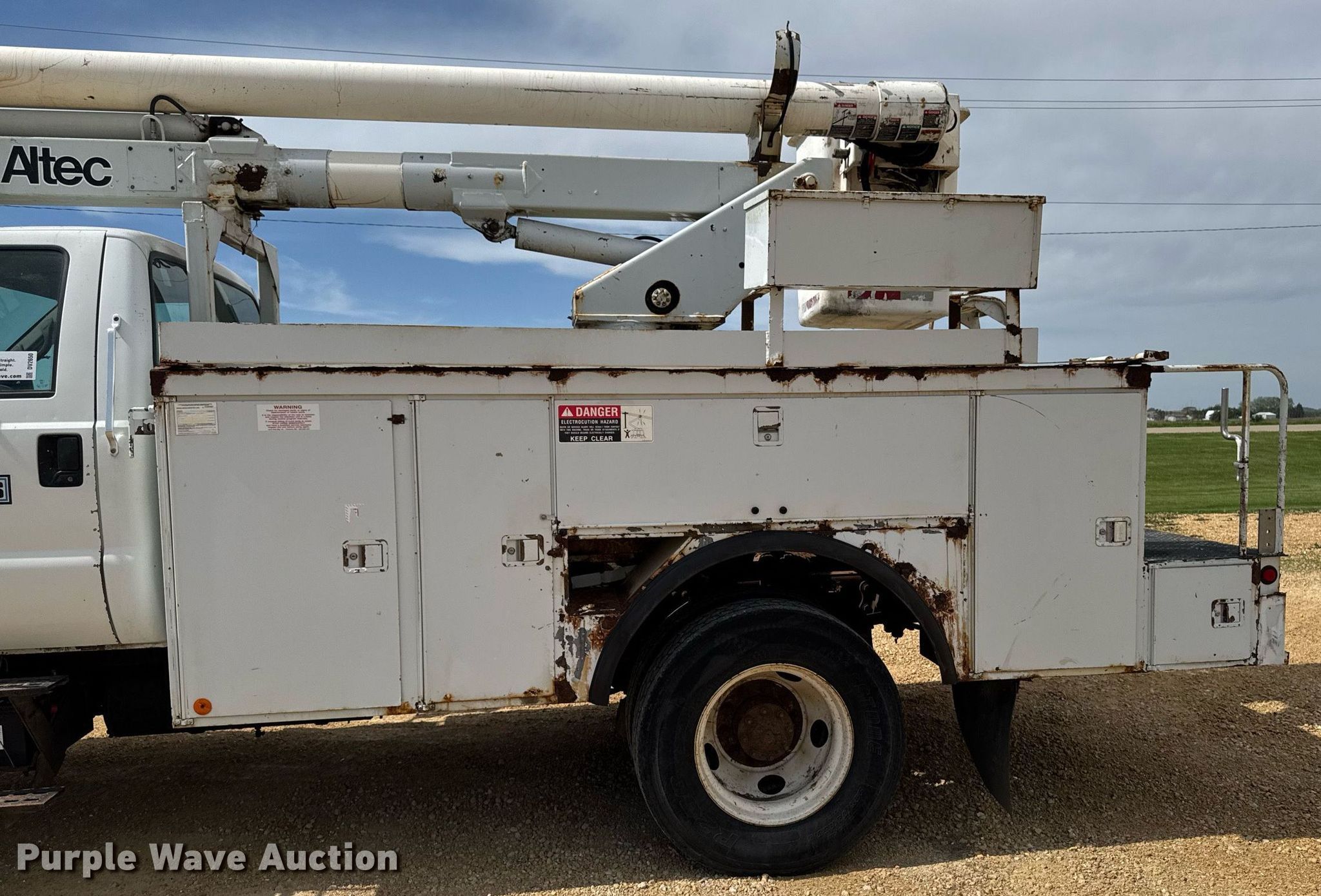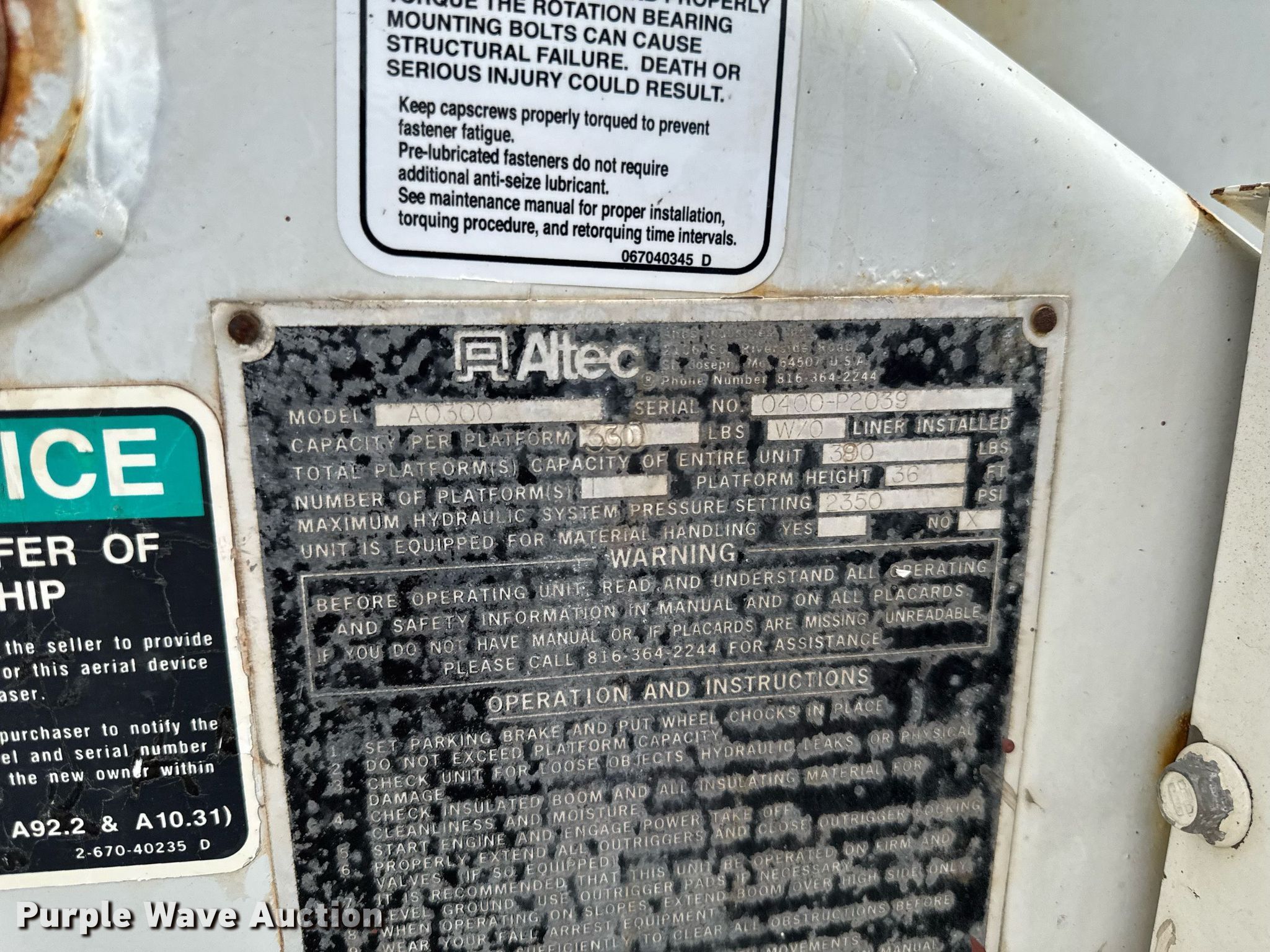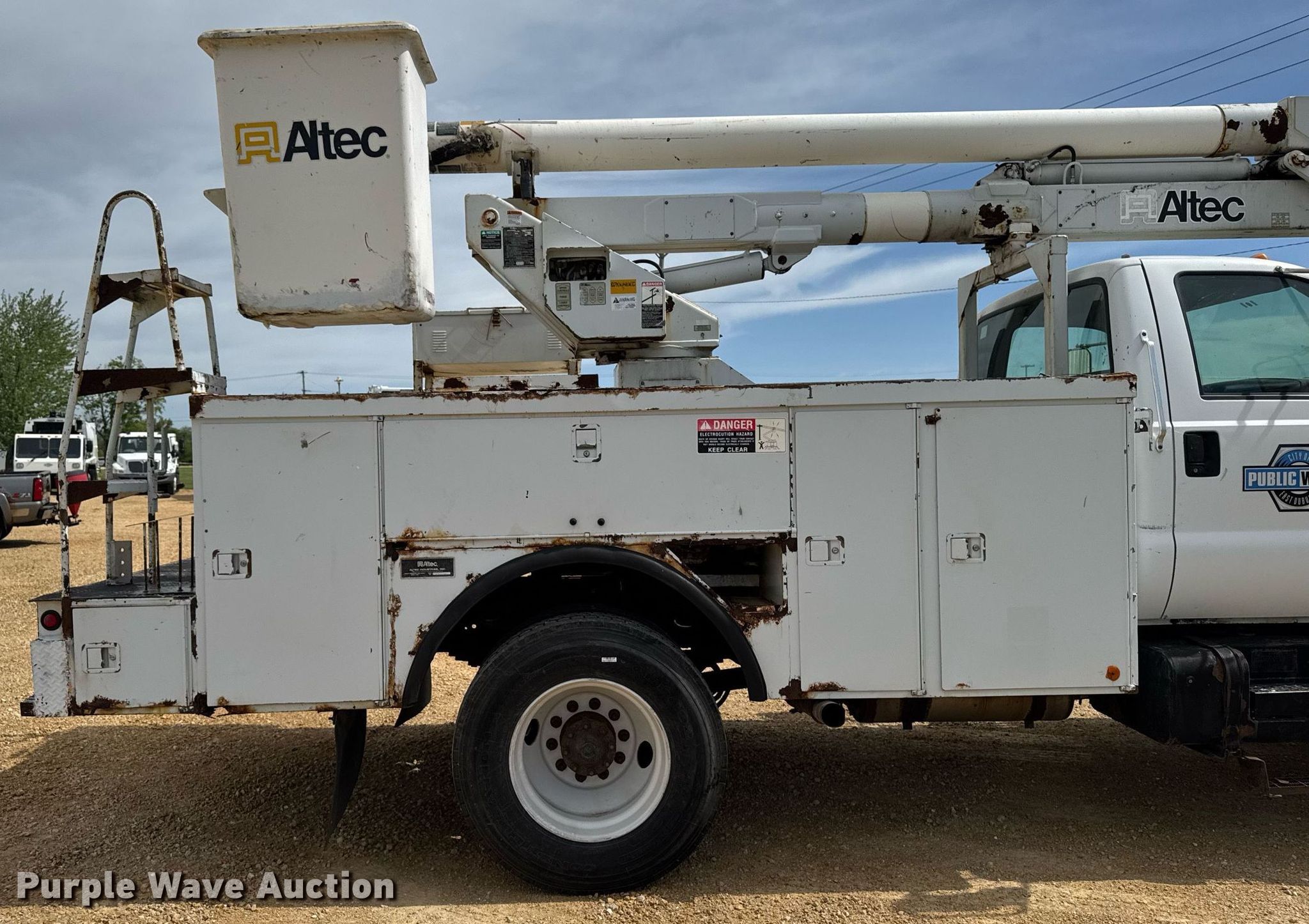 2000 Ford F650 Super Duty bucket truck. Miles: 361,812 on odometer, Hours: 8,620 on meter, VIN: 3FDWF654XYMA44292. Engine Cummins, Displacement: 5.9L, Cylinders: 6, Fuel type: Diesel. Transmission Manual, Speed: 6. Chassis Axles: Single, Suspension: Spring, Brakes: Air, PTO, GVWR: 26,000 lbs. Interior AC, Heat, Auxiliary controls, Brake controller. Features Bed Altec, Serial: 1761041800, 11' 4" L x 94" W, Boom Altec A0300, Serial: 0400-P2039, Mast height: 36', Maximum lift capacity: 330 lbs, Boom type: Articulating, Man basket, Boom controls Ground, Platform/ basket.. Tires Front: 11R22.5, Rear: 295/75R22.5. Notes Utility bed door issues. Iowa title. Title distribution may be delayed up to 30 days from verification of funds. Kilburg Equpment. Sabula, IA 52070