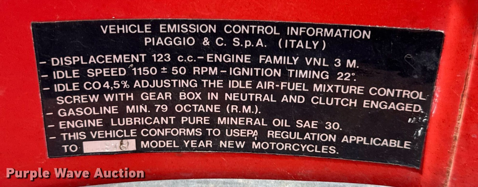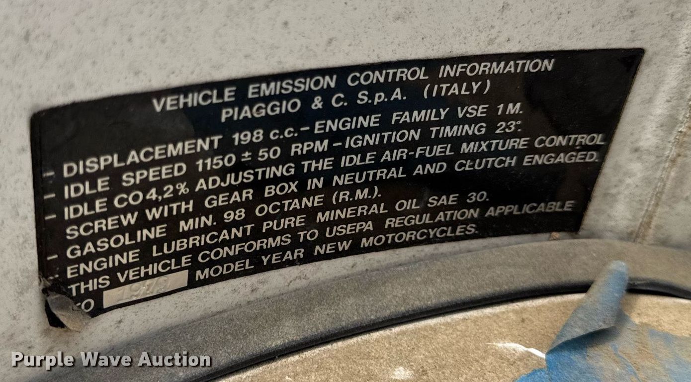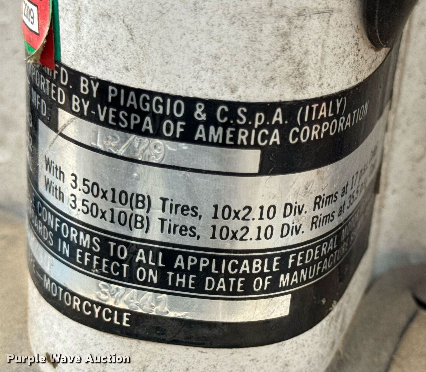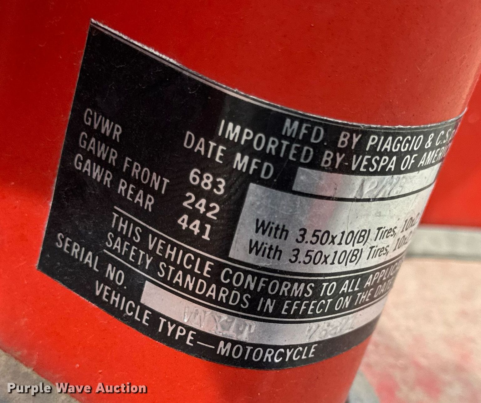 (2) vespa scooters. 1979 Vespa P200E scooter. Miles: 2,694 on odometer, VIN: VSX1T37441. Engine Cylinders: 1, Fuel type: Gas. Transmission Manual. Tires Size: 3.50-10. Notes Dead battery, Flat tire, Non-operational unit. 1979 Vespa P125X Miles: 1,259 on odometer, VIN: VNXT1T76271. Engine Cylinders: 1, Fuel type: Gas. Transmission Manual. Tires Size: 3.50-10. Notes No battery, Non-operational unit. Transfer of ownership documentation will be a bill of sale. Gravois Mills, MO 65037