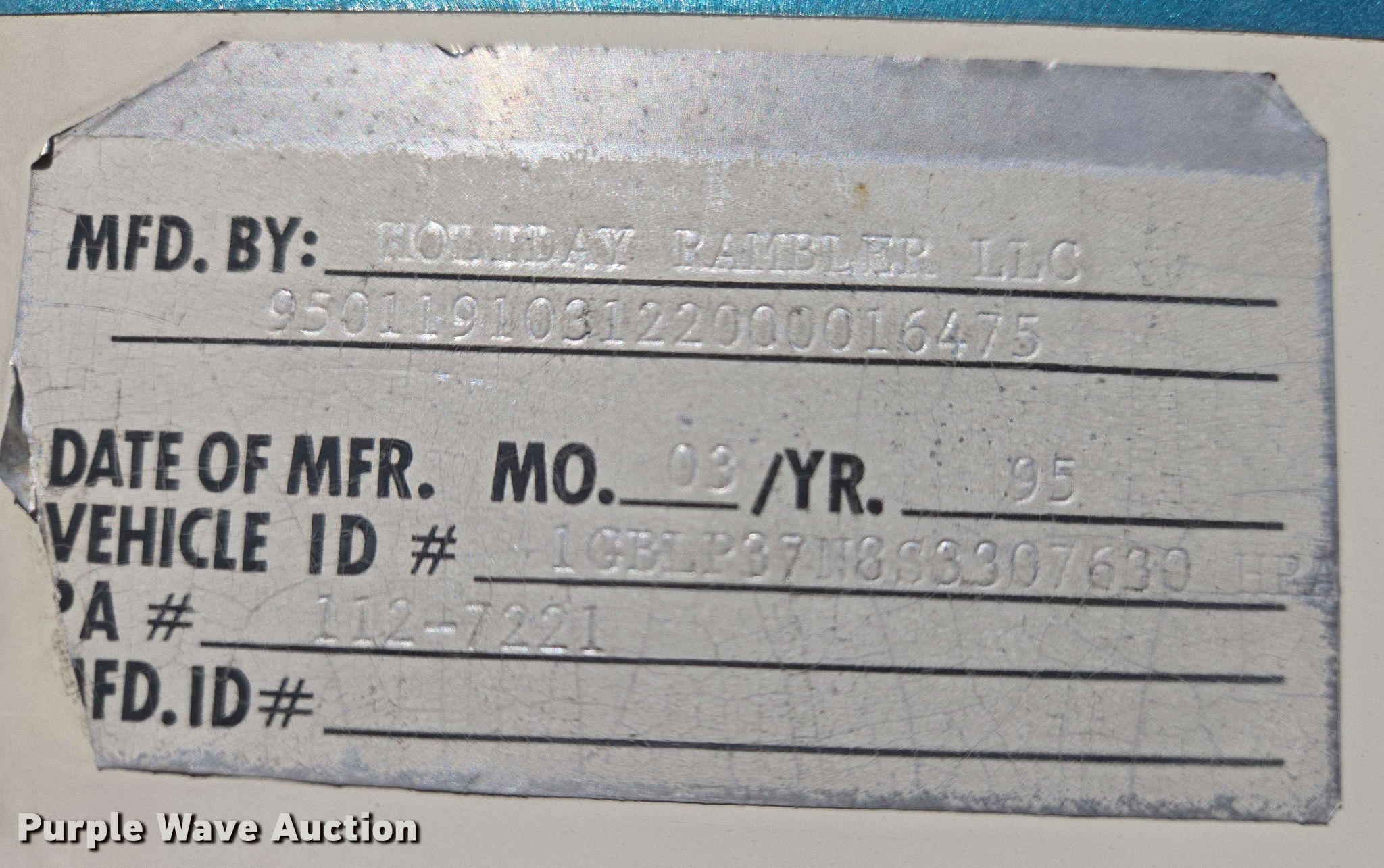 Purple Wave is selling a used RV or Camper in Missouri. This item is a 1995 Holiday Rambler Vacationer RV with the following: Miles: 19,485 on odometer, Camper length: 33', VIN: 1GBLP37N8S3307630