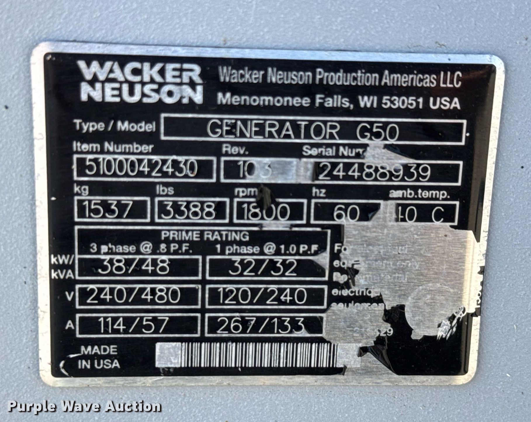 Purple Wave is selling a used Generator Set in Oklahoma. This item is a Wacker Neuson G50 generator with the following: Hours: 2,366 on meter, Serial: 24488939