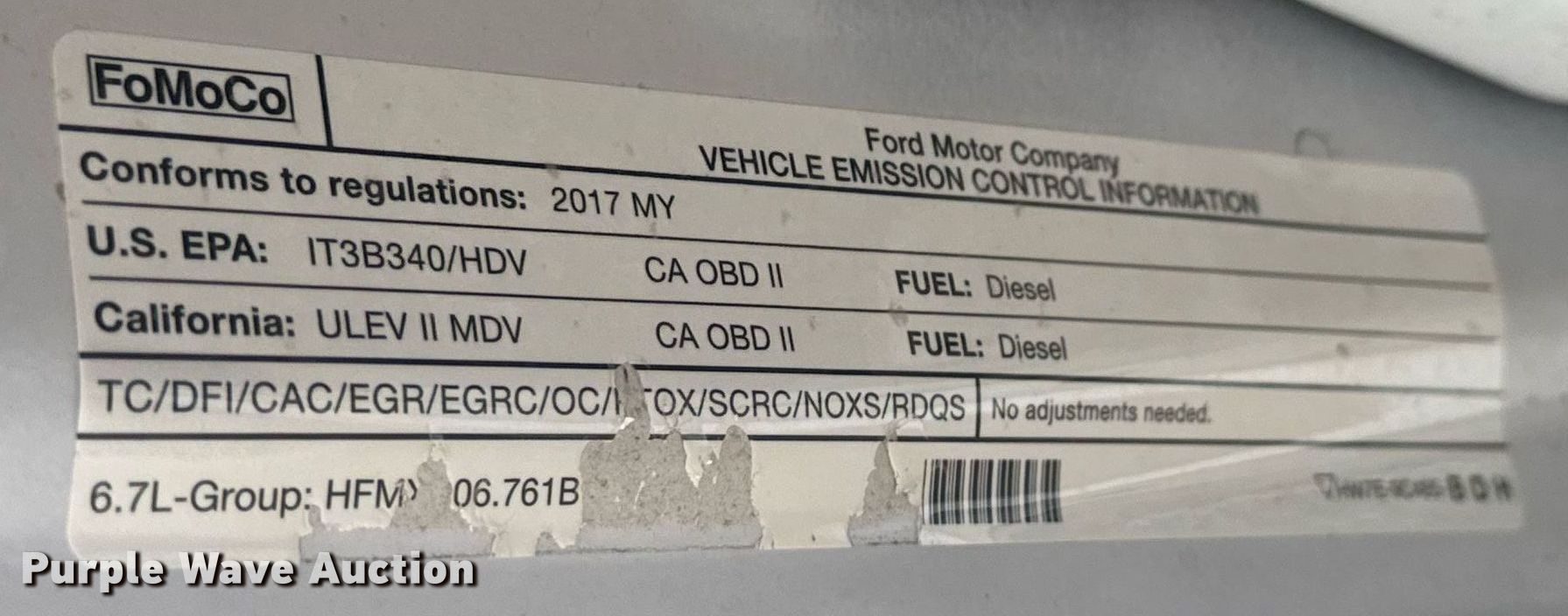 2017 Ford F250 Super Duty XL Crew Cab utility bed pickup truck. Miles: 134,295 on odometer, Hours: 3,479 on meter, VIN: 1FT7W2BT6HEC96821. Engine Displacement: 6.7L V8 OHV, Cylinders: 8, Fuel type: Diesel. Transmission Automatic, Four wheel drive. Interior AC, Heat, Heated mirrors, Power windows, Power locks, Cruise control, Auxiliary controls, Brake controller. Features Utility bed RKI J5680, 8' 1" L x 81" W, Hitch: Gooseneck. Tires Size: 35x12.50R20. Notes Windshield chipped or cracked. Kansas title. Title distribution may be delayed up to 14 days from verification of funds. TL Steel LLC. Burrton, KS 67020