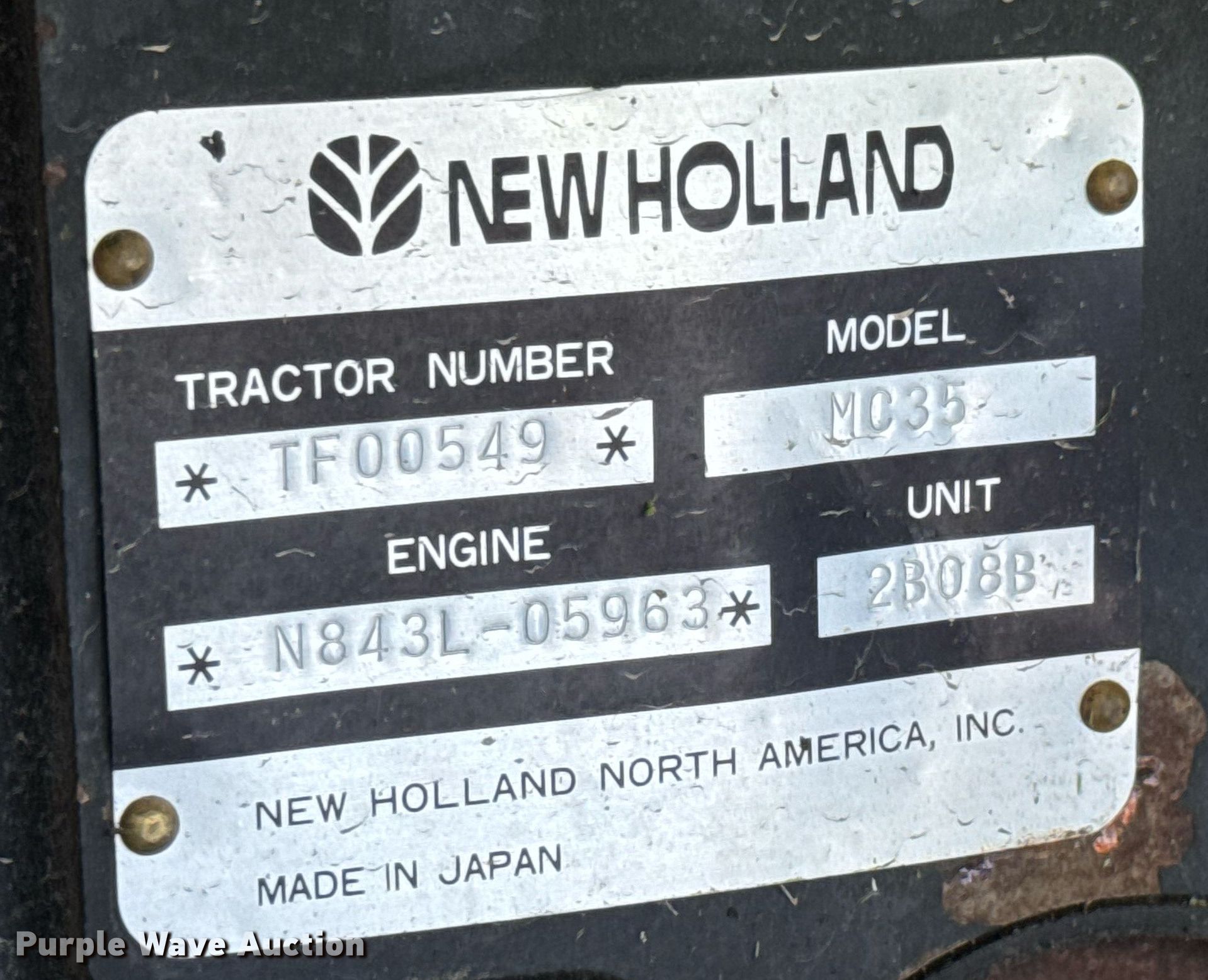 2002 New Holland MC35 lawn mower. Hours: 2,610 on meter, Cutting width: 84", Serial: TF00549. Engine New Holland 2B08B, Serial: N843L-05963, Cylinders: 3, Fuel type: Diesel. Transmission Hydrostatic, Speed: 2. Chassis Four wheel drive. Operators station OROPS. Features Hydraulic remote sets Front: 1, Counter weights, Hydraulic front deck lift. Tires Front: 24x13.00B12, Rear: 20x8.00-10. Sedgwick, KS 67135