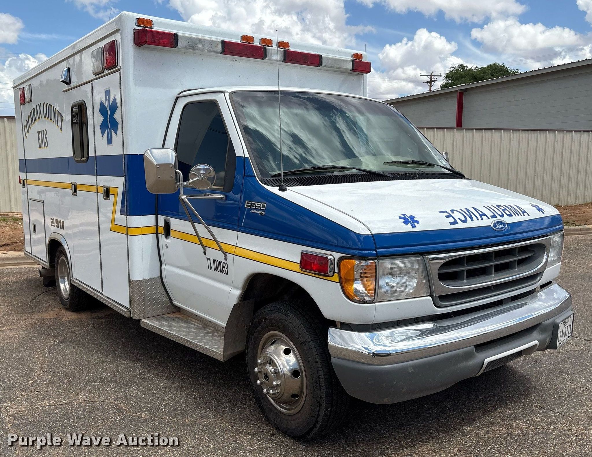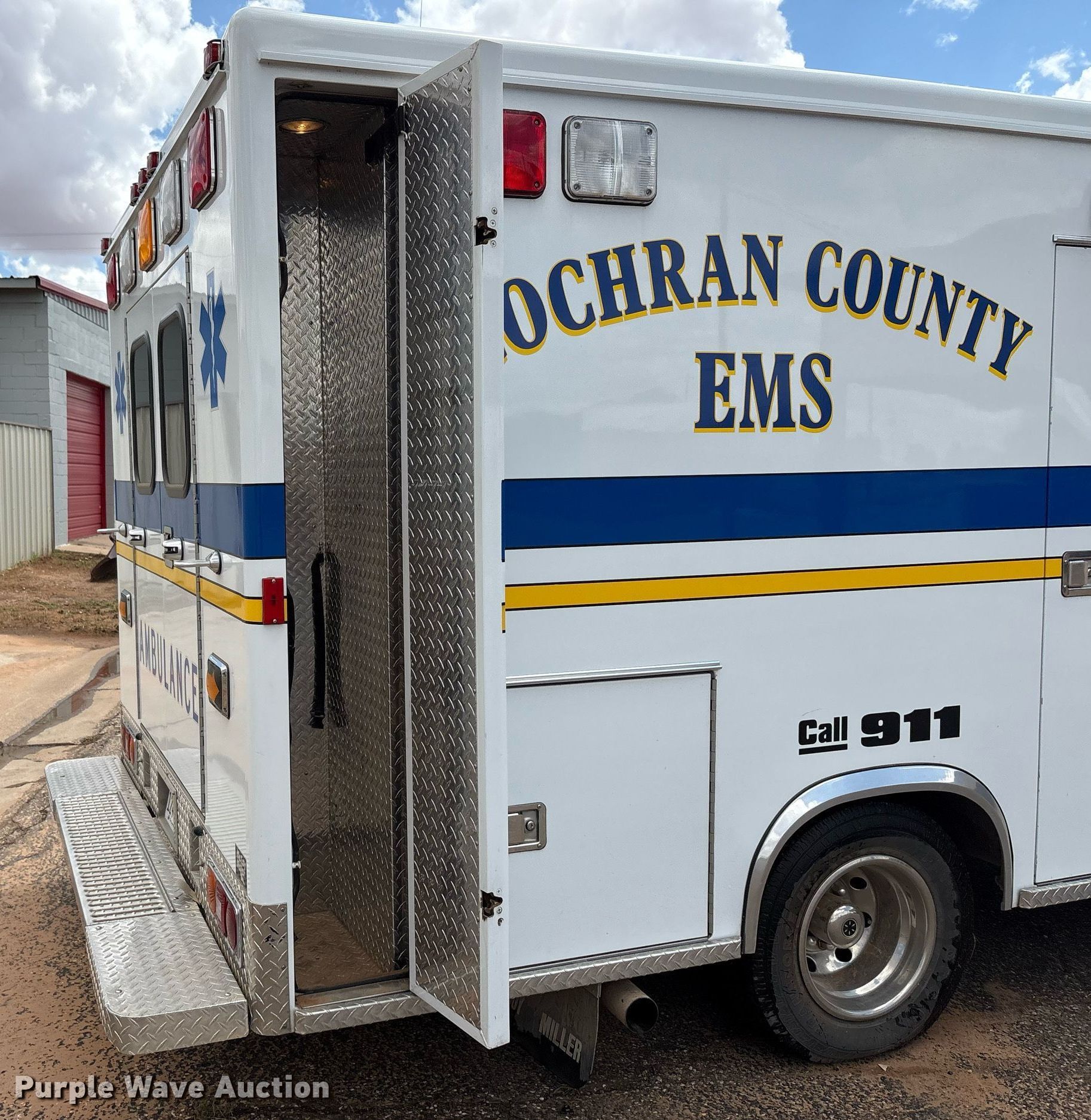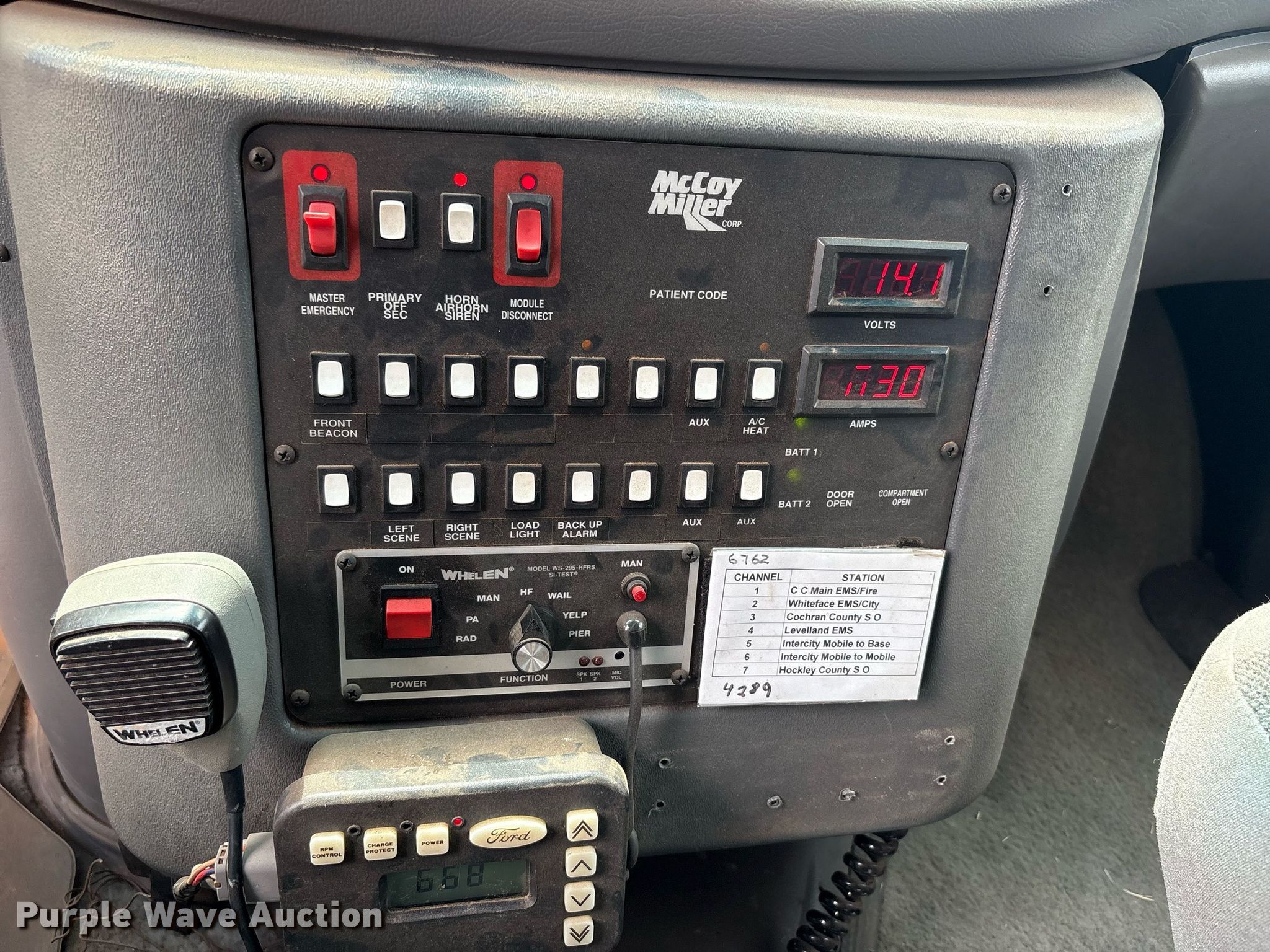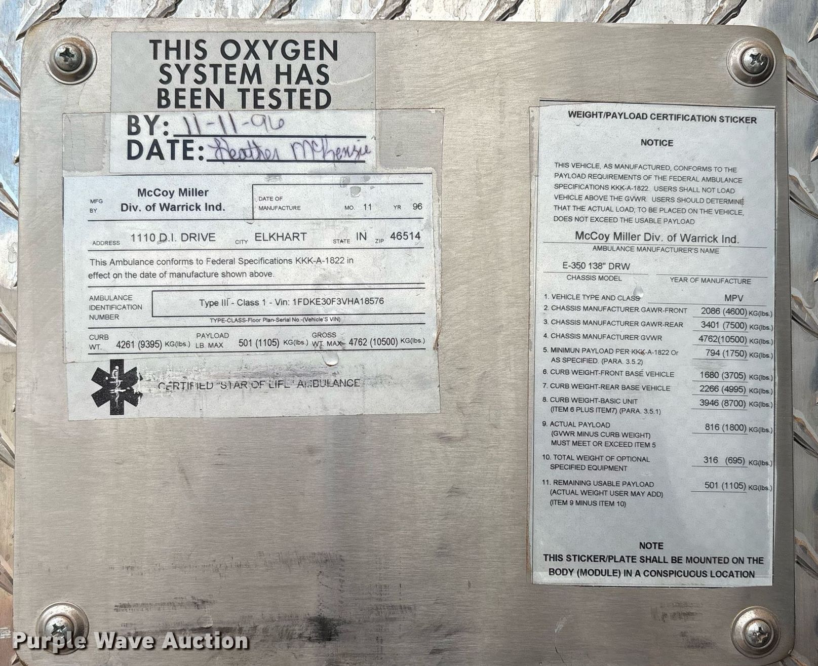 1997 Ford E350 ambulance. Miles: 41,285 on odometer, VIN: 1FDKE30F3VHA18576. Engine Displacement: 7.3L, Cylinders: 8, Fuel type: Diesel. Transmission Automatic. Chassis Axles: Single, Suspension: Spring, Brakes: Hydraulic, GVWR: 10,500 lbs, Wheelbase: 138". Interior AC, Heat, Power windows, Power locks, Cruise control. Features Ambulance body McCoy Miller, PA/ siren controls, Oxygen hookups. Tires Size: 225/75R16. Notes Dead battery. Texas title. Title distribution may be delayed up to 14 days from verification of funds. Morton, TX 79346