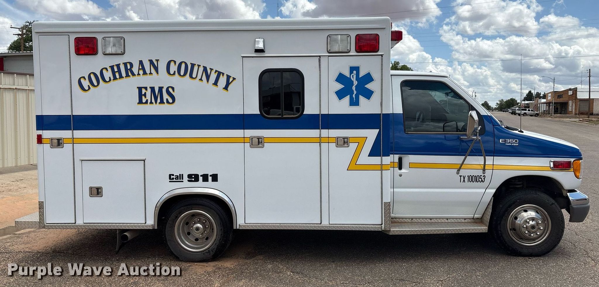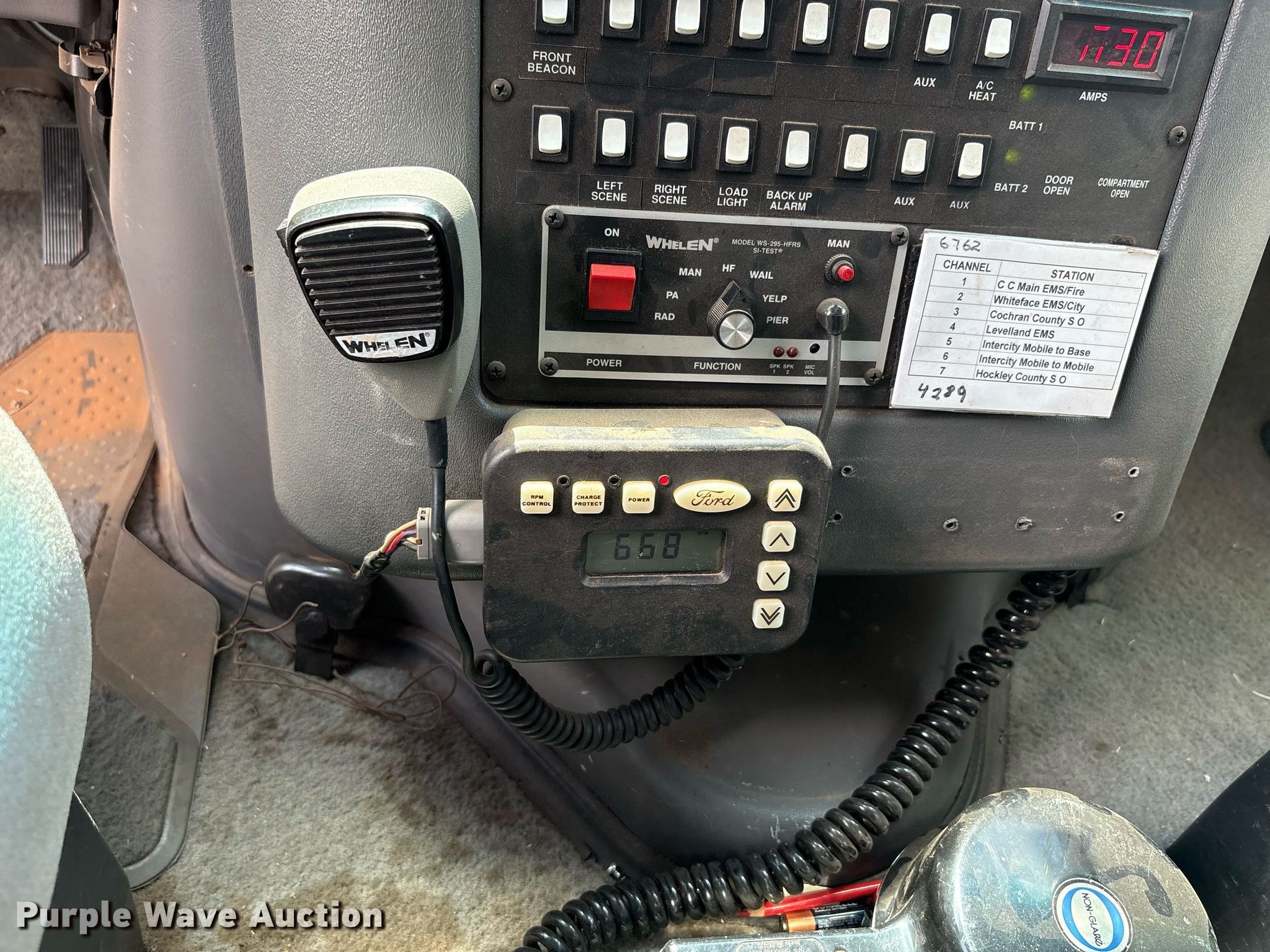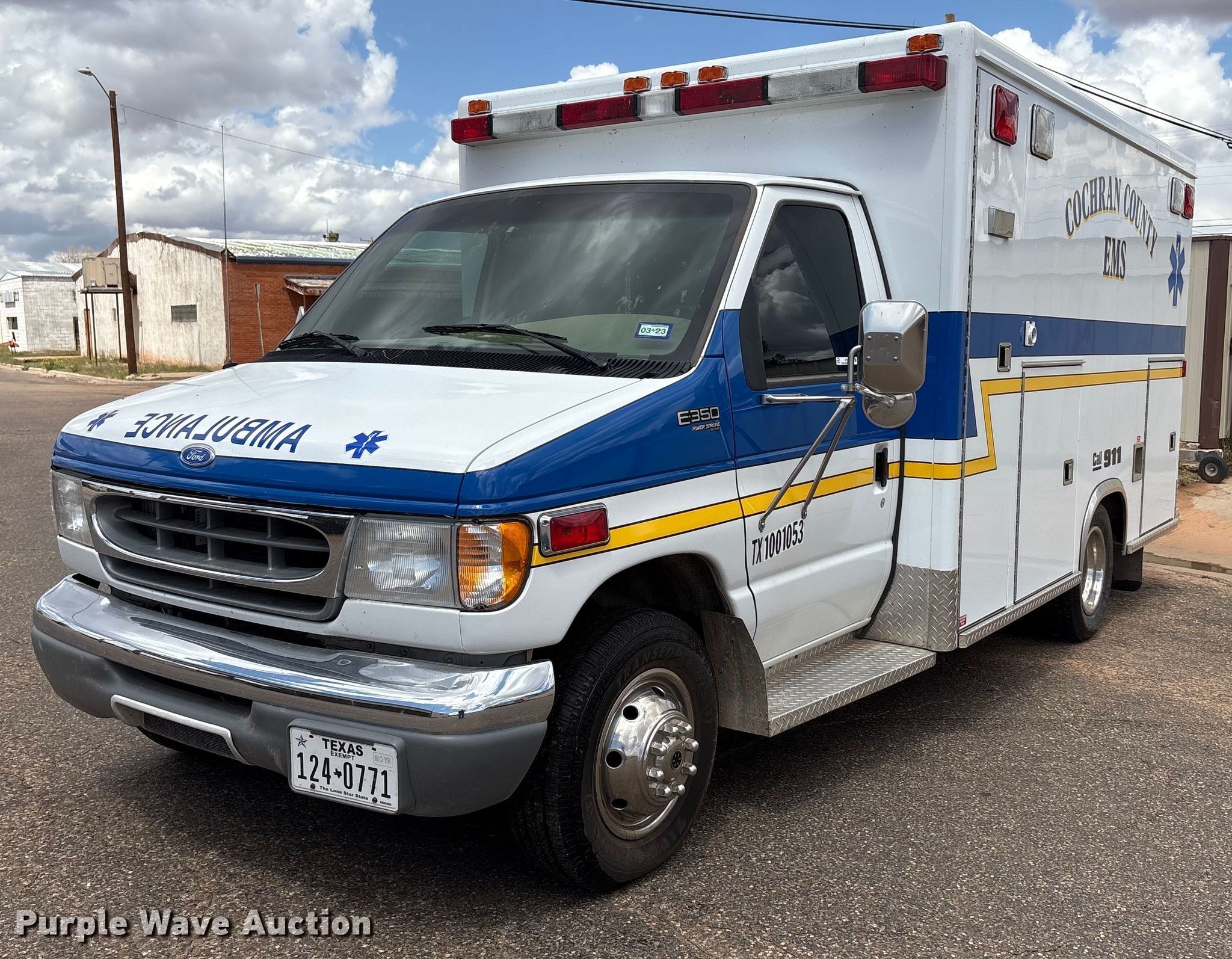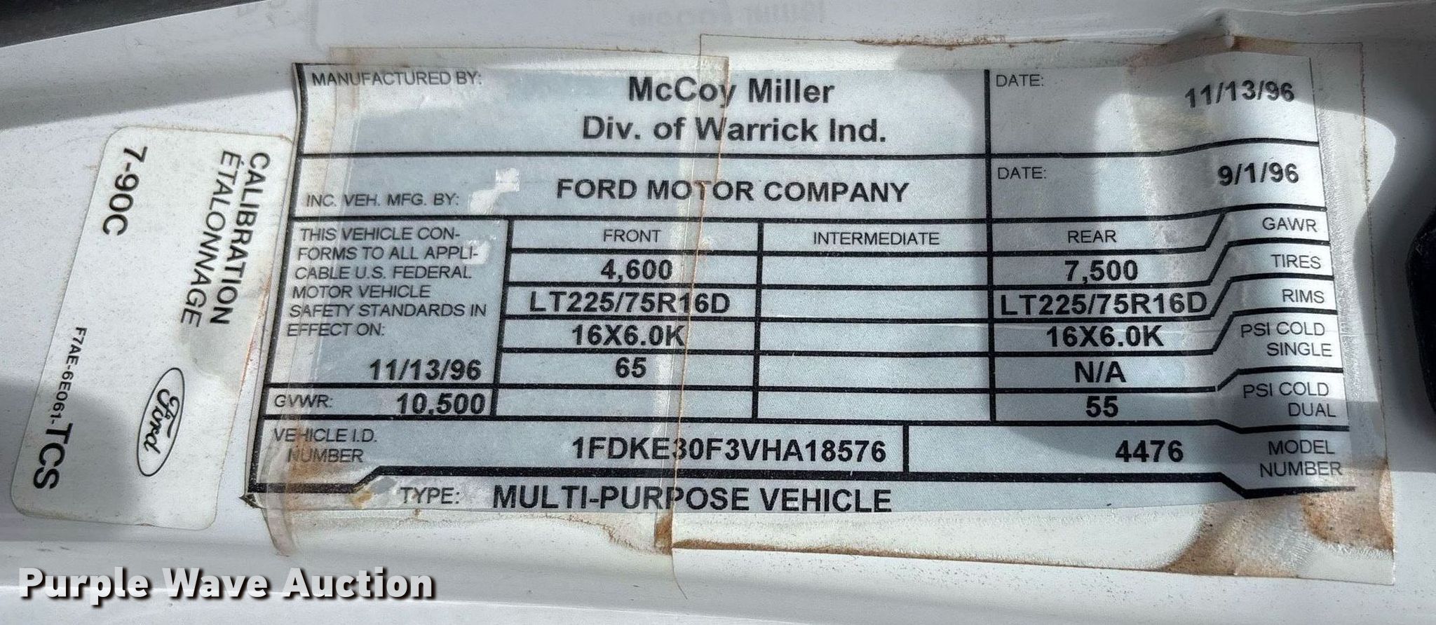 1997 Ford E350 ambulance. Miles: 41,285 on odometer, VIN: 1FDKE30F3VHA18576. Engine Displacement: 7.3L, Cylinders: 8, Fuel type: Diesel. Transmission Automatic. Chassis Axles: Single, Suspension: Spring, Brakes: Hydraulic, GVWR: 10,500 lbs, Wheelbase: 138". Interior AC, Heat, Power windows, Power locks, Cruise control. Features Ambulance body McCoy Miller, PA/ siren controls, Oxygen hookups. Tires Size: 225/75R16. Notes Dead battery. Texas title. Title distribution may be delayed up to 14 days from verification of funds. Morton, TX 79346