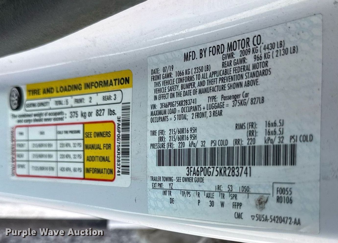 Purple Wave is selling a used Passenger Vehicle in Kansas. This item is a 2019 Ford Fusion with the following: Miles: 65,896 on odometer, VIN: 3FA6P0G75KR283741