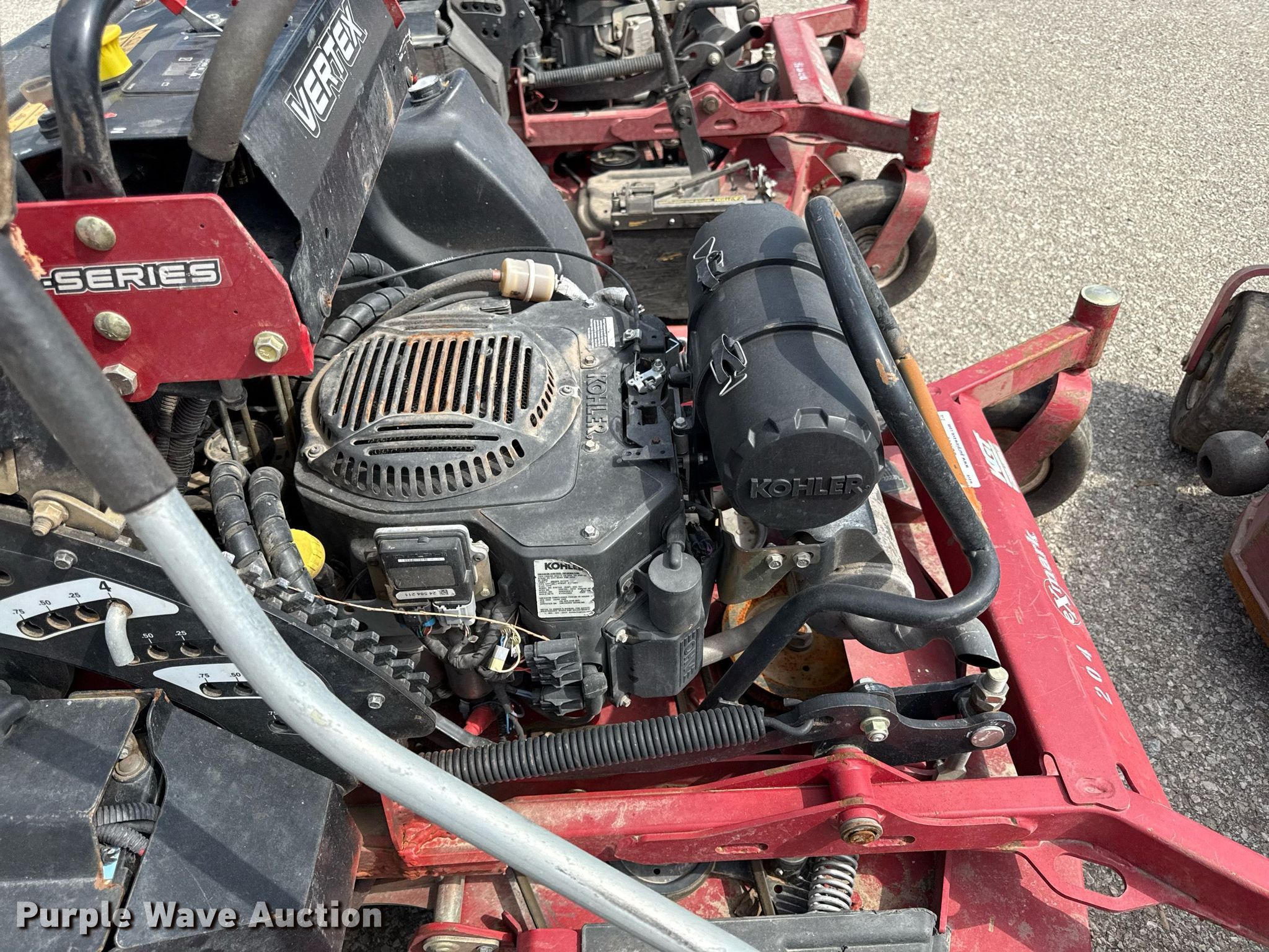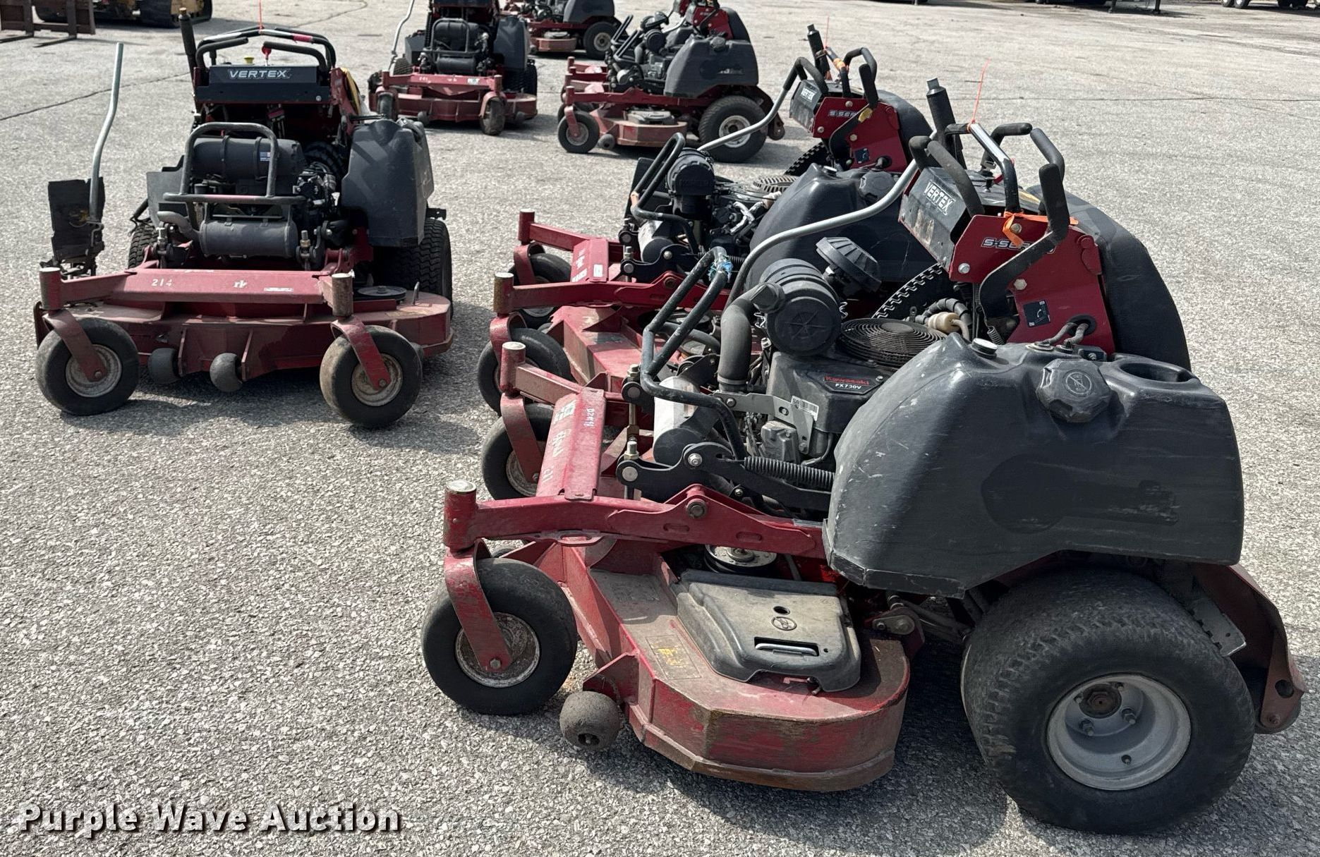 (3) Exmark ZTR lawn mowers. Exmark Vertex. Hours: 204 on meter, Cutting width: 60". Engine Kohler, Fuel type: Gas. Transmission Hydrostatic. Tires Front: 11x4.00-4, Rear: 20x10.00-8. Exmark Vertex Hours: 237 on meter, Cutting width: 52". Engine Kawasaki FX730V, Fuel type: Gas. Transmission Hydrostatic. Tires Front: 11-4.00-4, Rear: 20x10.00-8. Exmark Vertex Notes Parts only, Parts missing, Non-operational unit. Signature Landscape. Edwardsville, KS 66111