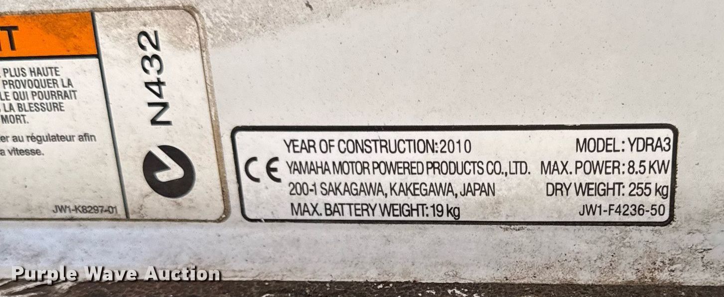 2010 Yamaha YDRAX golf cart. Serial: JR6-266949. Engine Cylinders: 1, Fuel type: Gas, Electric start. Transmission Automatic. Operators station Canopy. Tires Size: 13x8.50-8. Notes Unknown operating condition. Bonner Springs, KS 66012