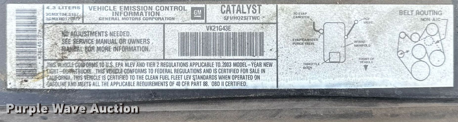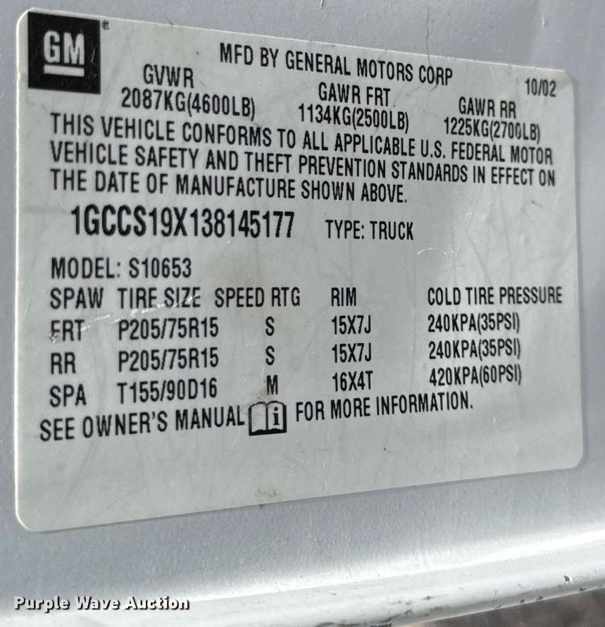 Purple Wave is selling a used Compact Pickup or Van in Kansas. This item is a 2003 Chevrolet S10 Ext. Cab pickup truck with the following: VIN: 1GCCS19X138145177