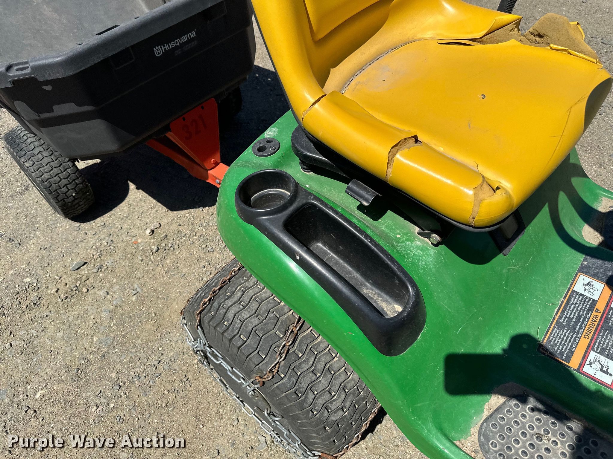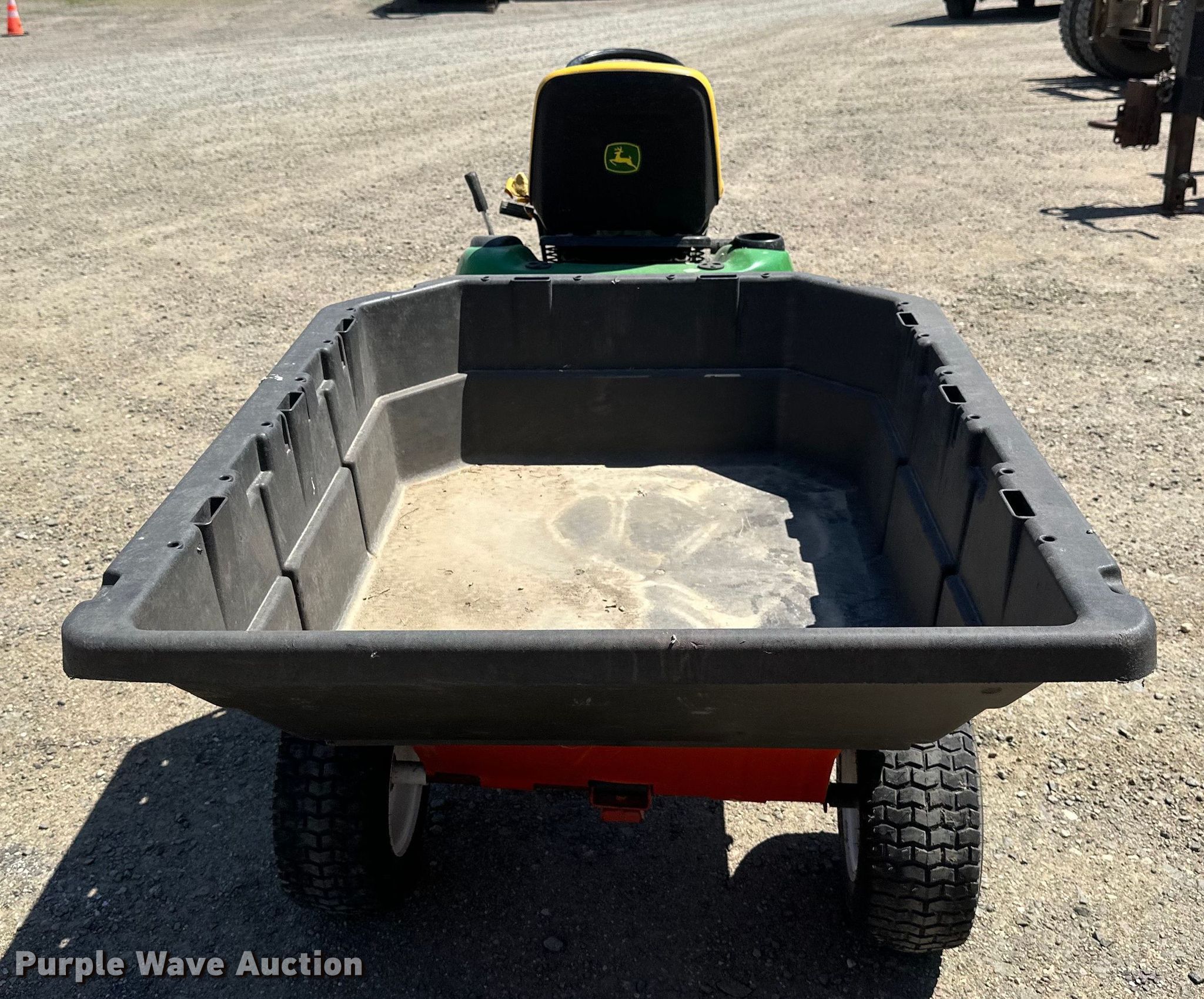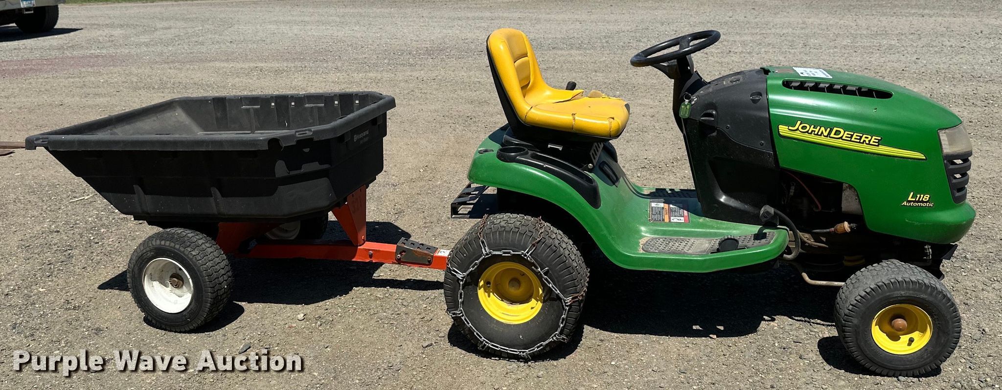 John Deere L118 lawn mower. Hours: 932 on meter. Engine Briggs and Stratton Twin V, Cylinders: 2, Fuel type: Diesel, HP: 22. Transmission Hydrostatic. Features Husqvarna lawn cart, Approximate dimensions: 3' x 4'. Tires Front: 15x6.00-6, Rear: 20x10.00-8, Cart tires: 16x6.5-8. Christensen Family Farms. Sleepy Eye, MN 56085