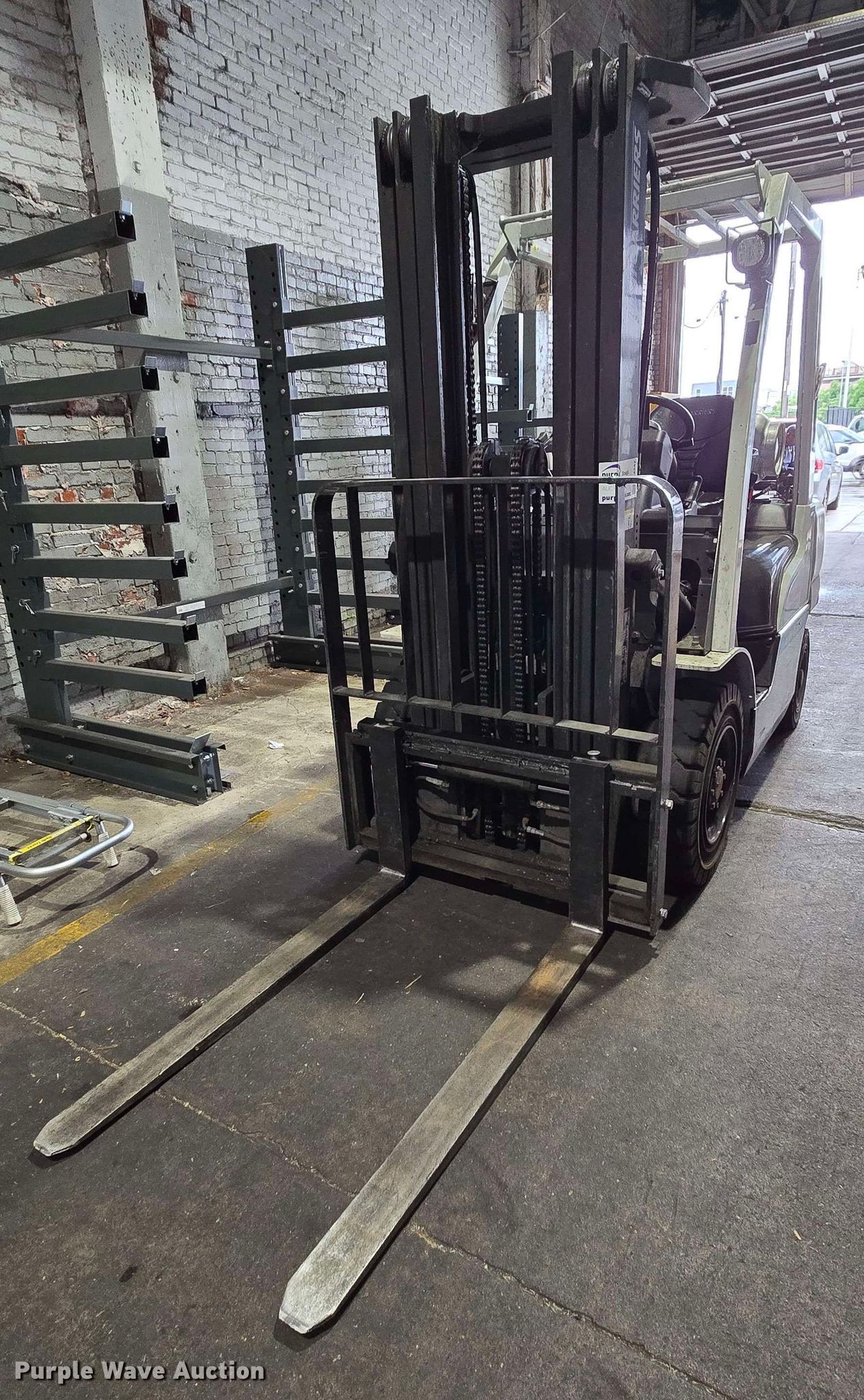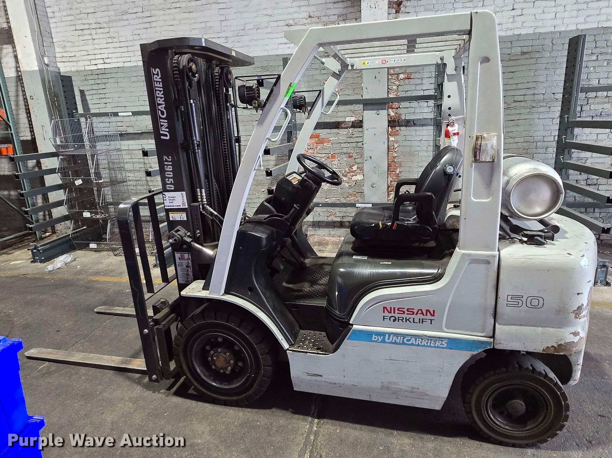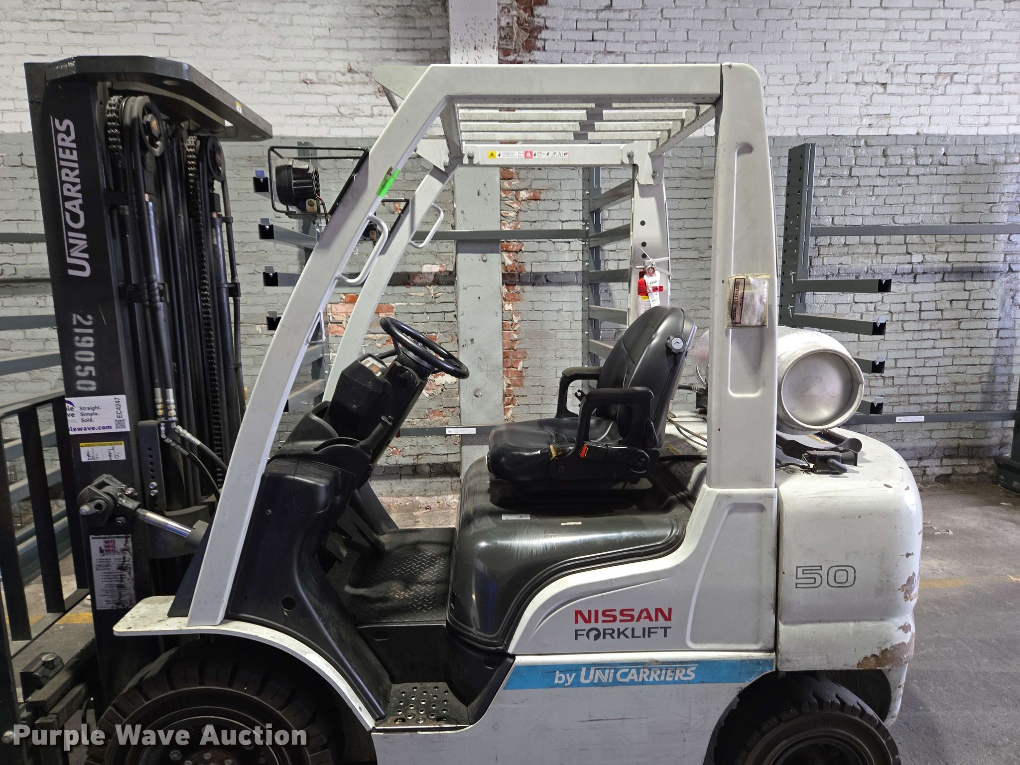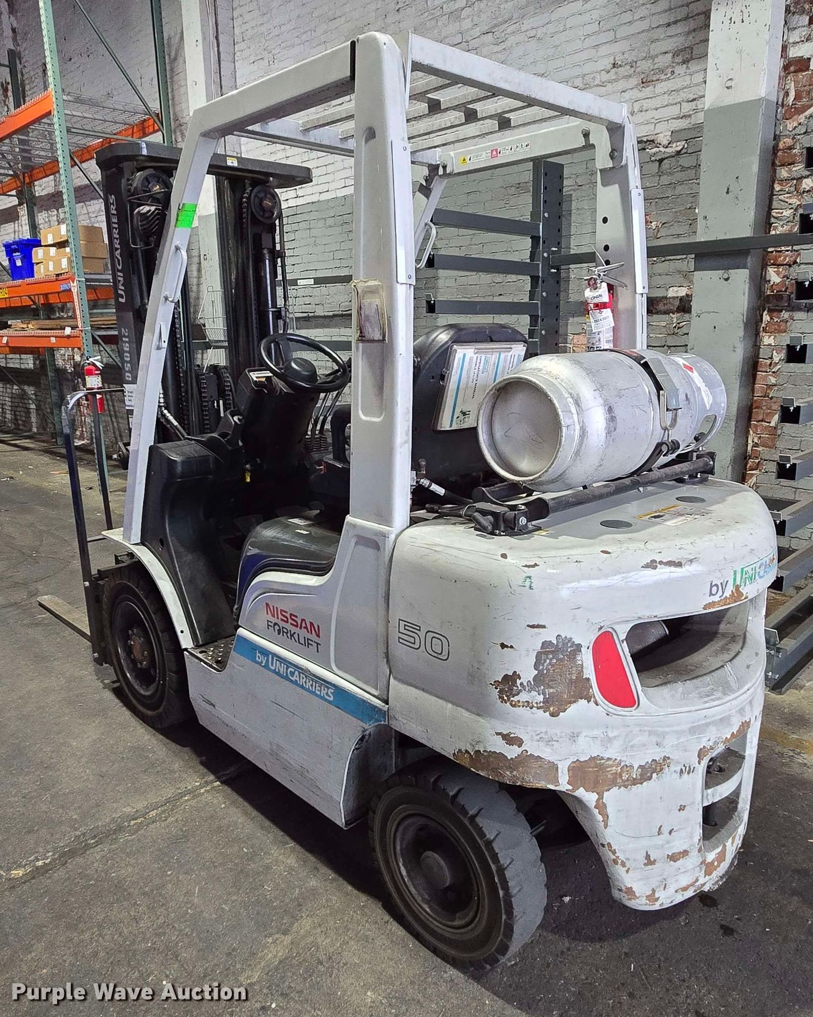 Purple Wave is selling a used Cushion Tire or Pneumatic Forklift in Pennsylvania. This item is a 2014 Nissan PF50 forklift with the following: Hours: 1,100 on meter, Serial: P1F2-9H8200, Unit #: SFS2063