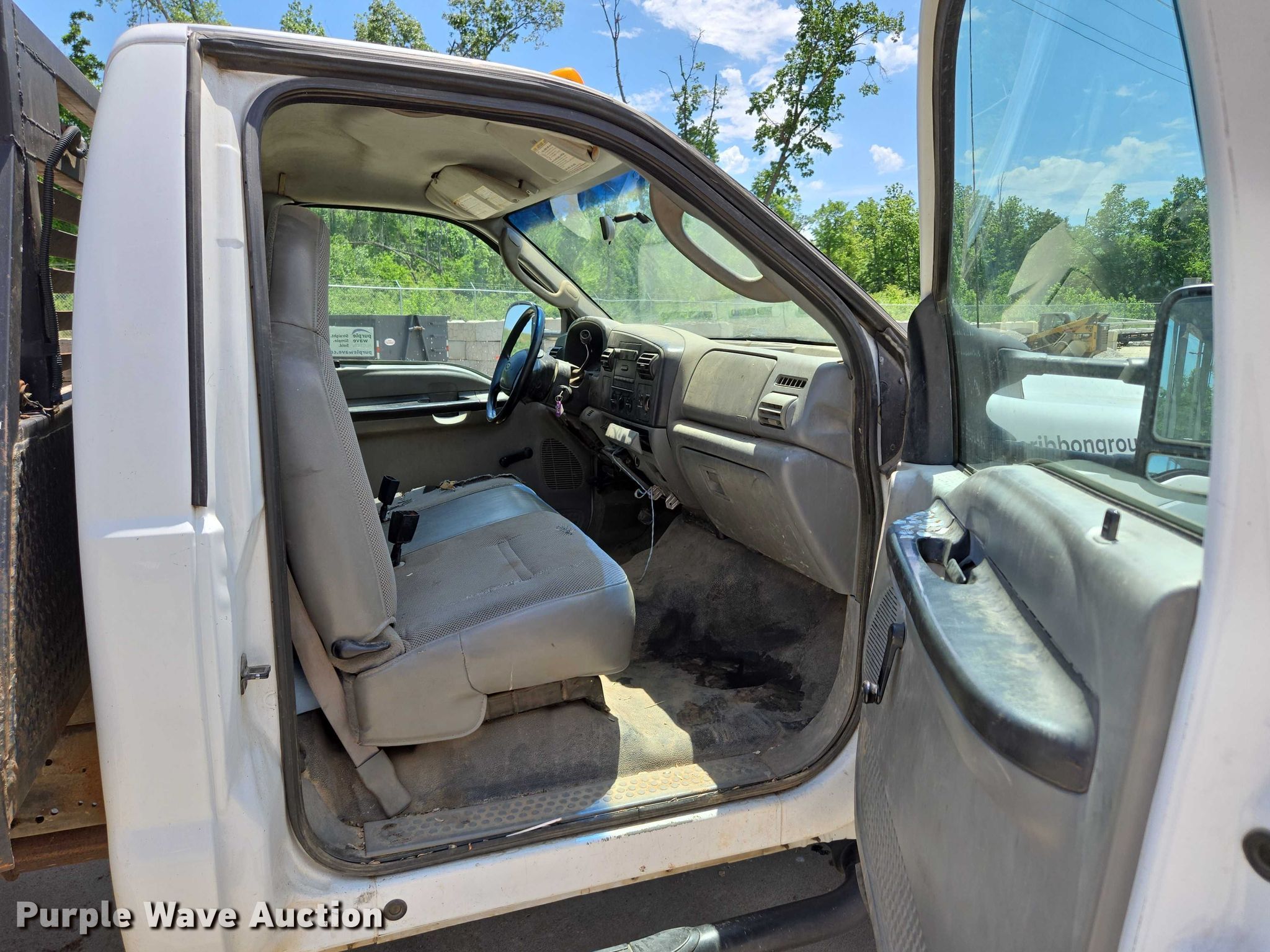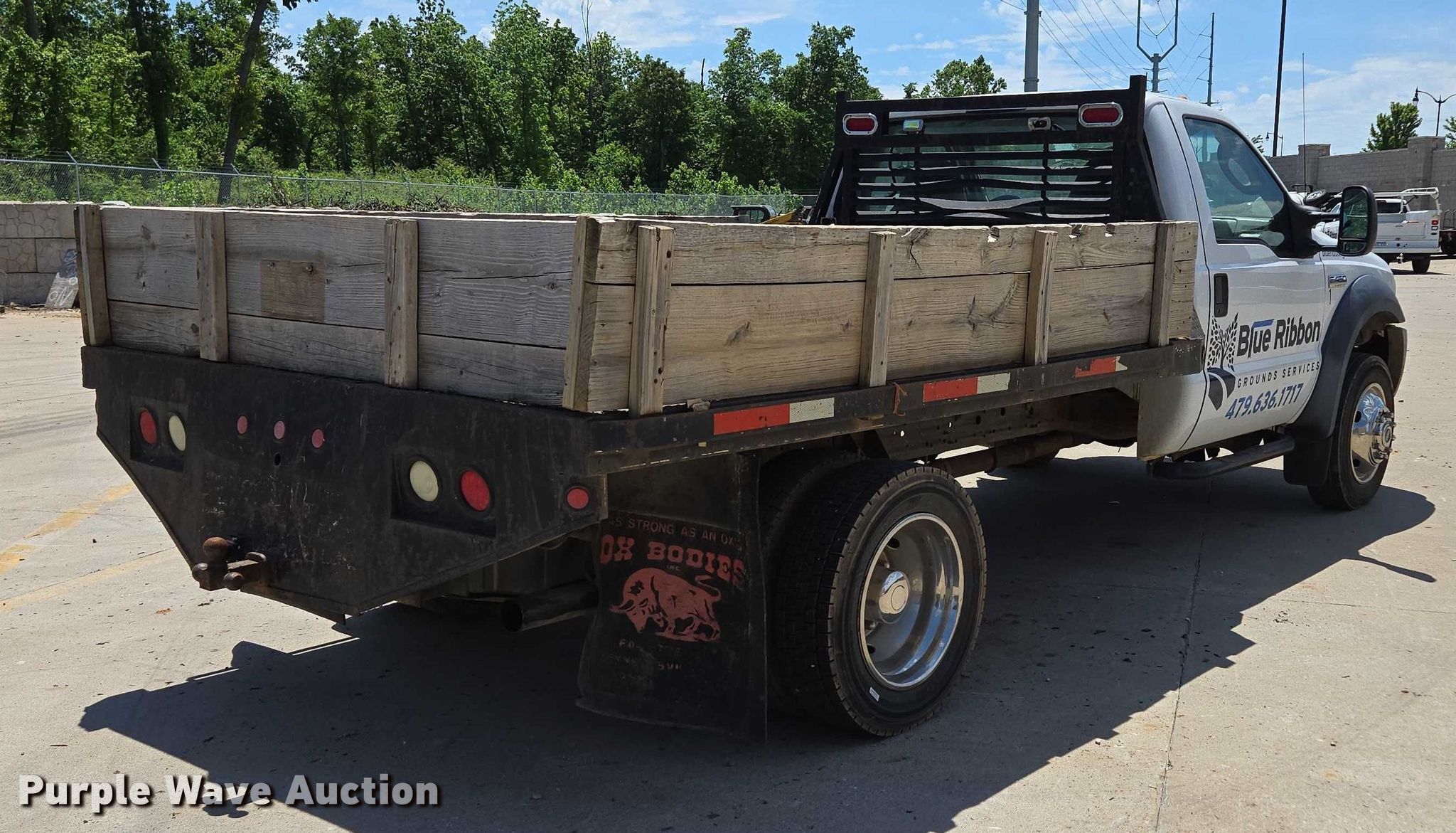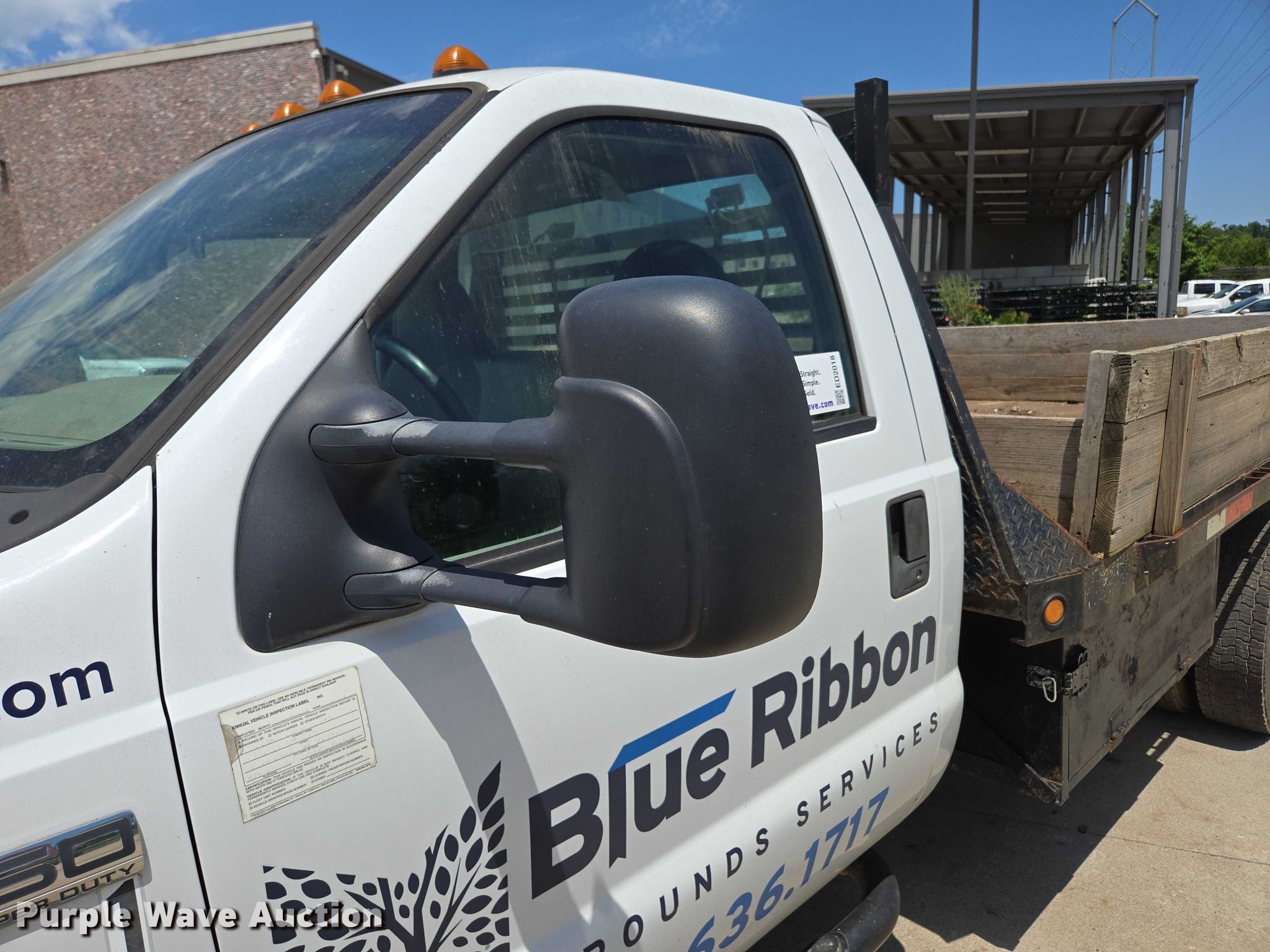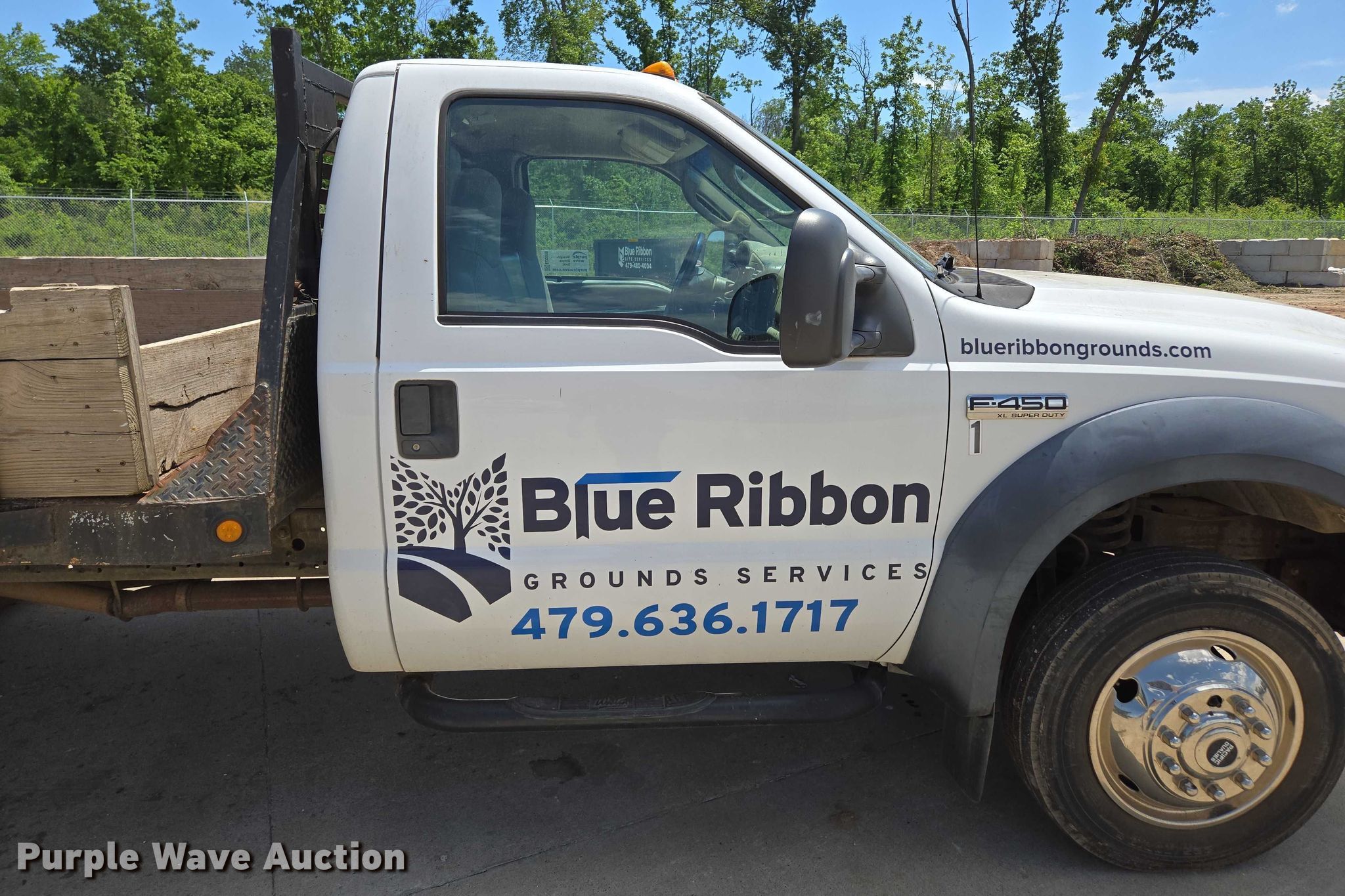 2006 Ford F450 Super Duty flatbed pickup truck. Miles: 161,415 on odometer, Hours: 5,594 on meter, VIN: 1FDXF46P66EB28923, Unit #: 1. Engine Displacement: 6.0L V8 OHV, Cylinders: 8, Fuel type: Diesel, HP: 325. Transmission Automatic. Chassis Axles: Single, Suspension: Spring, Brakes: Hydraulic, GVWR: 16,000 lbs. Interior AC, Heat, Auxiliary controls, Brake controller. Features Flatbed 10' 11.5" L x 96" W, Removable sides. Tires Size: 225/70R19.5. Notes Dash warning indicator: ABS, Dead battery, Oil Leak, Possible AC issues, may need charged. Arkansas title. Title distribution may be delayed up to 14 days from verification of funds. Blue Ribbon Outdoors. Rogers, AR 72758