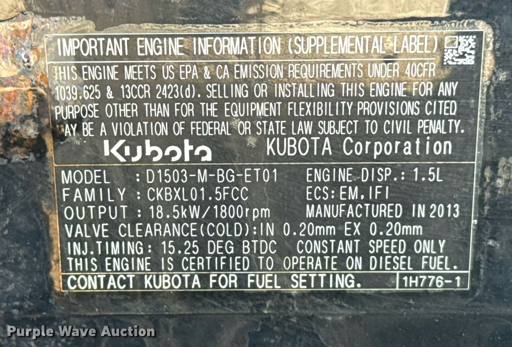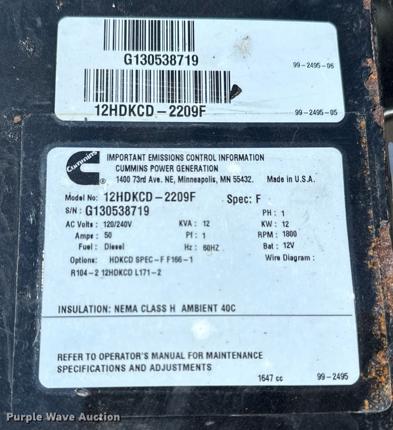 Cummins Onan Commercial QD generator. Hours: 517 on meter, Serial: G130538719. Engine Kubota, Displacement: 1.5L, Fuel type: Diesel. Features Generator Cummins, kVA: 12, kW: 12, Phase: Single, Electric start. Collinsville, OK 74021
