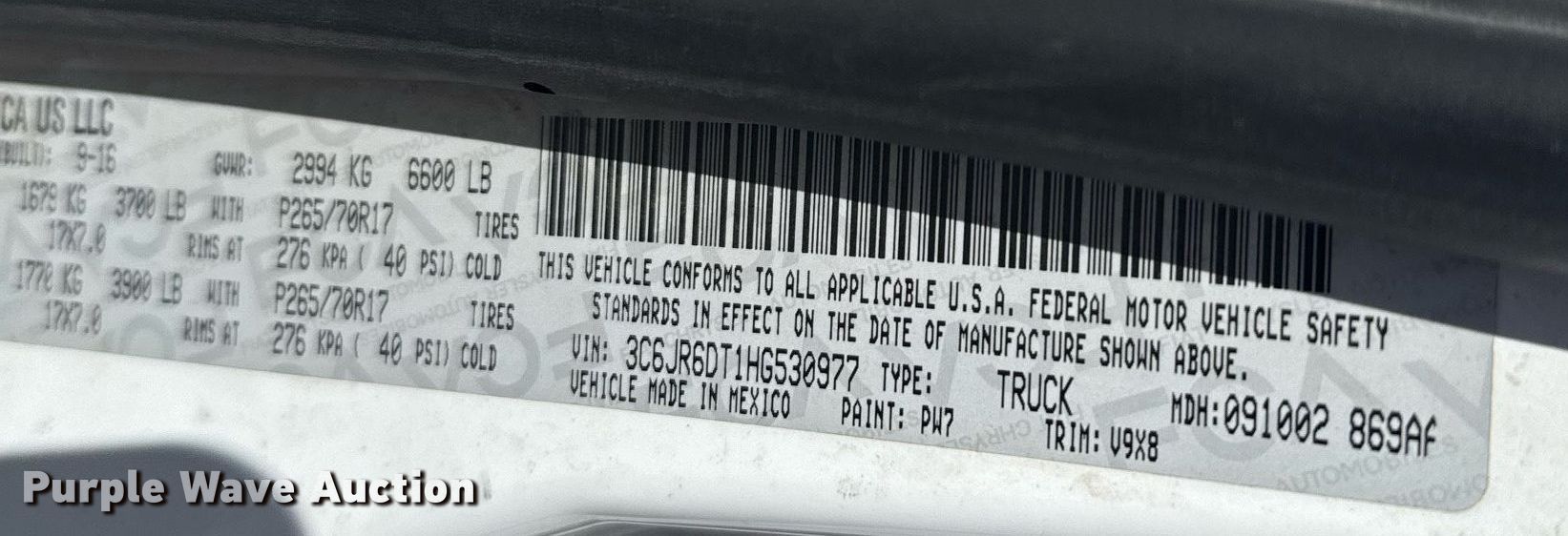 2017 Dodge Ram 1500 pickup truck. Miles: 140,995 on odometer, VIN: 3C6JR6DT1HG530977. Engine Displacement: 5.7L V8 OHV, Cylinders: 8, Fuel type: Gas. Transmission Automatic. Interior AC, Heat, Power windows, Power locks, Cruise control. Tires Size: 265/75R17. Notes Windshield chipped or cracked, Hail damage, Dead battery. Kansas title. Title distribution may be delayed up to 14 days from verification of funds. Colby, KS 67701