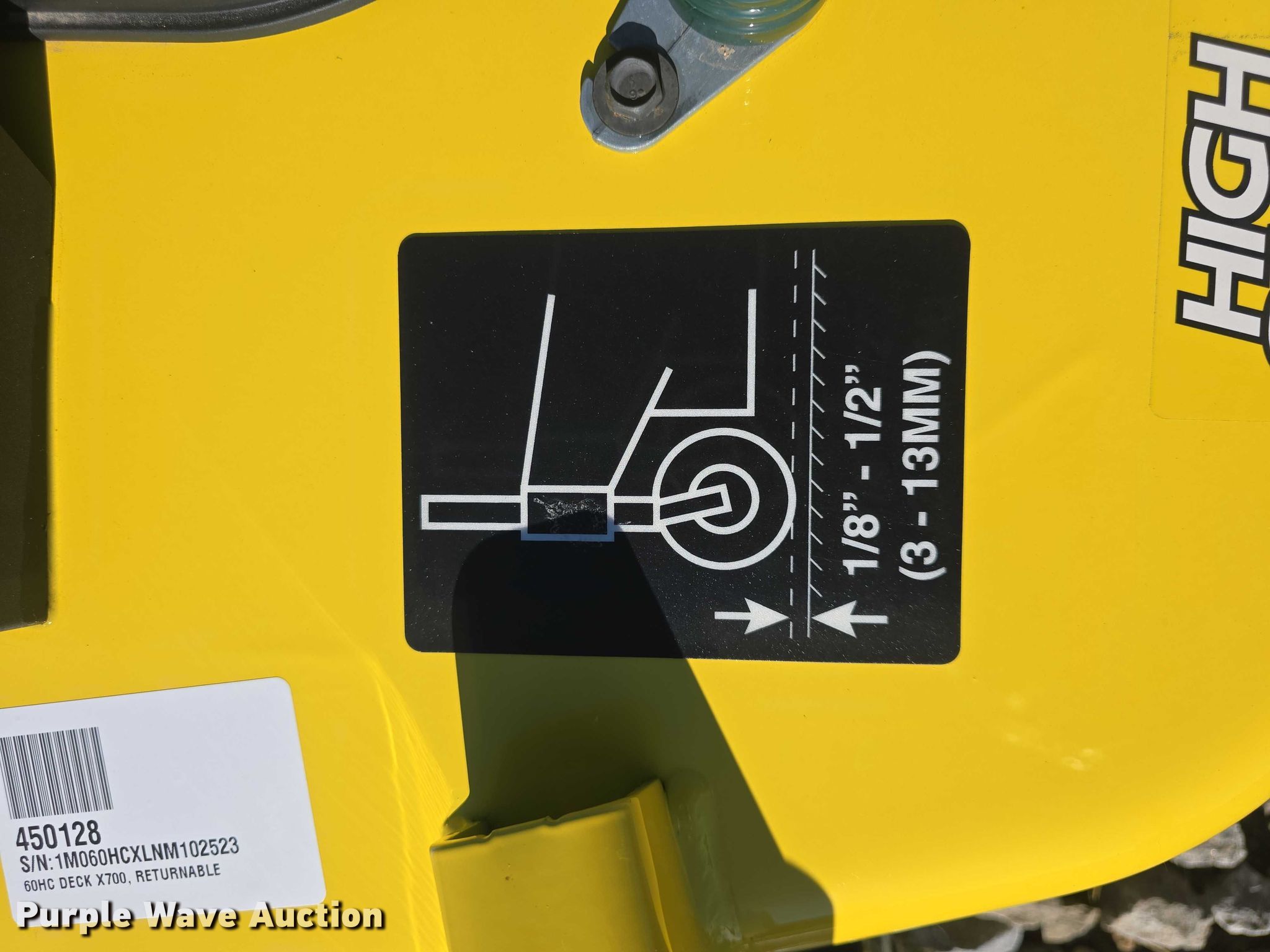 2022 John Deere 60HC mower deck. Serial: 1M060HCXLNM102523, Unit #: 450128, Width: 60". Notes Fits John Deere X700, Unused. PrairieLand Partners. Emporia, KS 66801