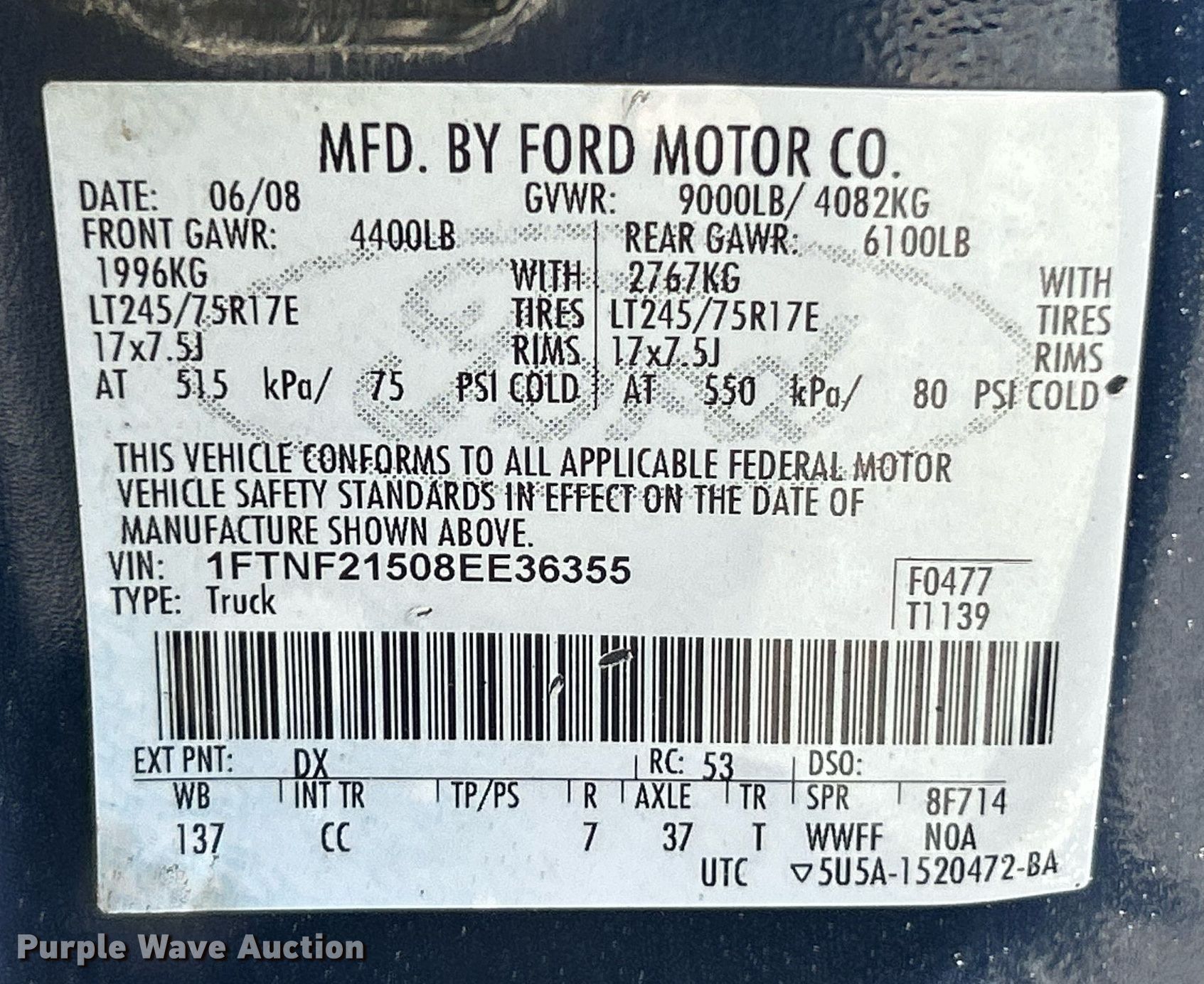 Purple Wave is selling a used 3/4 or 1 Ton Pickup or Van in Missouri. This item is a 2008 Ford F250 Super Duty XL pickup truck with the following: Miles: 137,883 on odometer, VIN: 1FTNF21508EE36355
