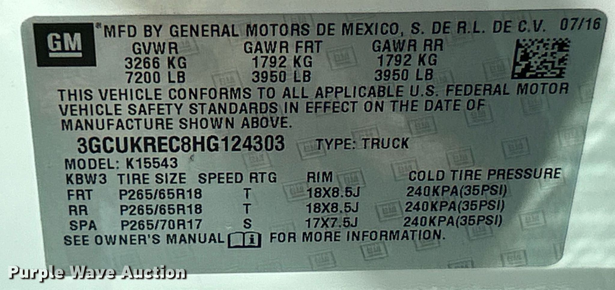 2017 Chevrolet Silverado 1500 LT Crew Cab pickup truck. Miles: 246,817 on odometer, Hours: 5,167 on meter, VIN: 3GCUKREC8HG124303. Engine Displacement: 5.3L V8 OHV, Cylinders: 8, Fuel type: Gas. Transmission Automatic, Four wheel drive. Interior AC, Heat, Seat: Power driver, Power windows, Power locks, Cruise control, Backup camera. Tires Size: 265/65R18. Notes Dash warning indicator: TPMS. Missouri title. Title distribution may be delayed up to 14 days from verification of funds. Sellenriek Construction Inc.. Jonesburg, MO 63351