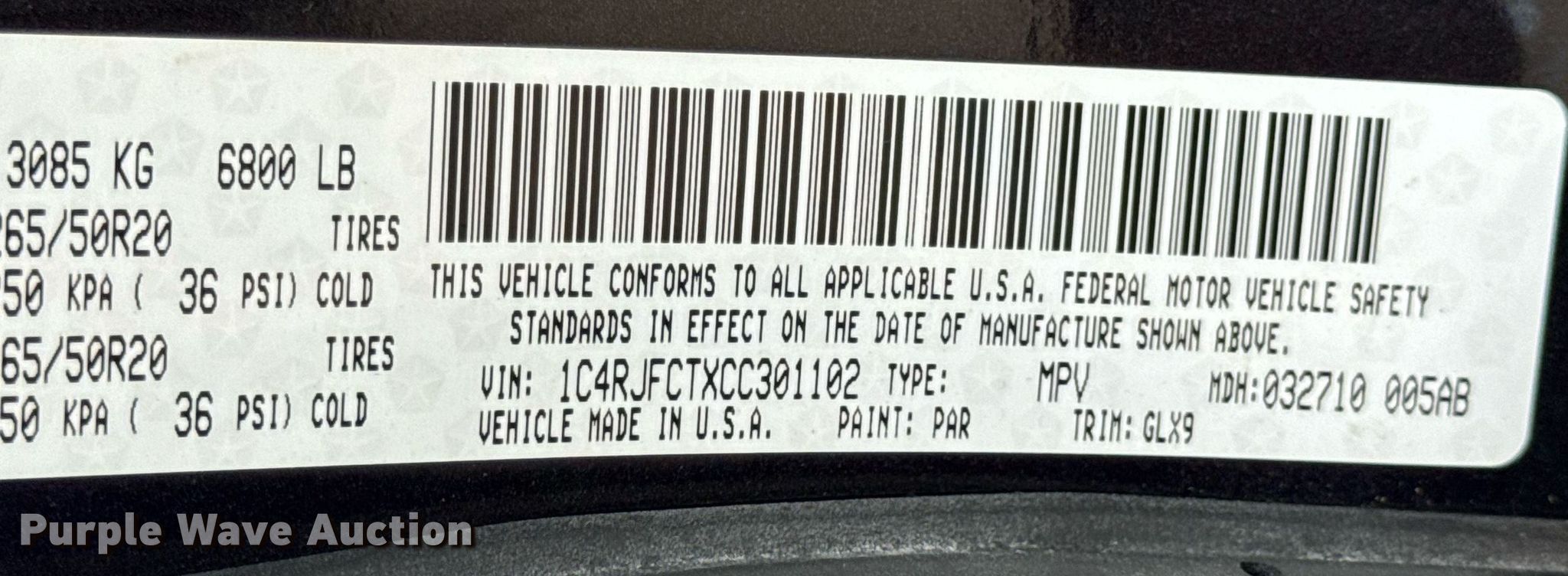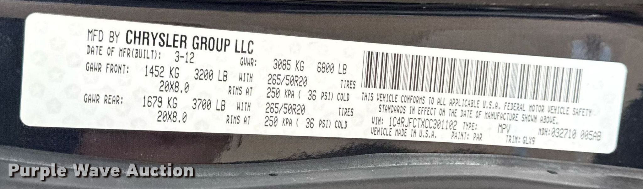 - VIN: 1C4RJFCTXCC301102