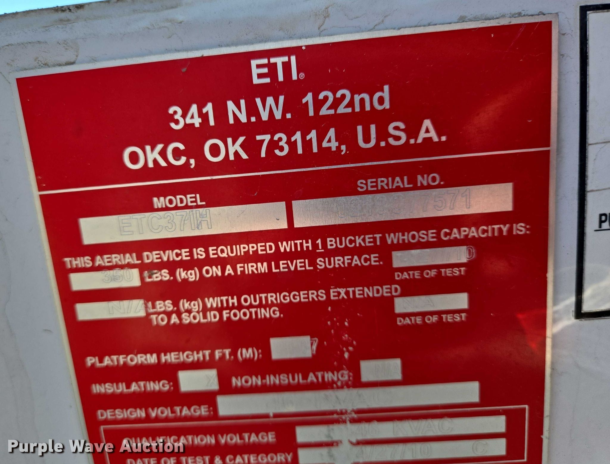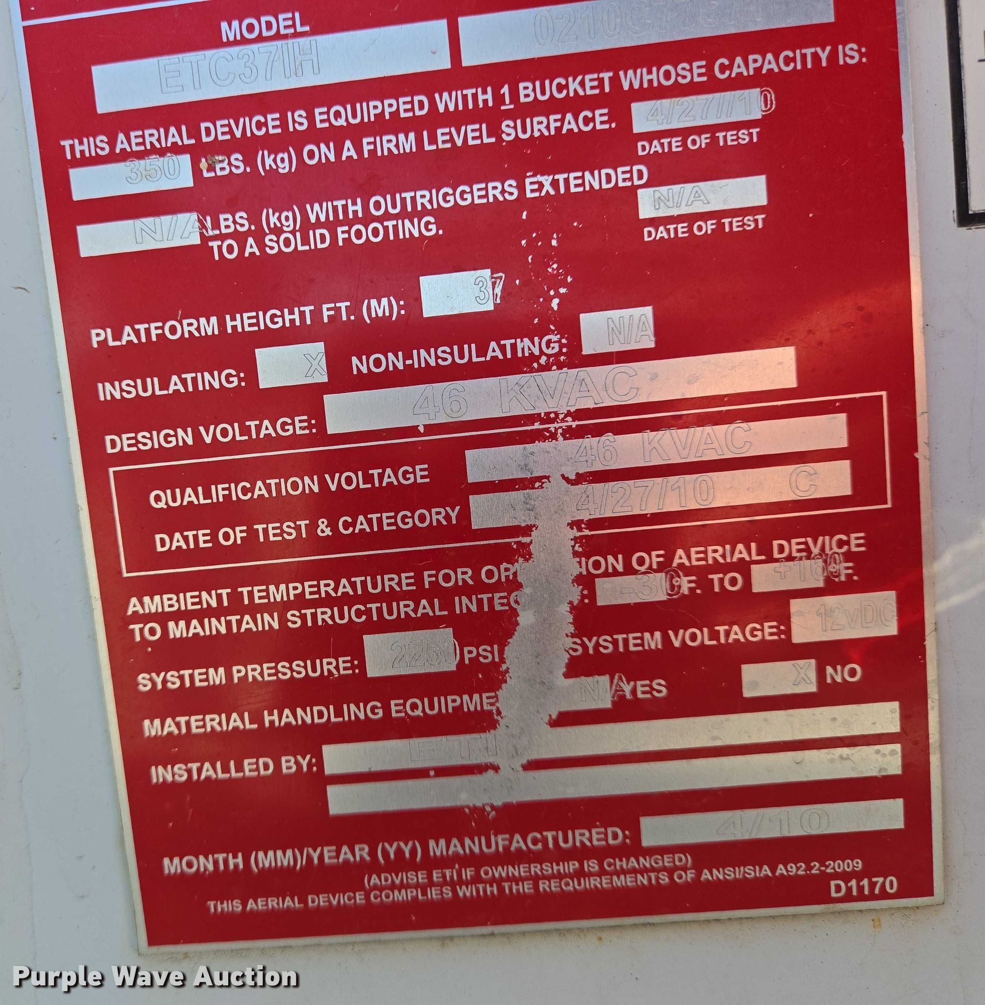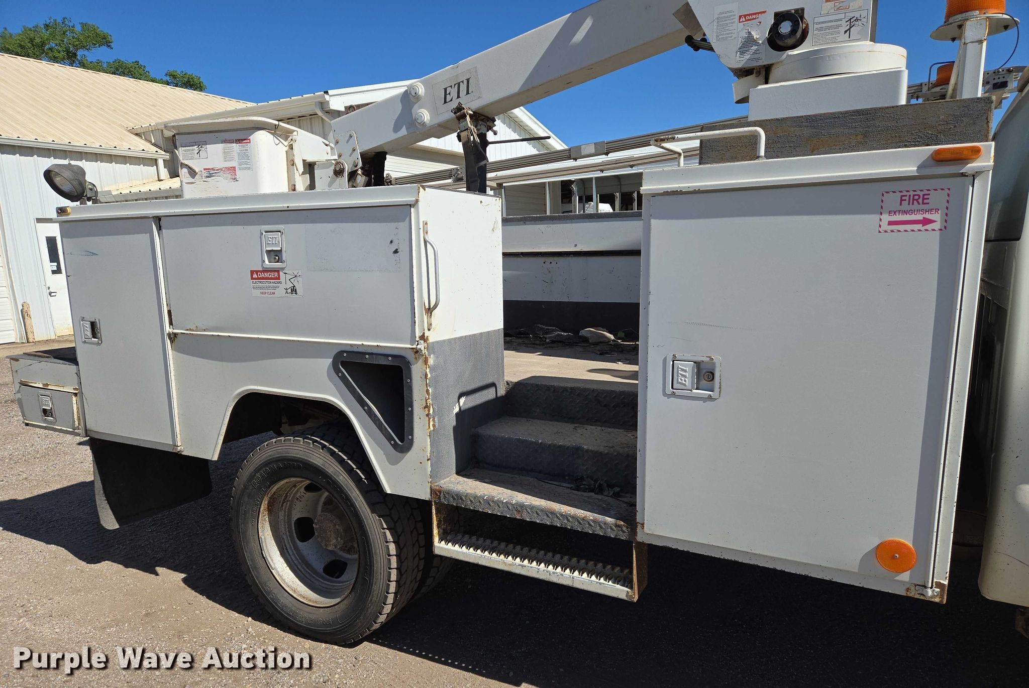 2009 Ford F550 Super Duty XL bucket truck. Miles: 194,437 on odometer, Hours: 1,547 on meter, VIN: 1FDAF57R19EA79517. Engine Displacement: 6.4L, Cylinders: 8, Fuel type: Diesel. Transmission Automatic. Chassis Four wheel drive, Axles: Single, Suspension: Spring, Brakes: Hydraulic, PTO. Interior AC, Heat. Features Bed 13' 4" L x 94" W, Boom ETI ETC37H, Maximum lift capacity: 350 lbs, Maximum lift height: 37', Boom type: Insulated, Man basket, Boom controls Ground, Platform/ basket.. Tires Size: 245/70R19.5. Notes Dash warning indicator: Airbag. Kansas title. Title distribution may be delayed up to 30 days from verification of funds. Universal Communications, LLC. El Dorado, KS 67042