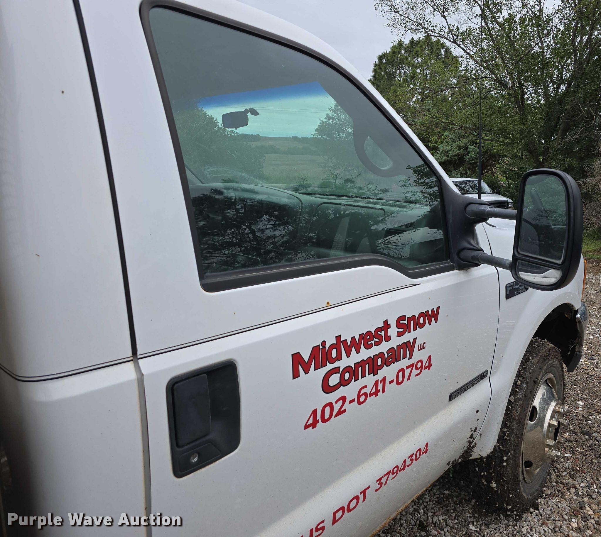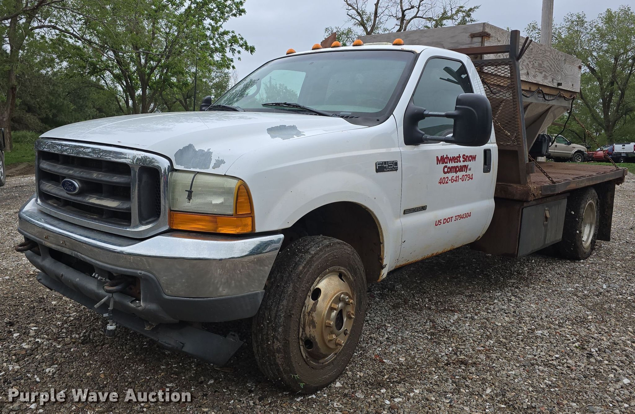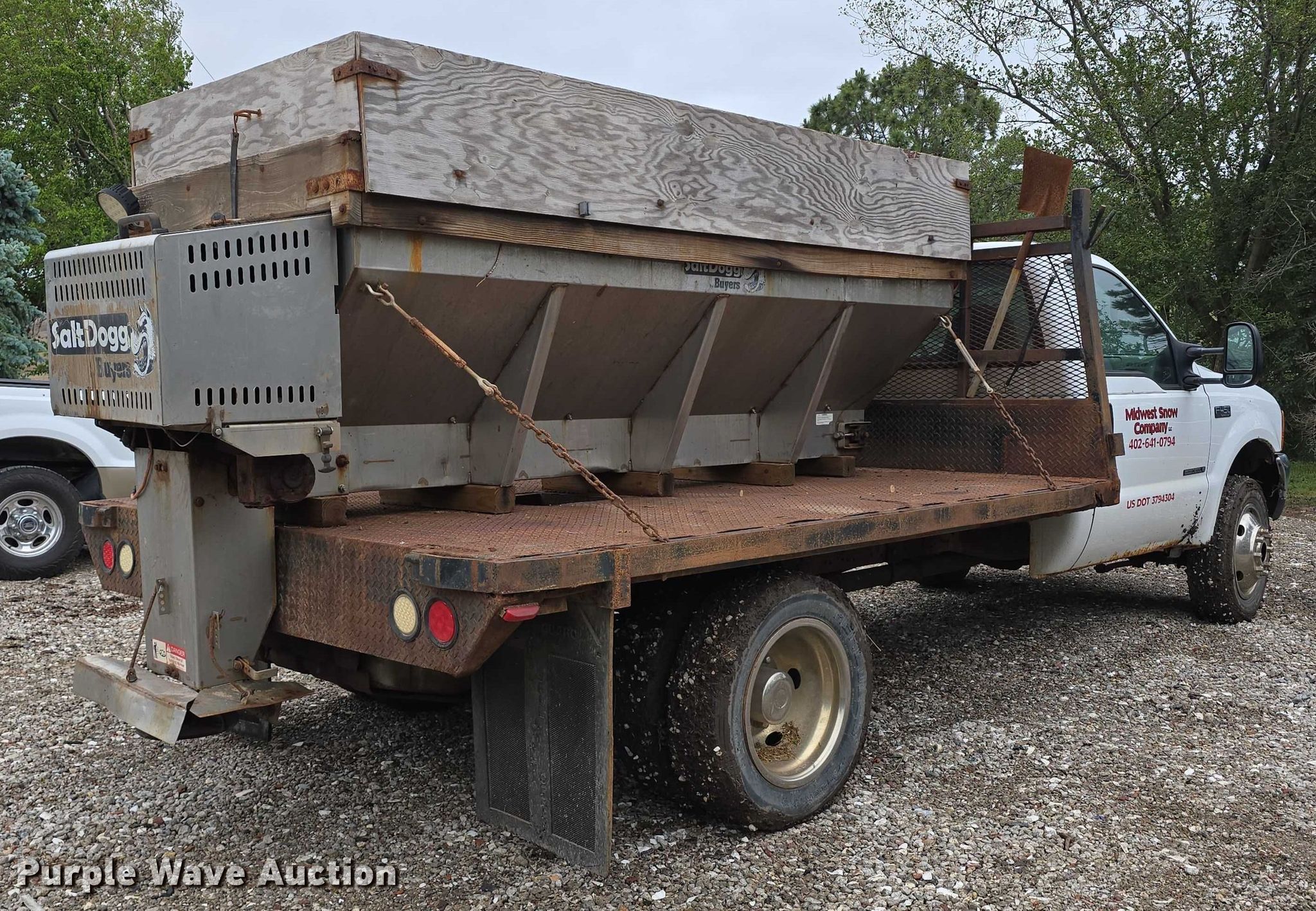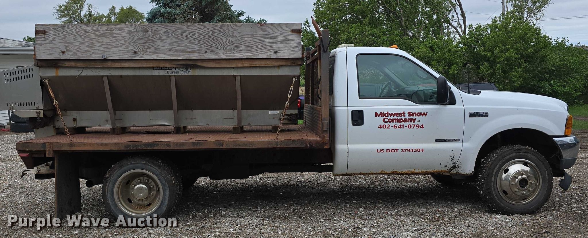 2001 Ford F450 Super Duty flatbed truck. Miles: 162,620 on odometer, VIN: 1FDXF47F71EB93861. Engine Displacement: 7.3L, Cylinders: 8, Fuel type: Diesel. Transmission Automatic. Chassis Four wheel drive, Axles: Single, Suspension: Spring, Brakes: Hydraulic, GVWR: 15,000 lbs. Interior AC, Heat, Cruise control, Brake controller. Features Flatbed 11' L x 100" W, Hitch: Gooseneck, Buyers SaltDogg spreader 10' L x 52" W, Briggs & Stratton PowerBuilt 10.5HP single cylinder gas engine. Tires Size: 225/70R19.5. Notes Dash warning indicator: Brake. Nebraska title. Title distribution may be delayed up to 30 days from verification of funds. Mr Yards and More LLC. Lincoln, NE 68531