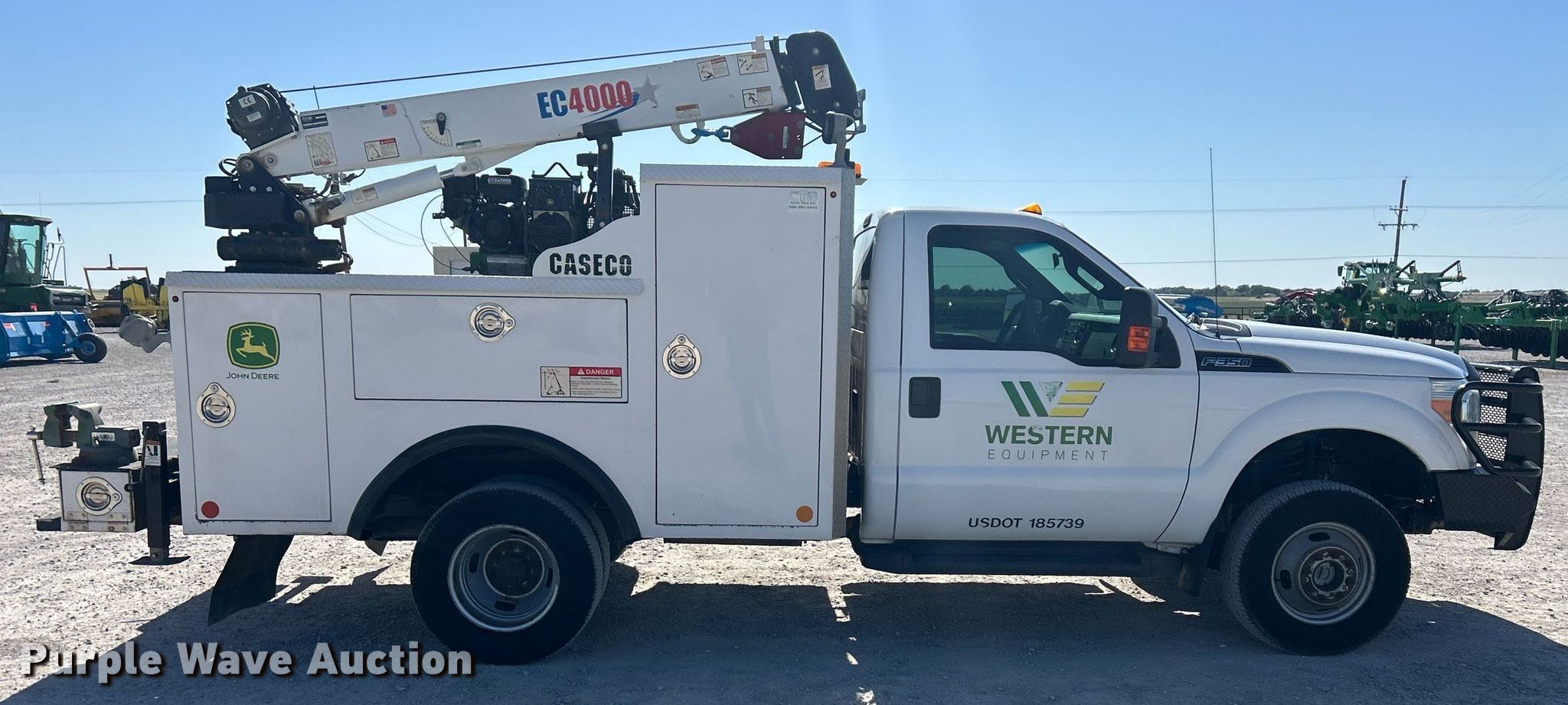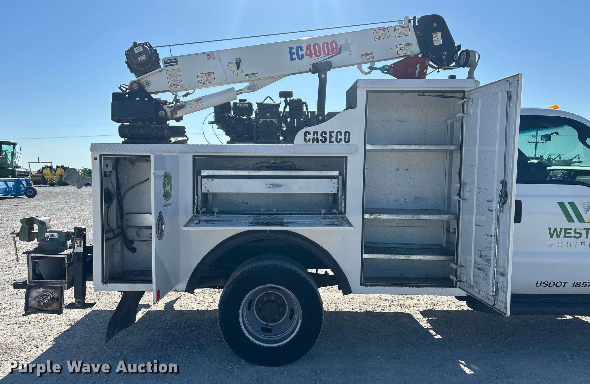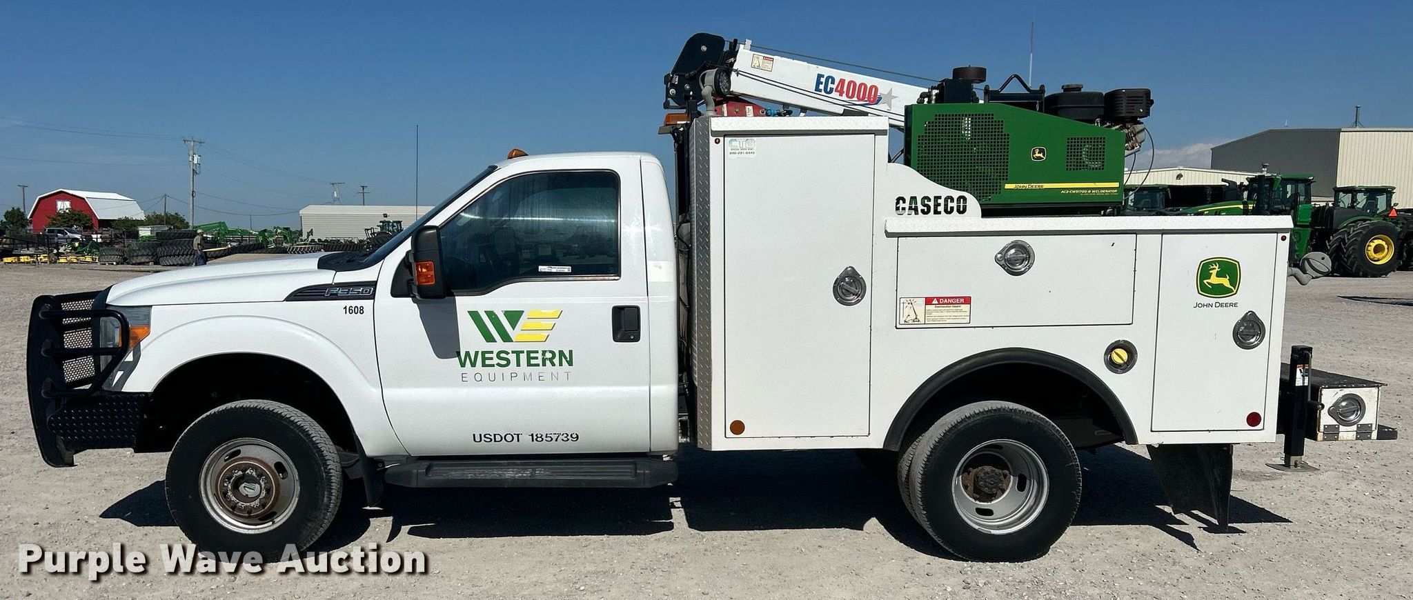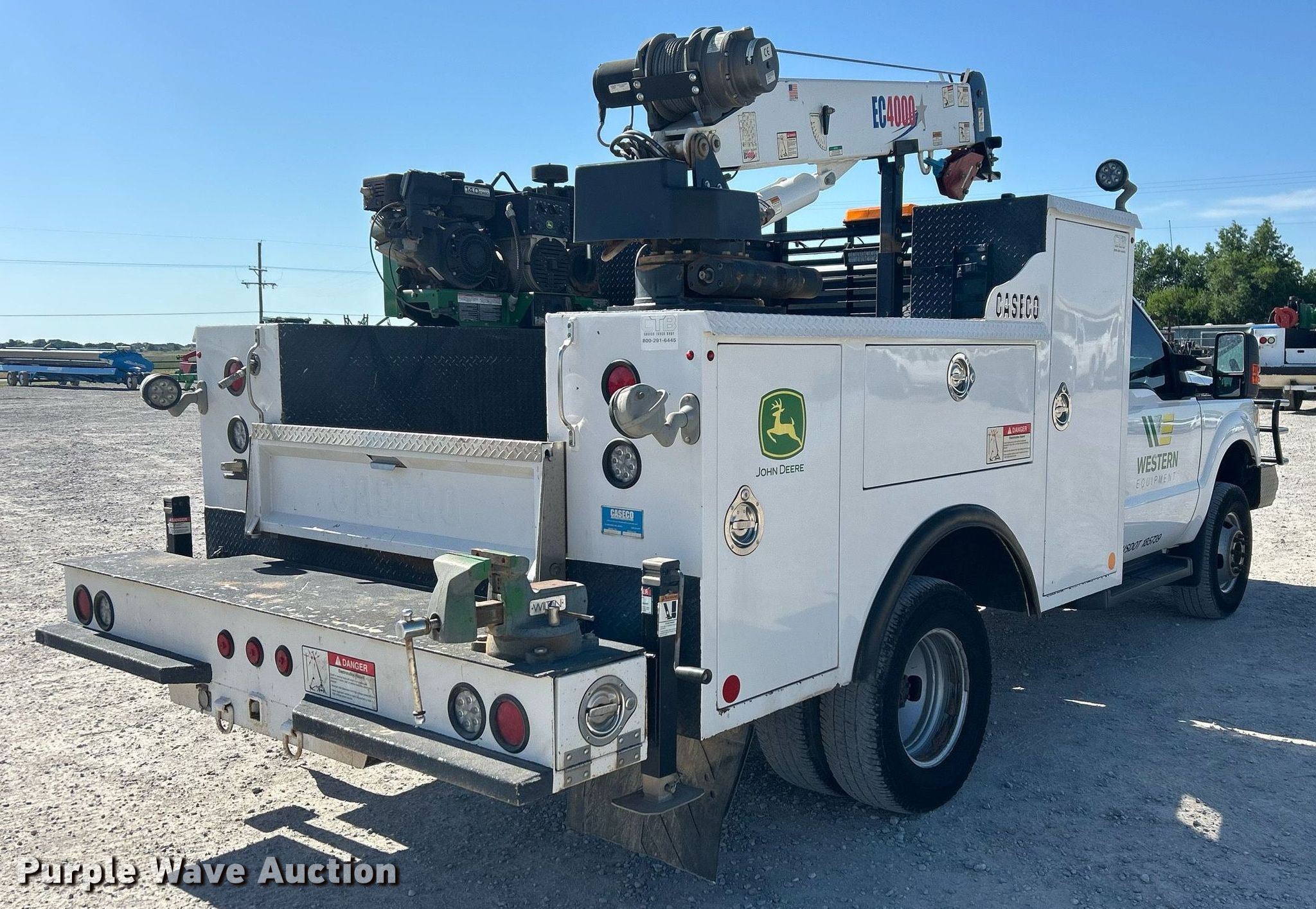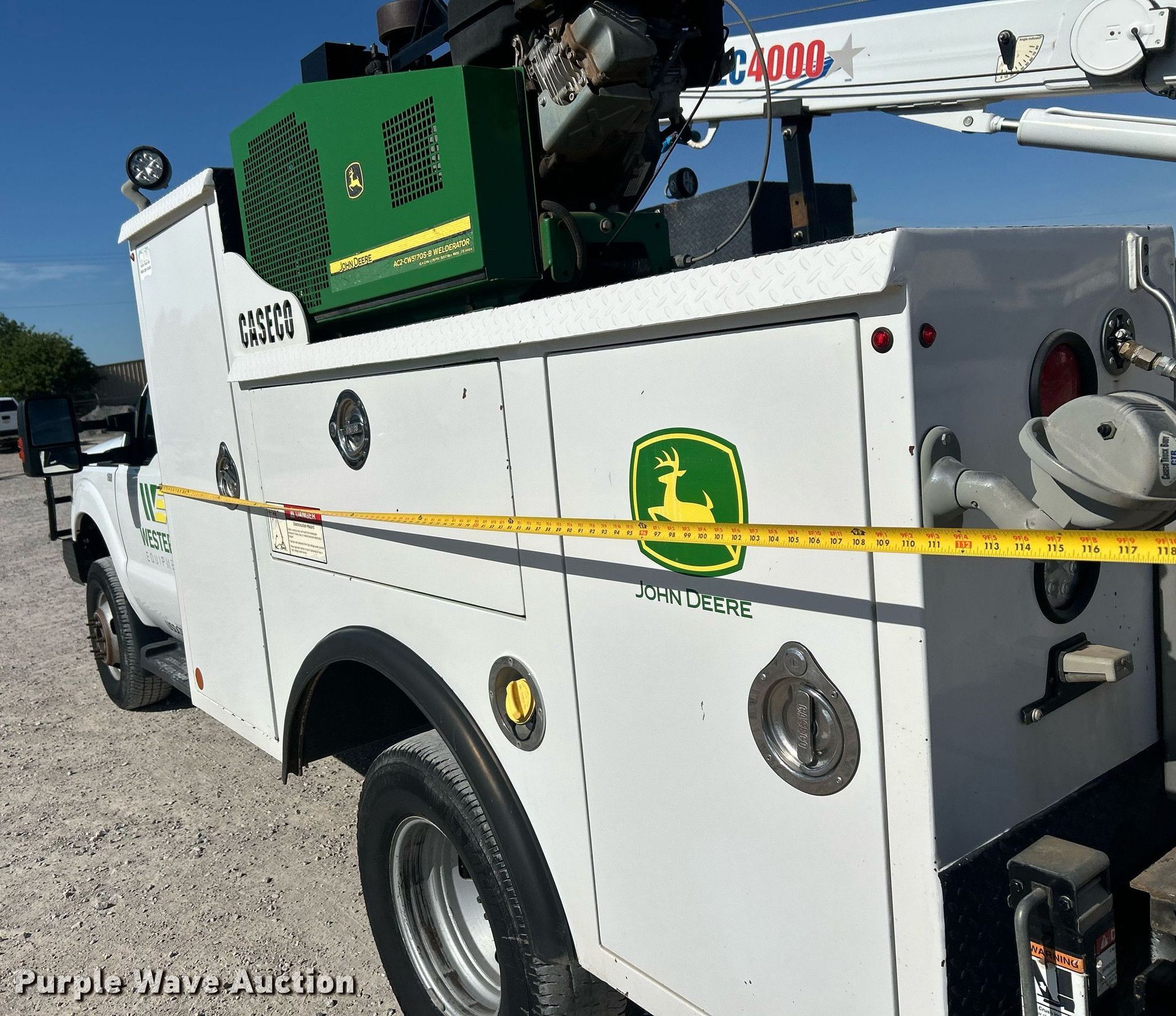 2016 Ford F350 Super Duty utility / service truck. Miles: 166,481 on odometer, Engine hours: 10,016 on meter, VIN: 1FDRF3H63GEA80824. Engine Displacement: 6.2L V8 OHV, Cylinders: 8, Fuel type: Gas. Transmission Automatic. Chassis Four wheel drive, Axles: Single, Suspension: Spring, Brakes: Hydraulic, GVWR: 14,000 lbs, Wheelbase: 141". Interior AC, Heat, Heated mirrors, Power windows, Power locks, Cruise control, Auxiliary controls, Brake controller. Features Bed Caseco MM142225, 9' L x 8' W, Welder/generator John Deere AC2-CW5170S-B, Fuel type: Gas, 250V outlets: 1, 125V outlets: 4, Crane Stellar EC40000, Maximum lift capacity: 6,000 lbs. Tires Size: LT245/75R17. Notes Windshield chipped or cracked. Oklahoma title. Title distribution may be delayed up to 14 days from verification of funds. Western Lease LLC. Amarillo, TX 79119