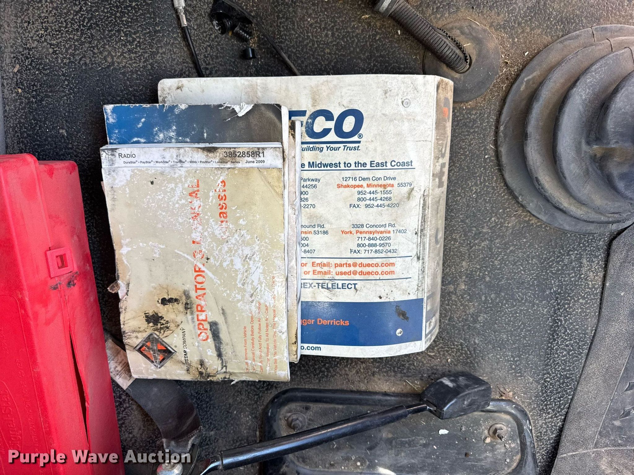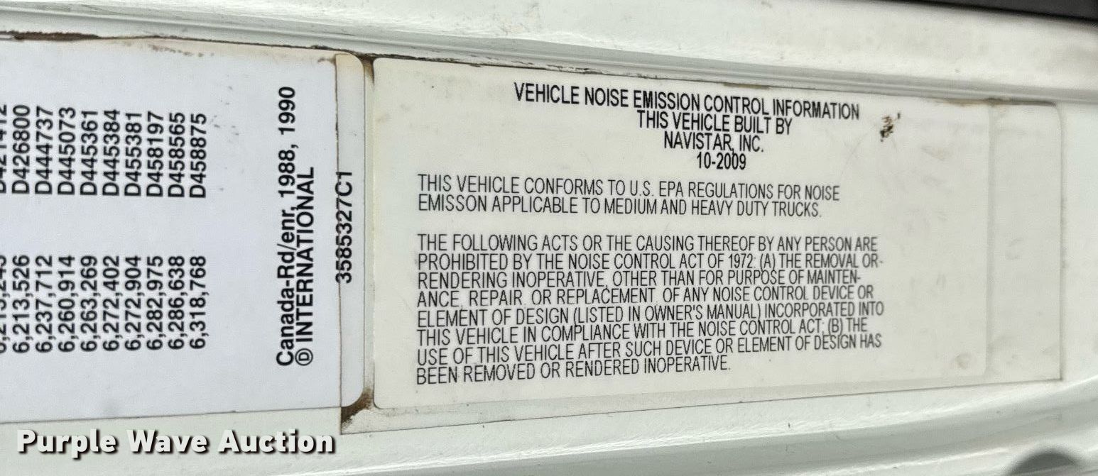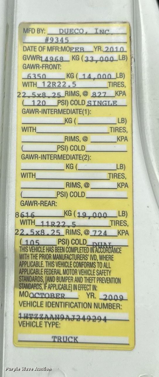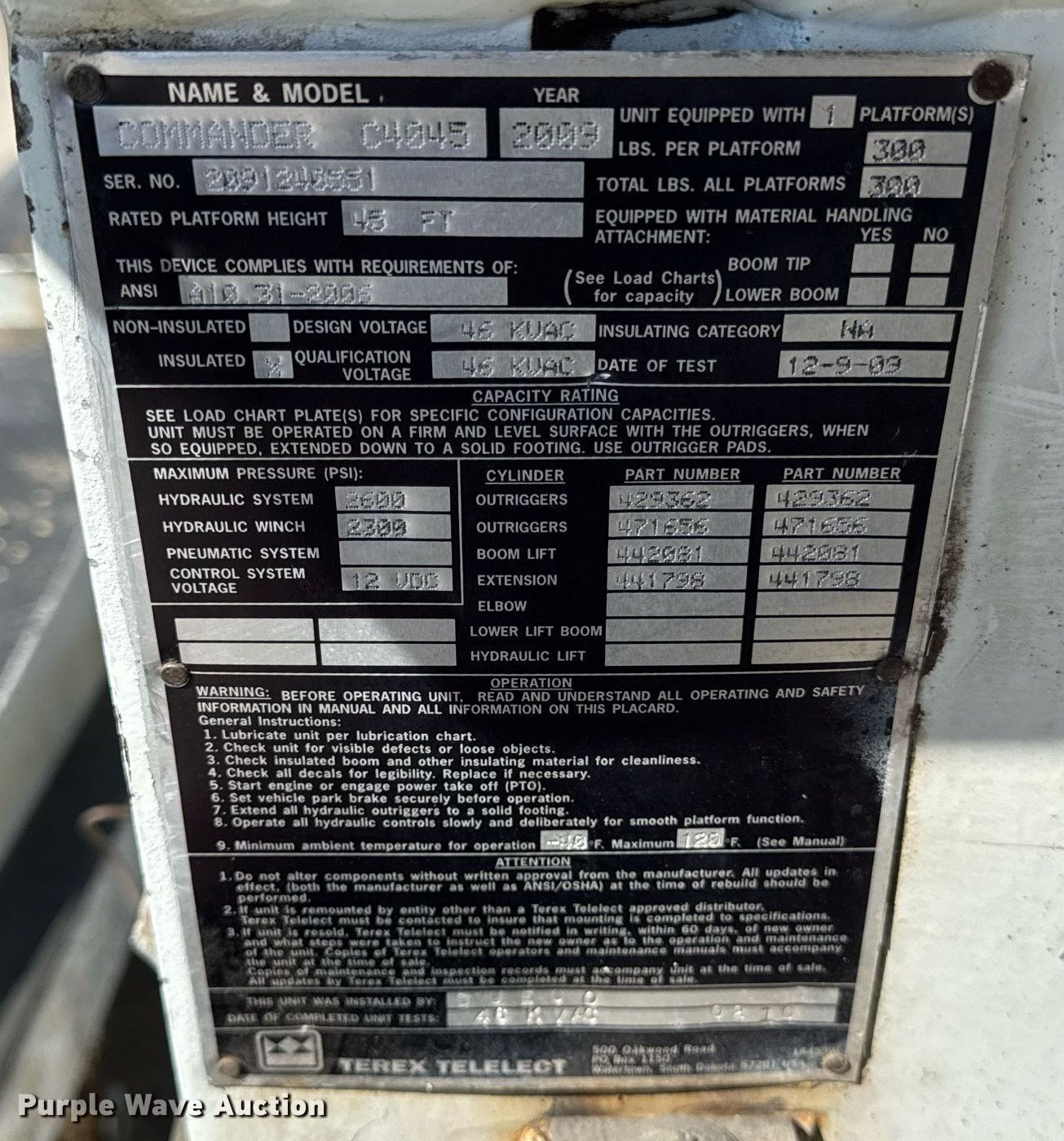 2010 International SA615 digger derrick truck. Miles: 157,823 on odometer, Hours: 8,667 on meter, VIN: 1HTZZAAN9AJ249294, Unit #: 5. Engine Maxx Force DT466, Displacement: 7.6L, Fuel type: Diesel. Transmission Eaton Fuller, Manual, Speed: 10. Chassis Axles: Single, Differential lock: Inter-axle, Suspension: Spring, Brakes: Air, PTO, GVWR: 33,000 lbs. Interior AC, Heat, Cruise control, Auxiliary controls. Features Bed Dueco DFB13-4, 13' 4" L x 96" W, Boom 2009 Terex Commander C4045, Maximum lift capacity: 300 lbs, Maximum lift height: 45', Boom type: Insulated, Telescopic, Man basket, Boom controls Ground, Platform/ basket, Material handler, Pole guide, Auger Diameter: 18", Certification valid through: 10/2025, Winch. Tires Size: 11R22.5. Notes Manuals included. Illinois title. Title distribution may be delayed up to 14 days from verification of funds. Shelby Electric Cooperative. Shelbyville, IL 62565