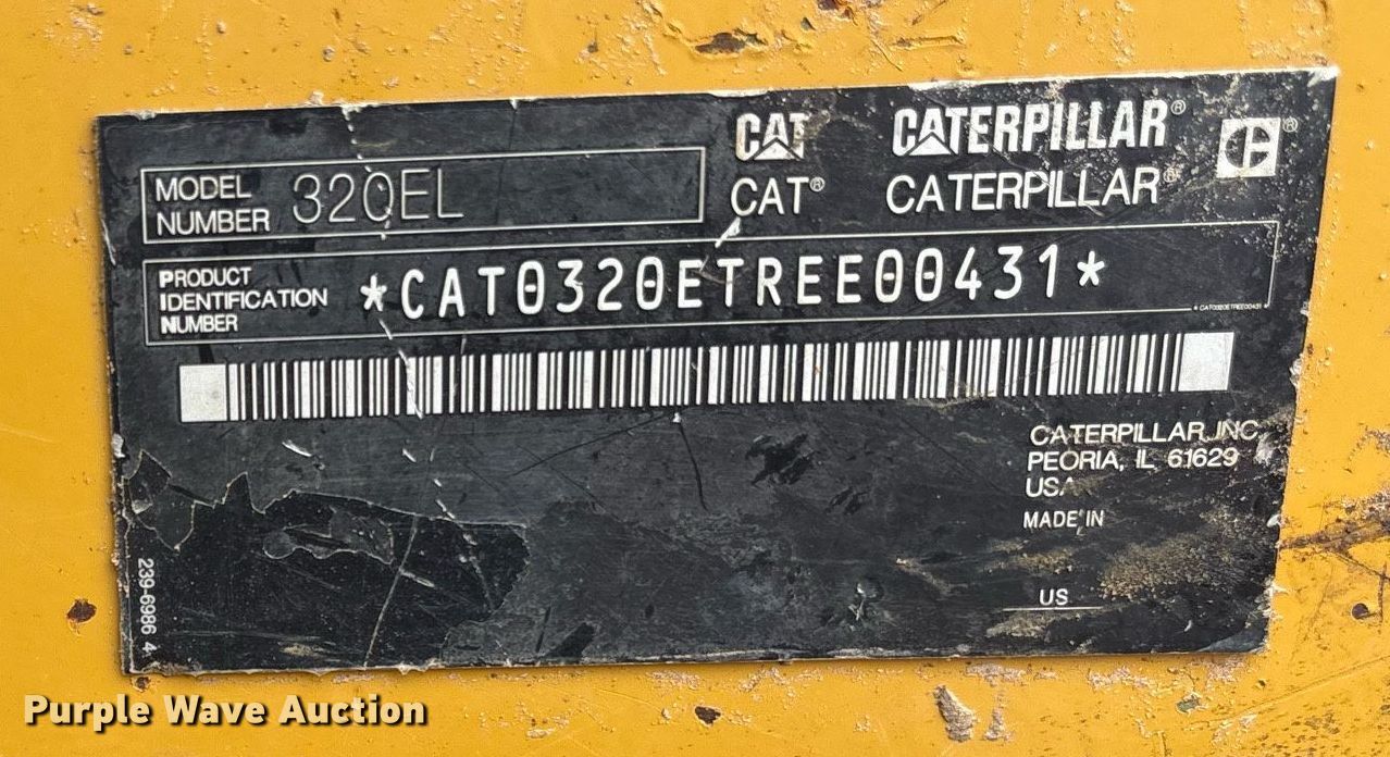 2013 Caterpillar 320E L excavator. Hours: 13,159 on meter, Serial: CAT0320ETREE00431, Unit #: 1204. Engine Caterpillar C6.6 Acert, Serial: C8N09957, Displacement: 6.6L, Cylinders: 6, Fuel type: Diesel. Transmission Hydrostatic, Two speed travel. Operators station Enclosed cab, AC, Heat, Backup camera, Pattern changer. Features Auxiliary hydraulics Two-way, Counter weights, Boom Standard, Stick Stick length: 9' 6", Quick coupler: Hydraulic, Thumb: Manual Caterpillar, Bucket CJ, Width: 37", Teeth: 5. Tracks Width: 31", Steel, Grouser pads: Triple. Notes Possible AC issues, may need charged. Welch Excavation. Winona, TX 75792