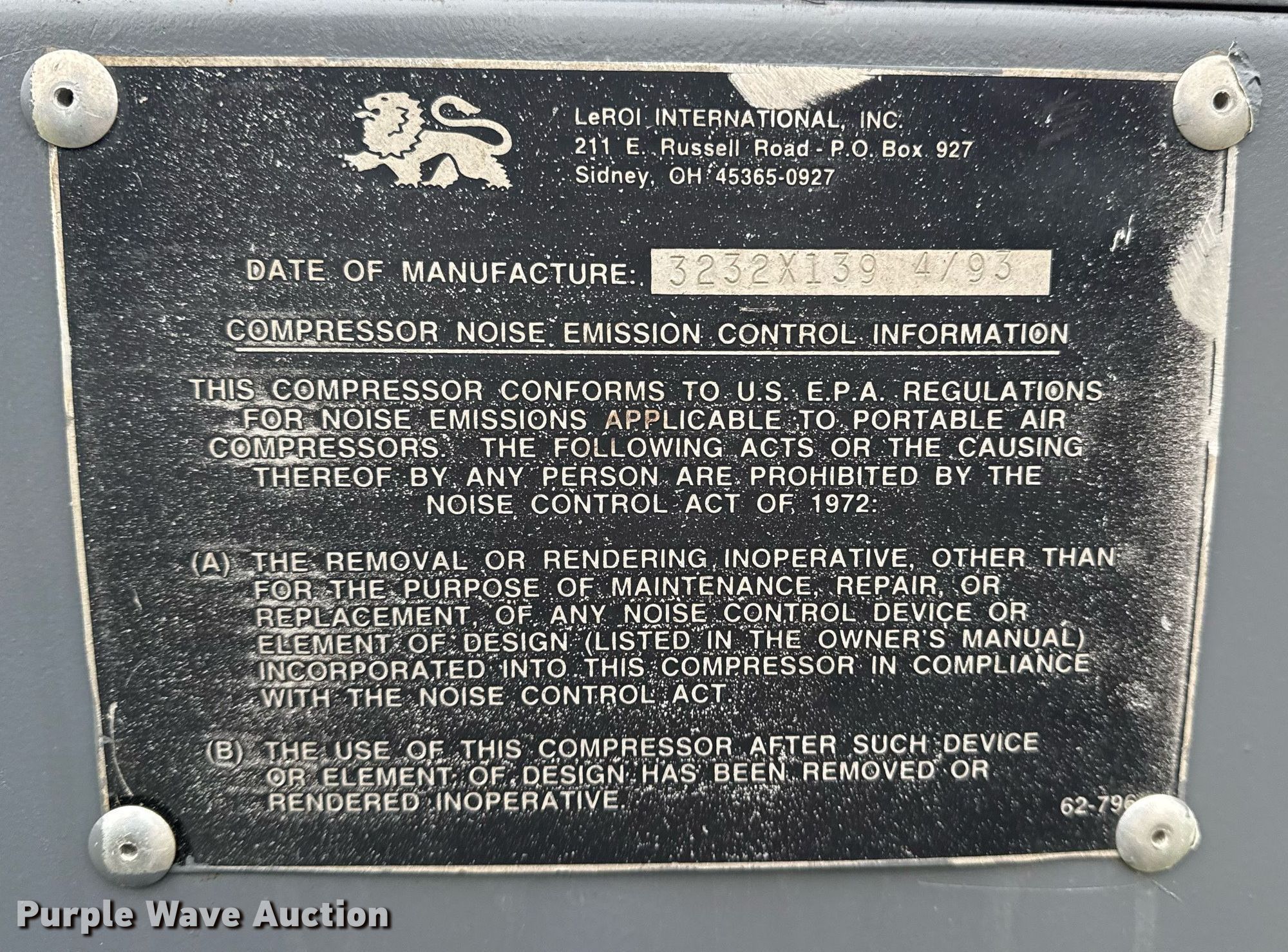 Purple Wave is selling a used Air Compressor in Oklahoma. This item is a 1993 LeRoi International air compressor with the following: Hours: 5,772 on meter, Serial: 3232X139