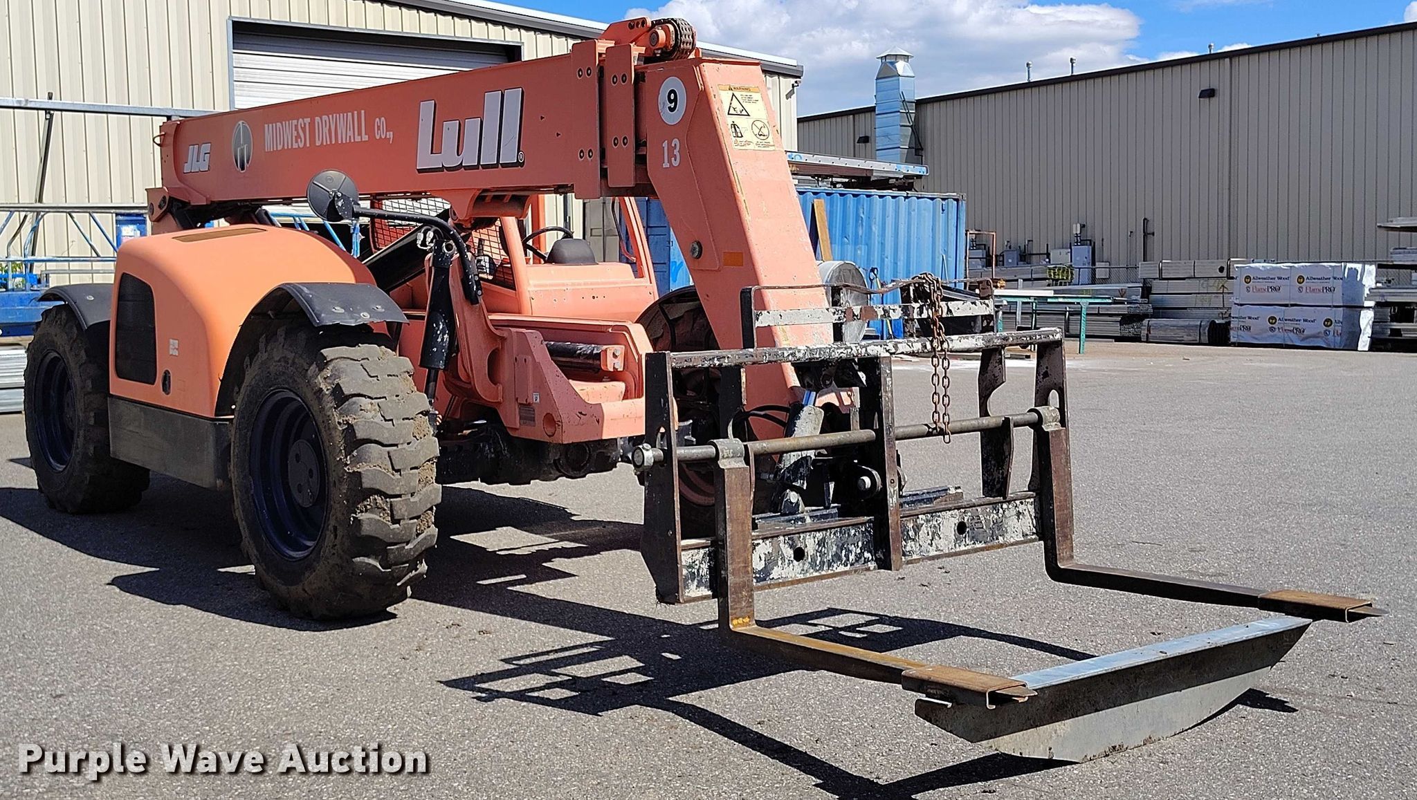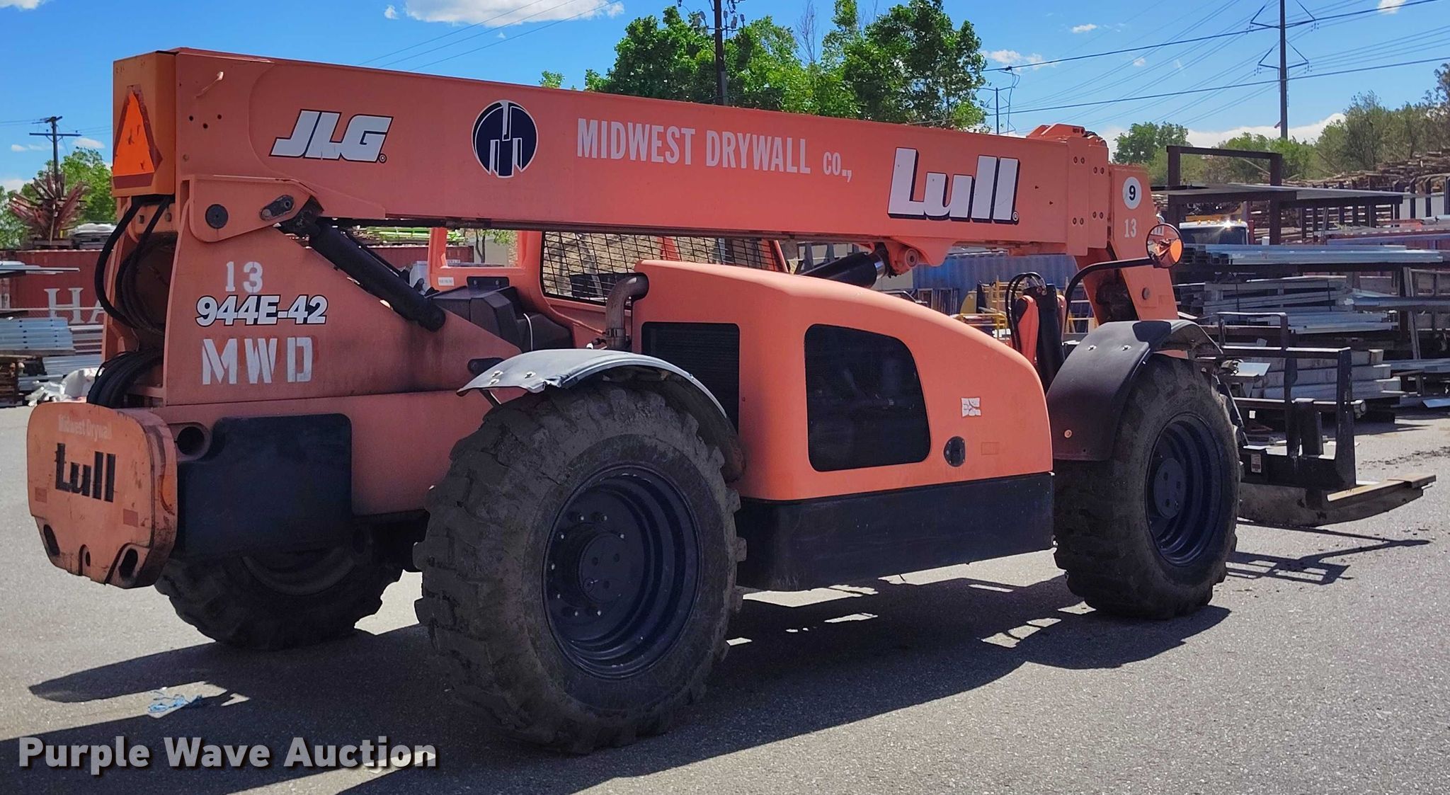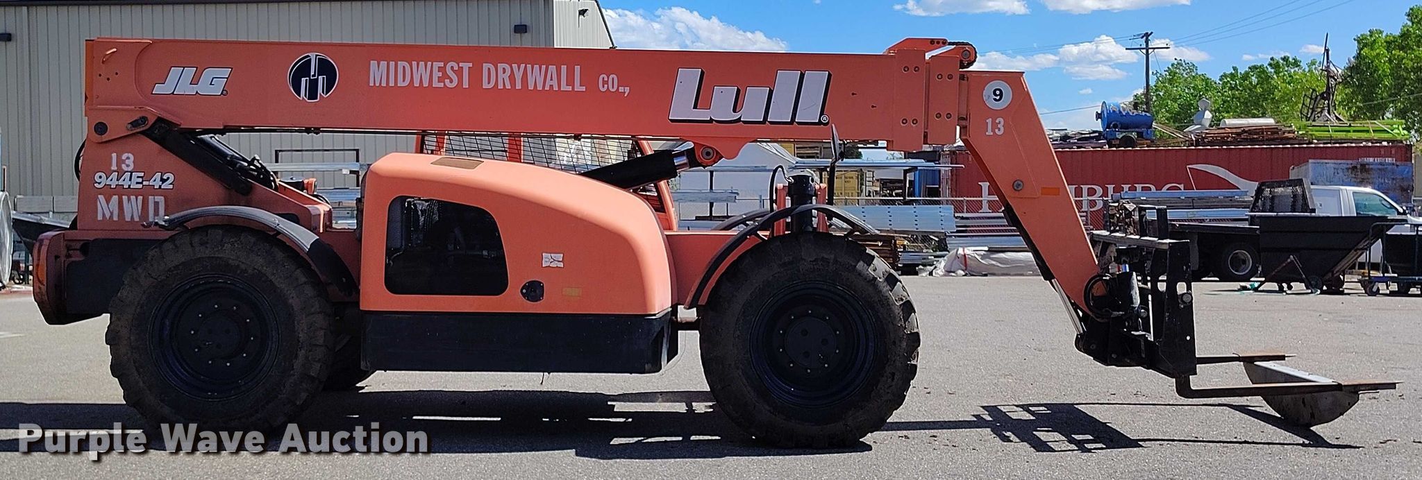 2005 Lull 944E-42 telehandler. Hours: 6,900 on meter, Serial: 0160007635. Engine Cummins QSB4.5T, Serial: 30678240, Displacement: 4.5L, Cylinders: 4, Fuel type: Diesel. Transmission Powershift, 4F - 3R, Four wheel drive. Operators station OROPS, Steering: Crab, Four wheel. Features Maximum lift capacity: 9,000 lbs, Maximum lift height: 52', Boom stages: 3, Fork length: 48", Auxiliary hydraulics, Tilt carriage, Hydraulic leveling, Quick attach: Manual. Tires Size: 15.5-25, Foam filled. Midwest Drywall Company. Denver, CO 80216