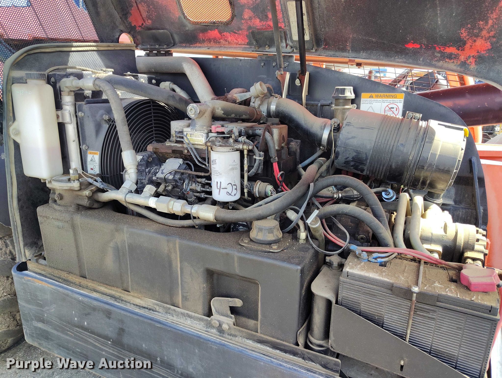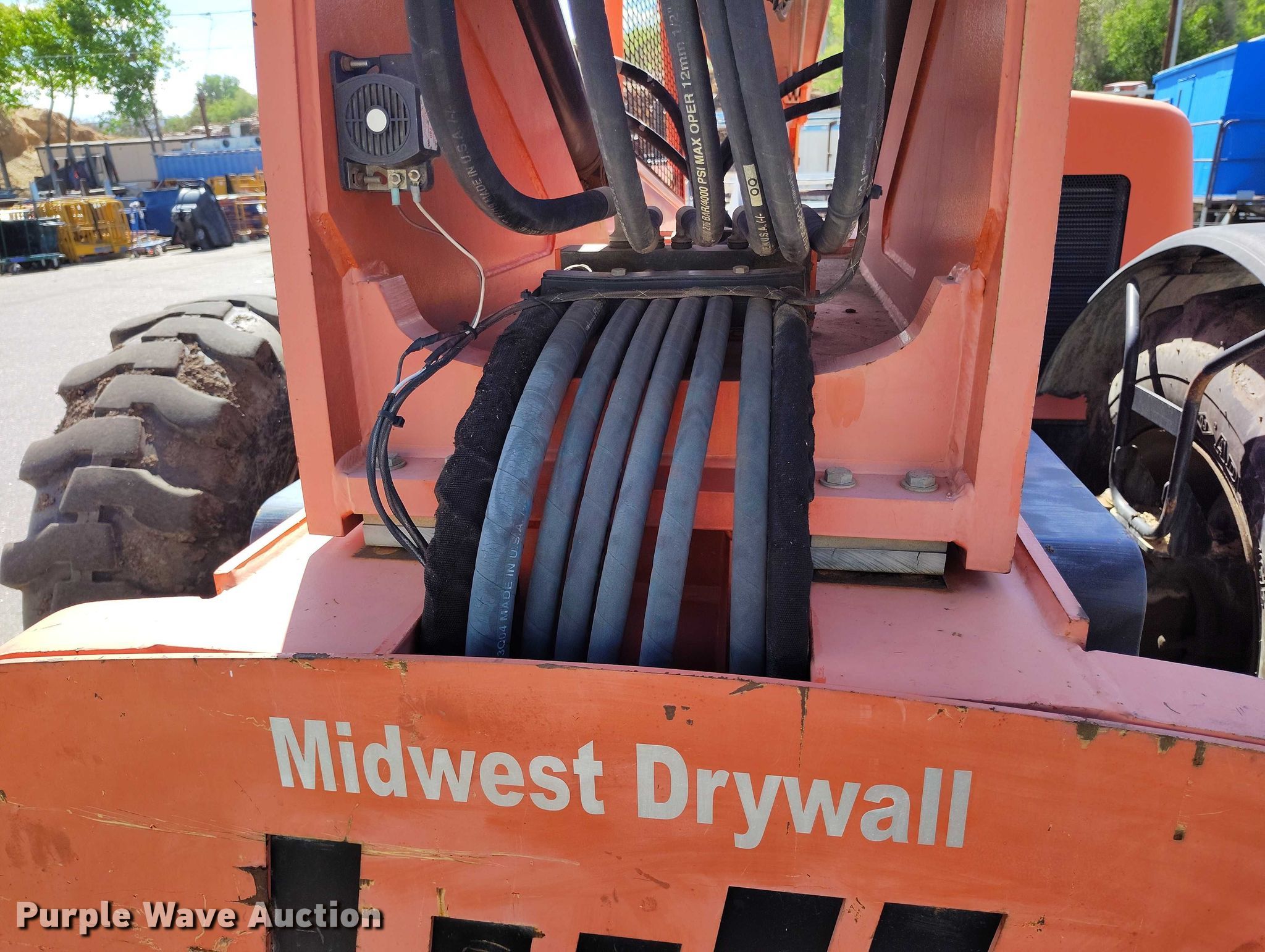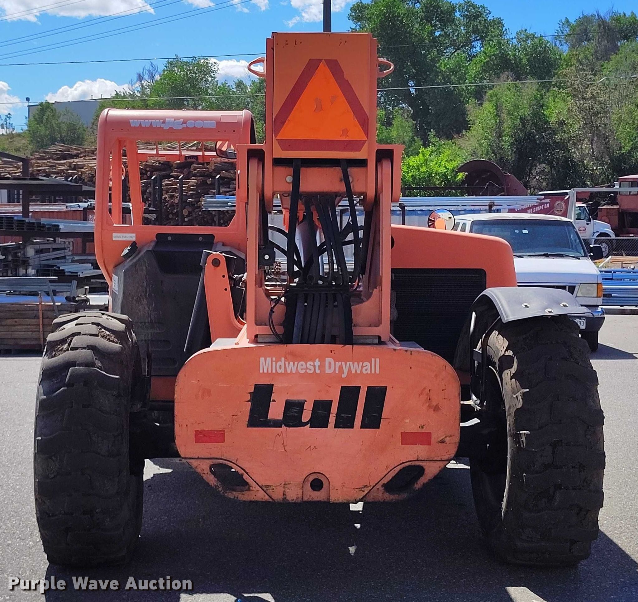 2005 Lull 944E-42 telehandler. Hours: 6,900 on meter, Serial: 0160007635. Engine Cummins QSB4.5T, Serial: 30678240, Displacement: 4.5L, Cylinders: 4, Fuel type: Diesel. Transmission Powershift, 4F - 3R, Four wheel drive. Operators station OROPS, Steering: Crab, Four wheel. Features Maximum lift capacity: 9,000 lbs, Maximum lift height: 52', Boom stages: 3, Fork length: 48", Auxiliary hydraulics, Tilt carriage, Hydraulic leveling, Quick attach: Manual. Tires Size: 15.5-25, Foam filled. Midwest Drywall Company. Denver, CO 80216