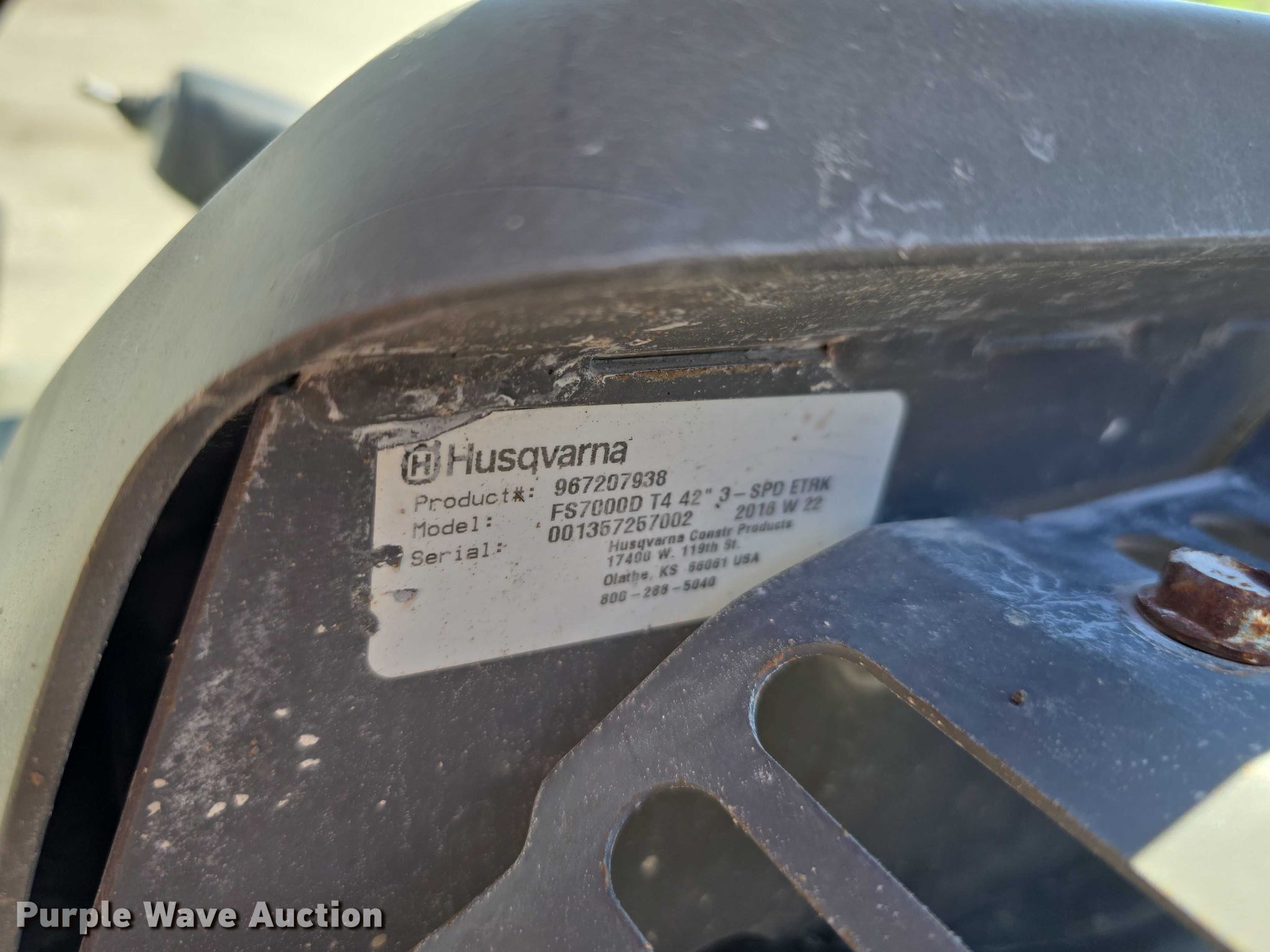 2016 Husqvarna FS7000D concrete saw. Hours: 742 on meter, Serial: 001357257002. Engine Deutz TD 2.9 L4, Serial: 11871061, Displacement: 2.9L, Cylinders: 4, Fuel type: Diesel. Transmission Hydrostatic. Features Blade diameter: 42". Ten Point Construction Co., Inc.. Denison, IA 51442