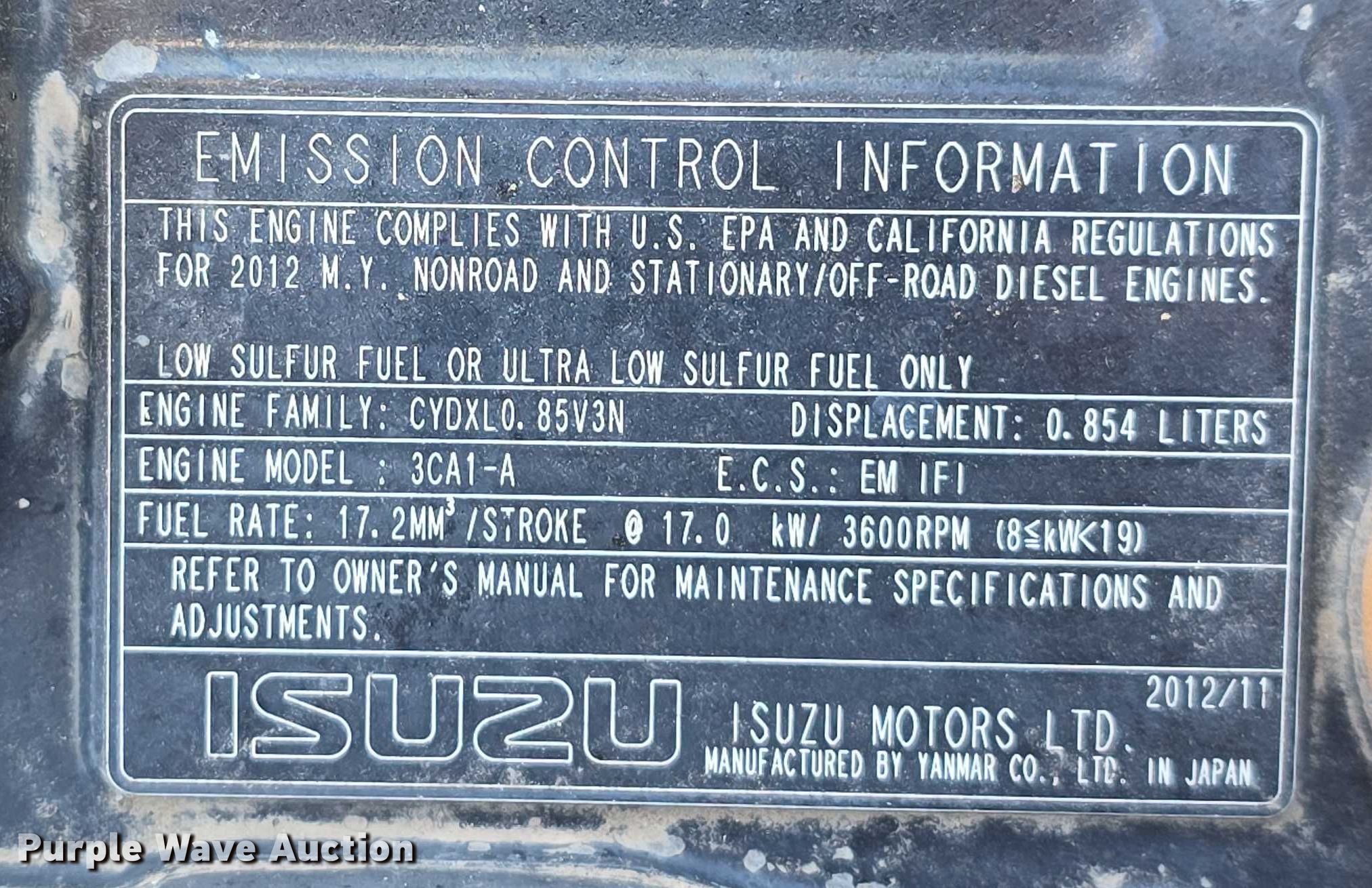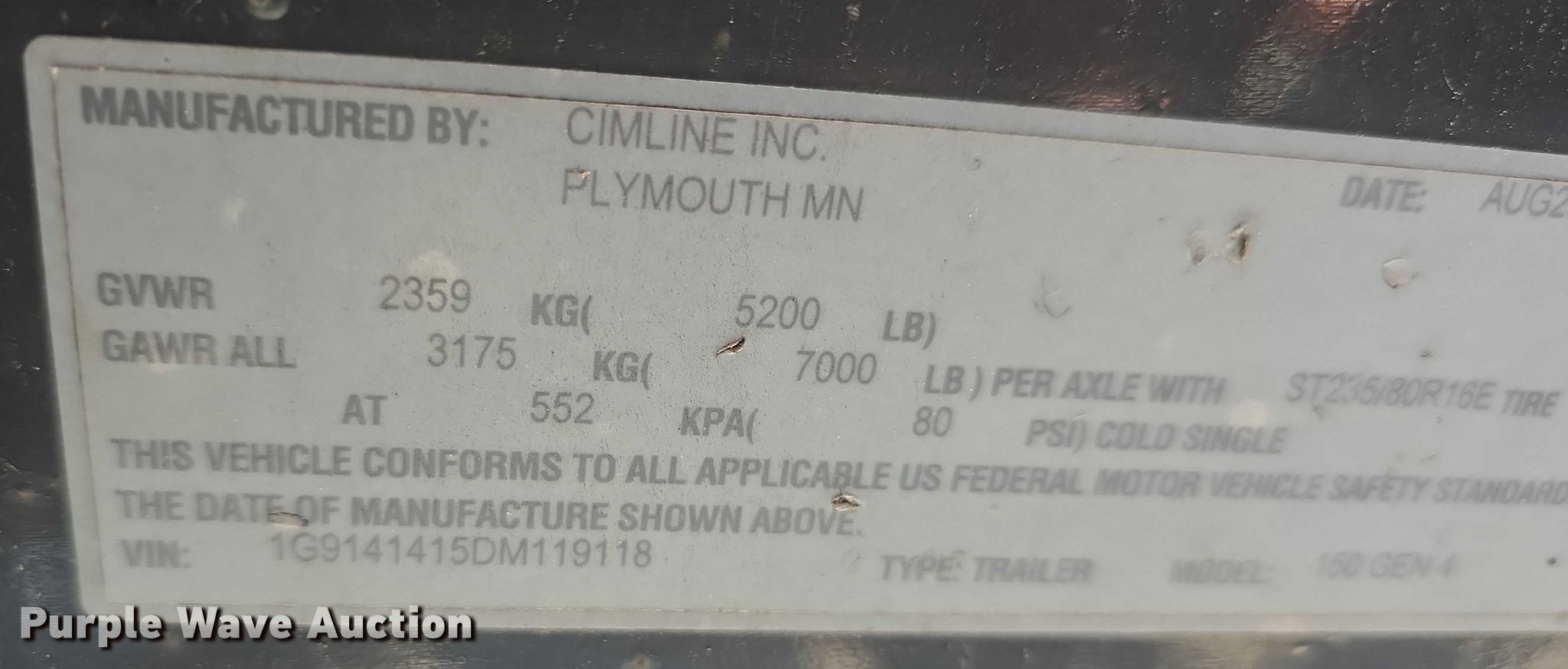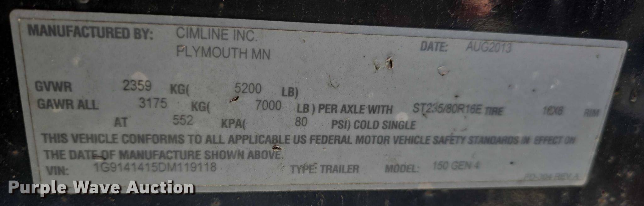 2013 Cimline 150 Gen 4 melter applicator. Hours: 1,684 on meter, VIN: 1G9141415DM119118. Engine Isuzu 3CA1-AZP01, Serial: 002842, Displacement: 0.854L, Cylinders: 3, Fuel type: Diesel, kW: 17. Features 13' 6" L x 84" W, Hitch: Pintle, Suspension: Torsion, Beckett ADC oil burner. Tires Size: ST235/80R16. Notes Hose damaged. This is worksite support equipment and will not come with a title. Transfer of ownership documentation will be a bill of sale. Ten Point Construction Co., Inc.. Denison, IA 51442