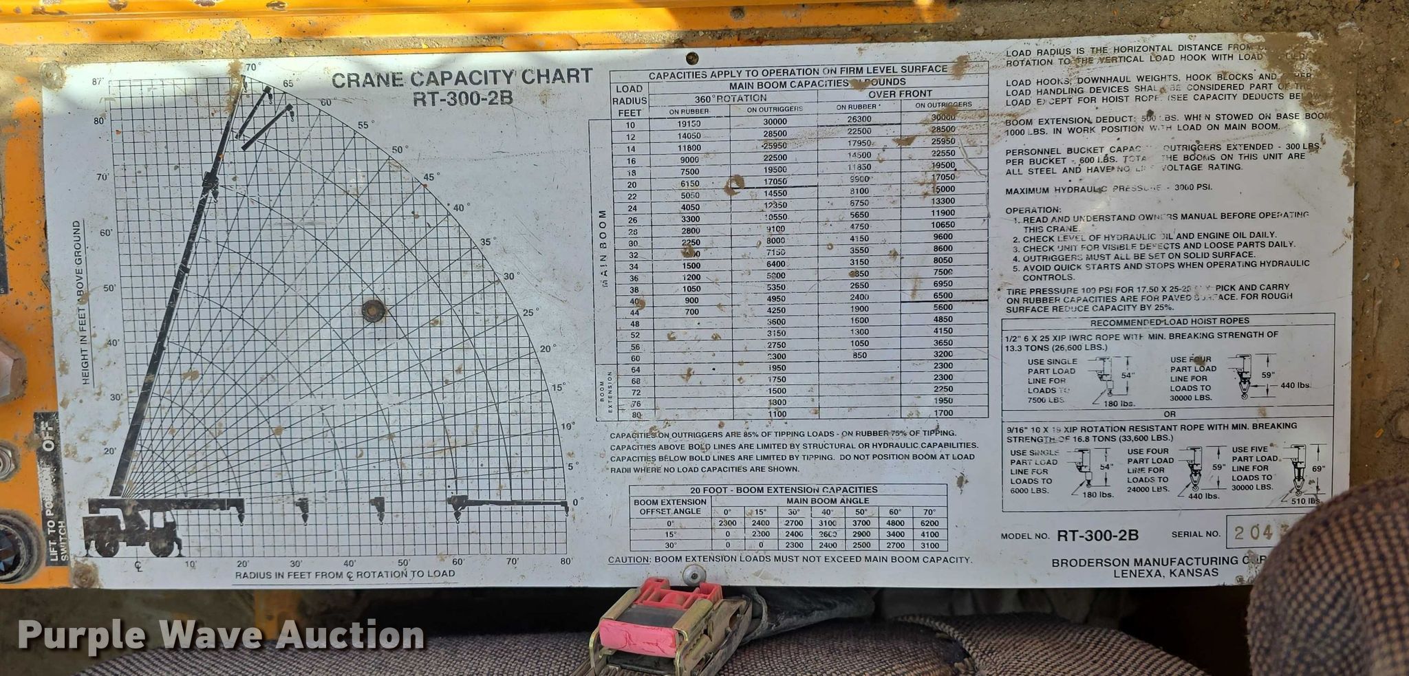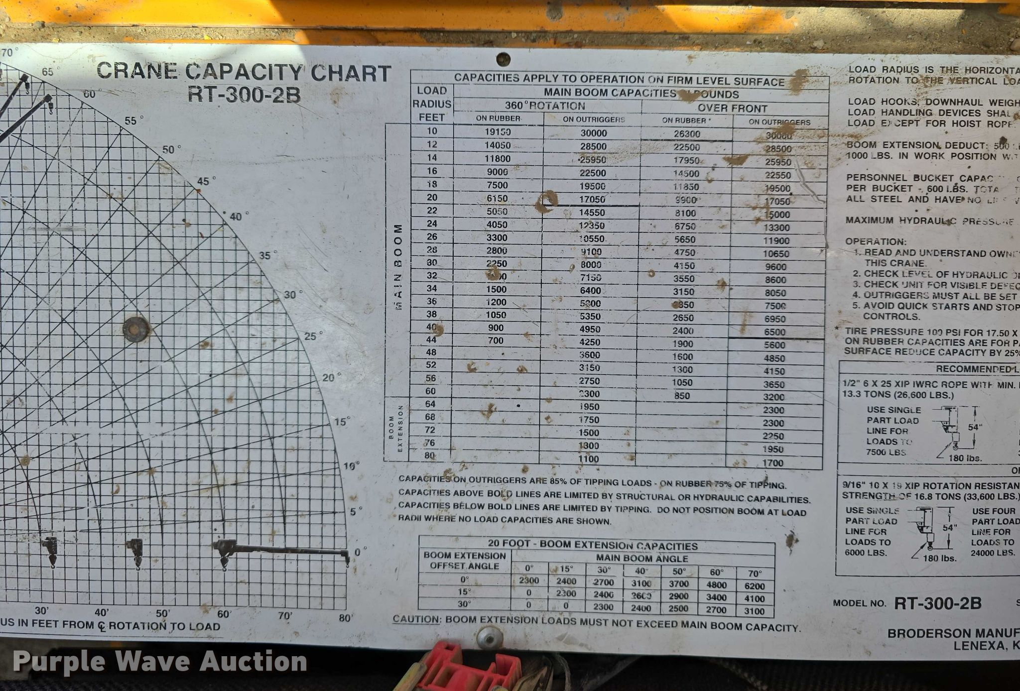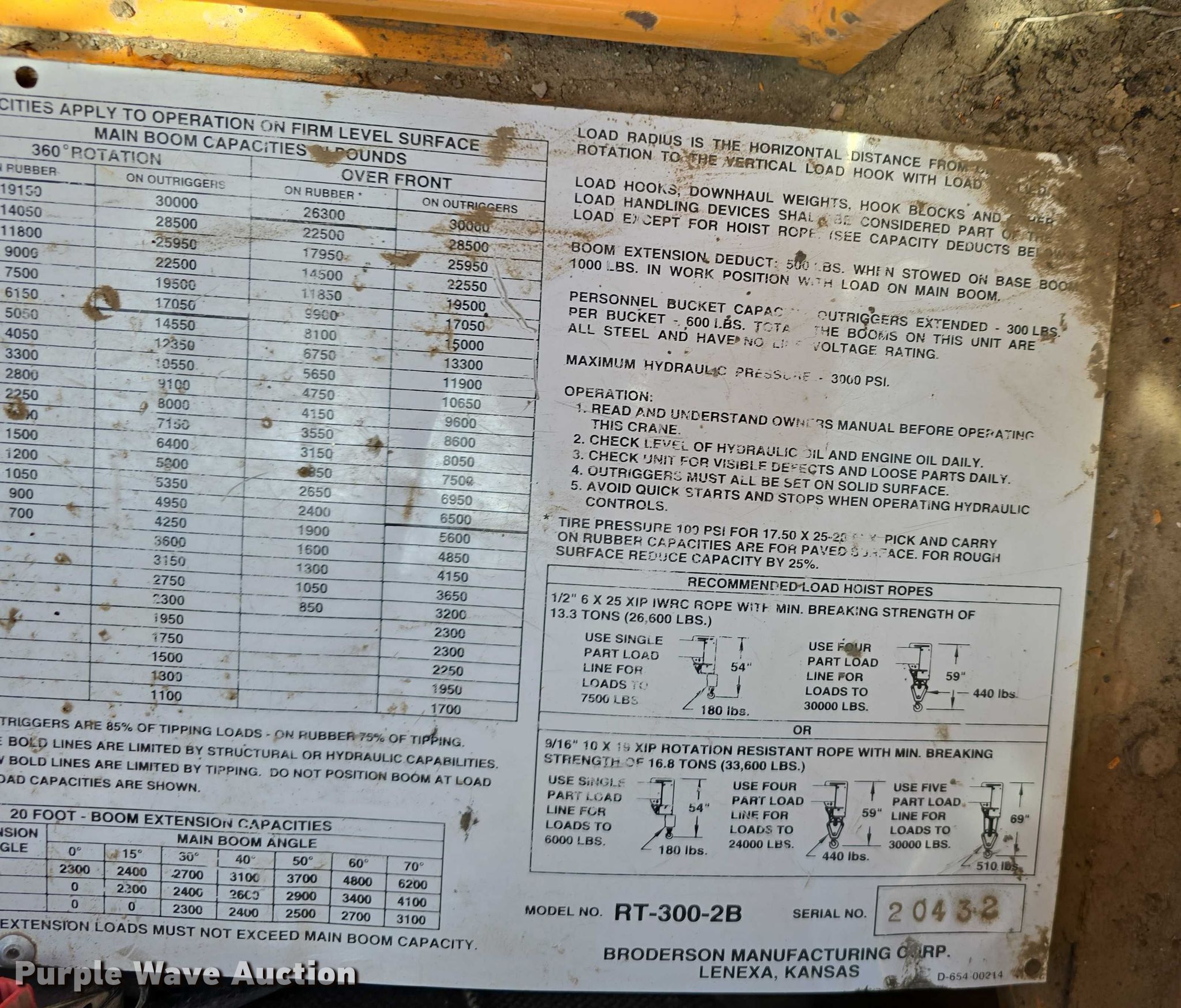 1999 Broderson RT-300-2B crane. Hours: 6,932 on meter, Serial: 20432. Engine John Deere 6068DF150, Serial: T06068D778557, Displacement: 6.8L, Cylinders: 6, Fuel type: Diesel, HP: 125. Transmission Funk 2000, Powershift, Torque converter, 6F - 3R. Chassis Axles: Single, Brakes: Hydraulic. Operators station Enclosed cab, Heat, Crane controls: Stick. Features Boom Telescopic, Maximum boom length: 80' Sections: 4, Maximum lift capacity: 30,000 lbs, Maximum lift height: 87', Stabilizers: 4, Boom controls In-cab, Removable counter weight, Crane block Sheaves: 2, Capacity: 15 lbs, Manuals, Lift chart. Tires Size: 17.5-25. Rion Equipment. Omaha, NE 68127