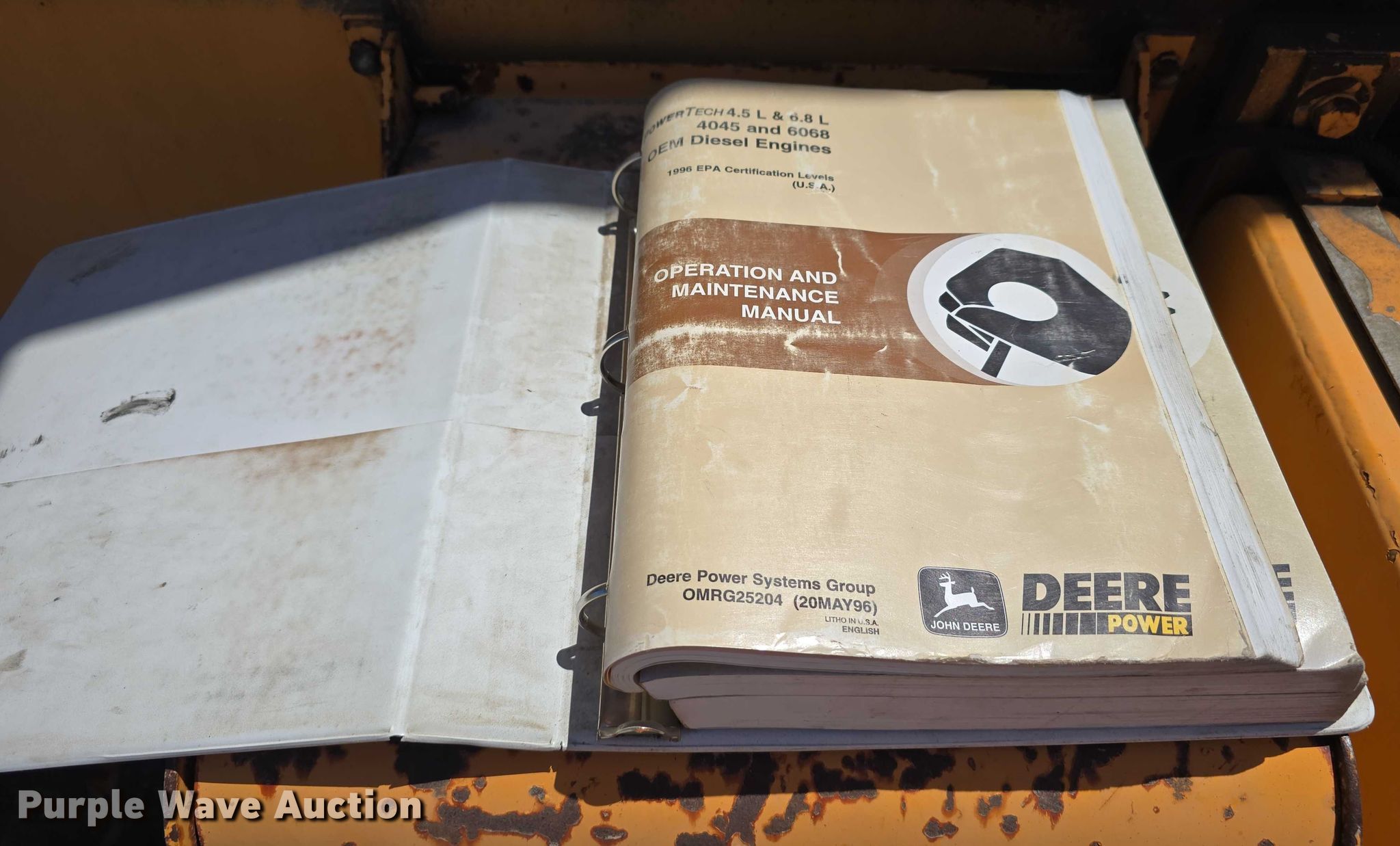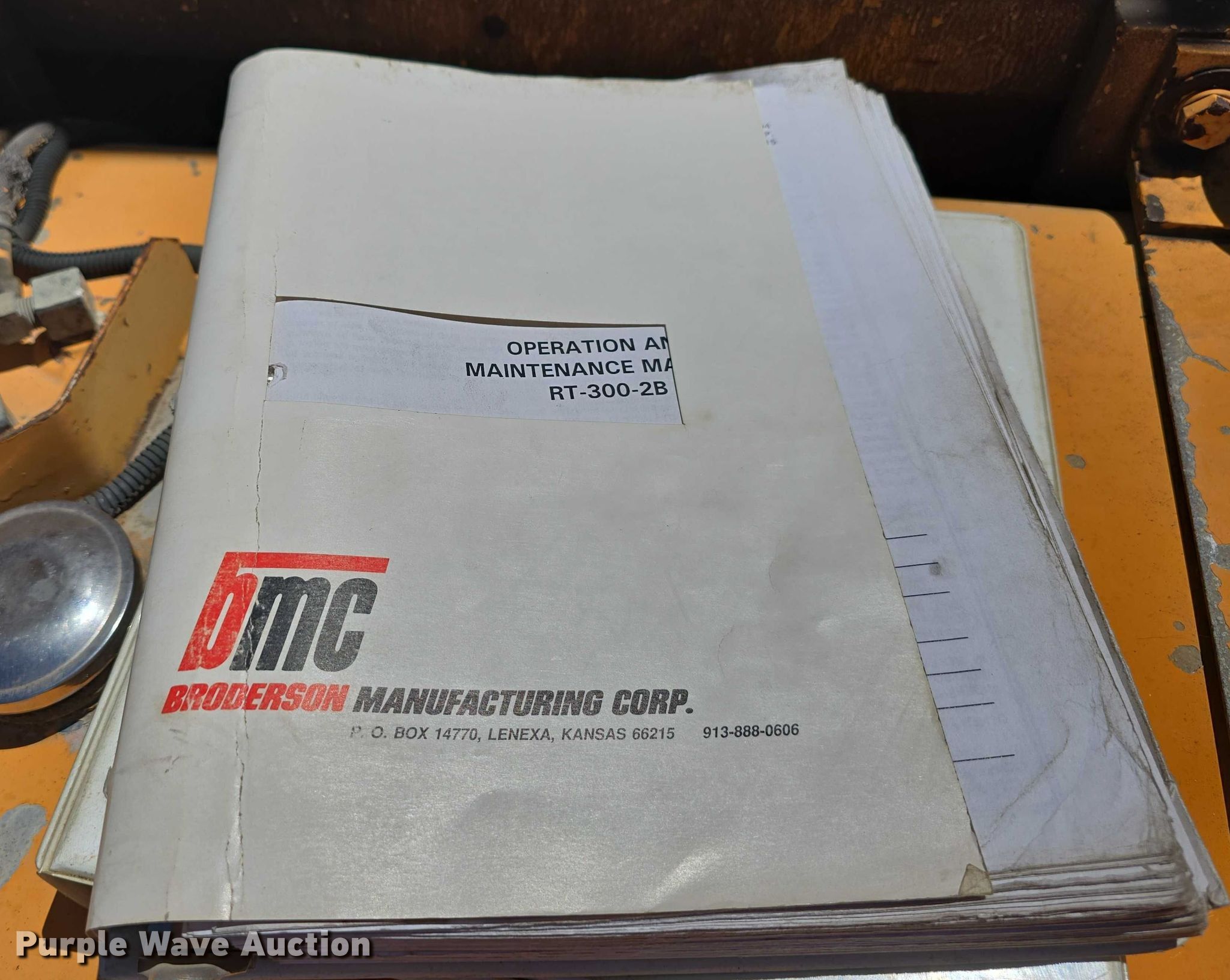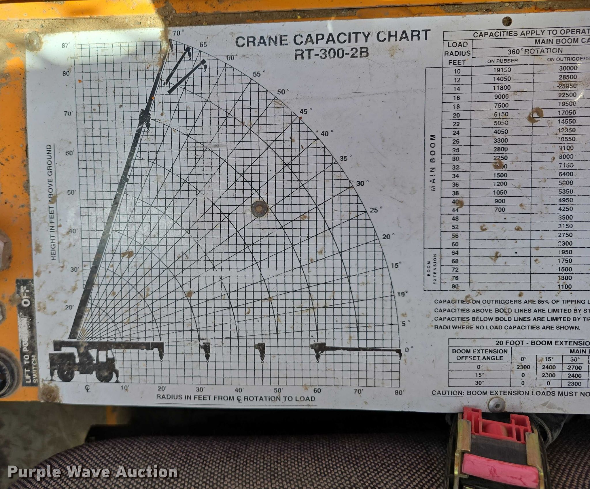 1999 Broderson RT-300-2B crane. Hours: 6,932 on meter, Serial: 20432. Engine John Deere 6068DF150, Serial: T06068D778557, Displacement: 6.8L, Cylinders: 6, Fuel type: Diesel, HP: 125. Transmission Funk 2000, Powershift, Torque converter, 6F - 3R. Chassis Axles: Single, Brakes: Hydraulic. Operators station Enclosed cab, Heat, Crane controls: Stick. Features Boom Telescopic, Maximum boom length: 80' Sections: 4, Maximum lift capacity: 30,000 lbs, Maximum lift height: 87', Stabilizers: 4, Boom controls In-cab, Removable counter weight, Crane block Sheaves: 2, Capacity: 15 lbs, Manuals, Lift chart. Tires Size: 17.5-25. Rion Equipment. Omaha, NE 68127