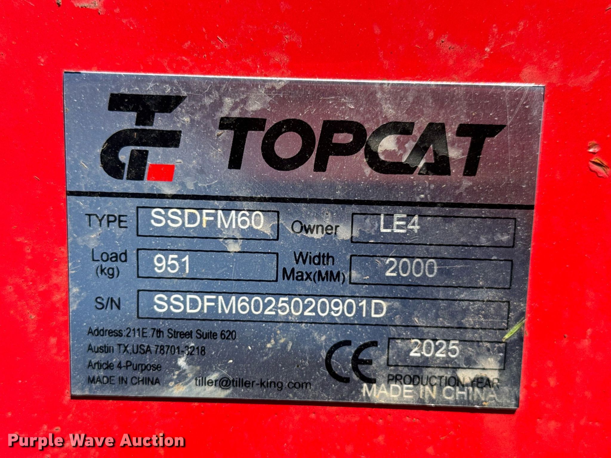 Purple Wave is selling a used Skid Steer Attach. in Kansas. This item is a 2025 TopCat SSDFM60 skid steer mulcher with the following: Serial: SSDFM6025020901D, Width: 56", Unused