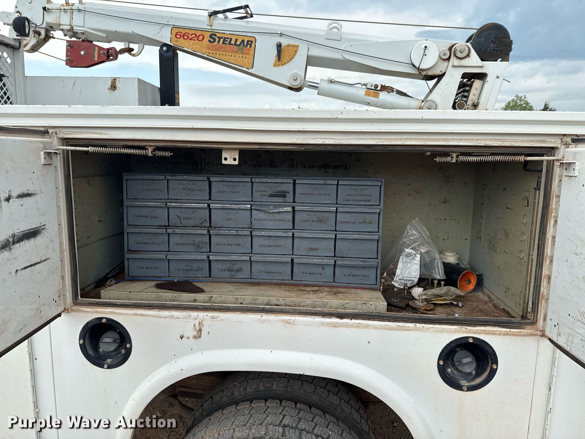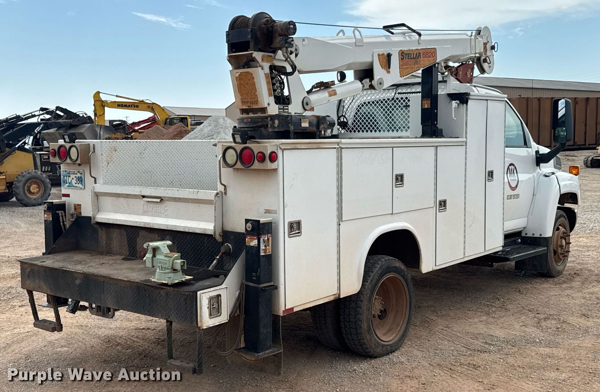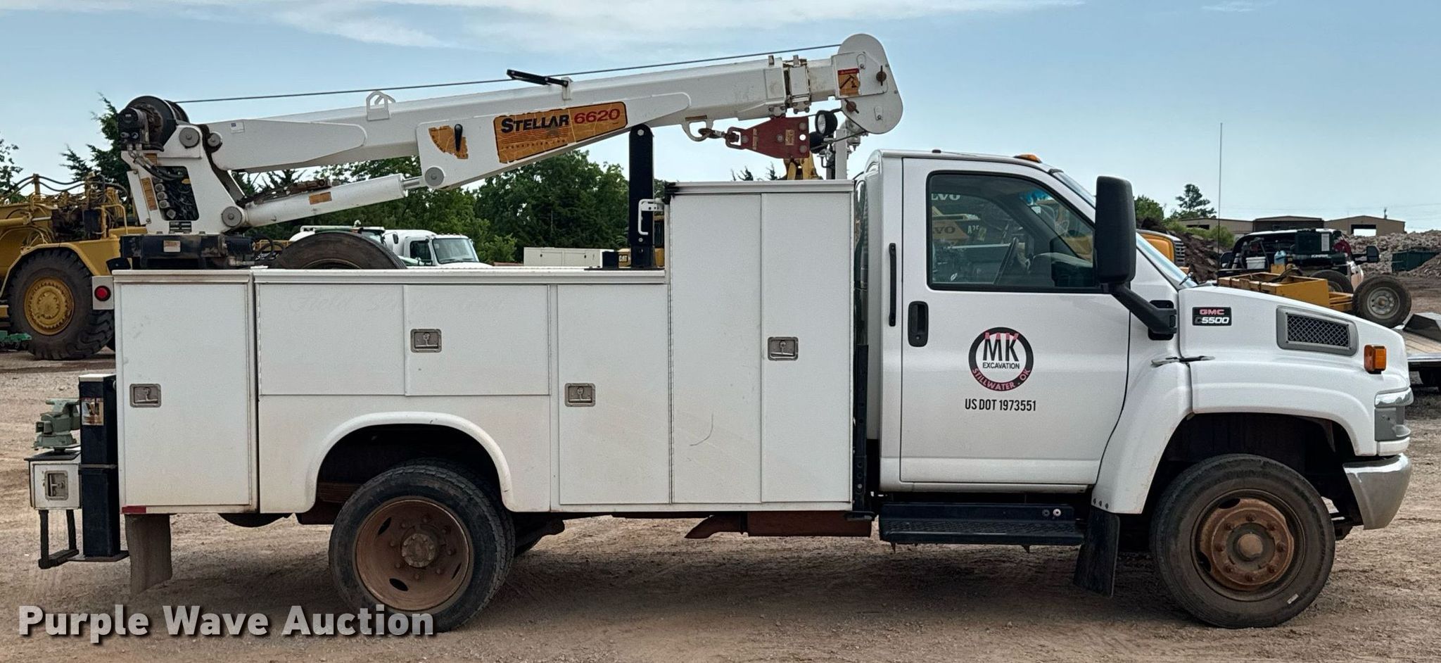 2008 GMC C5500 utility / service truck. Miles: 228,575 on odometer, VIN: 1GDE5C1G48F409398. Engine GM, Displacement: 8.1L, Cylinders: 8, Fuel type: Gas. Transmission Automatic. Chassis Axles: Single, Suspension: Spring, Brakes: Hydraulic, PTO, GVWR: 19,500 lbs. Interior AC, Heat, Cruise control. Features Bed Knapheide, 13' L x 94" W, Air compressor American Eagle SHD-60, Crane Stellar 6620, Maximum boom length: 22' Maximum lift capacity: 6,000 lbs.. Tires Size: 225/70R19.5. Oklahoma title. Title distribution may be delayed up to 14 days from verification of funds. MK Excavation, LLC. Stillwater, OK 74074
