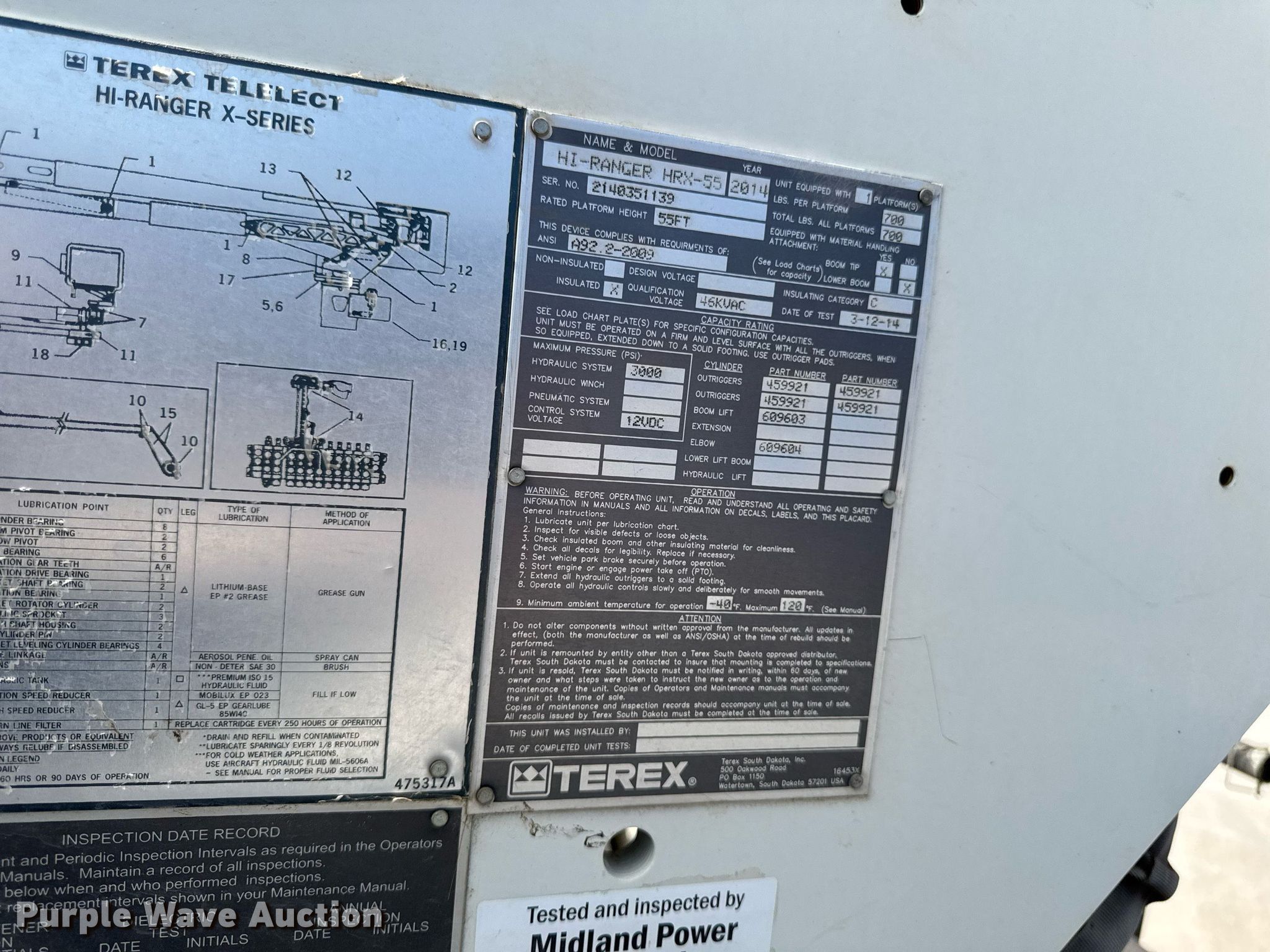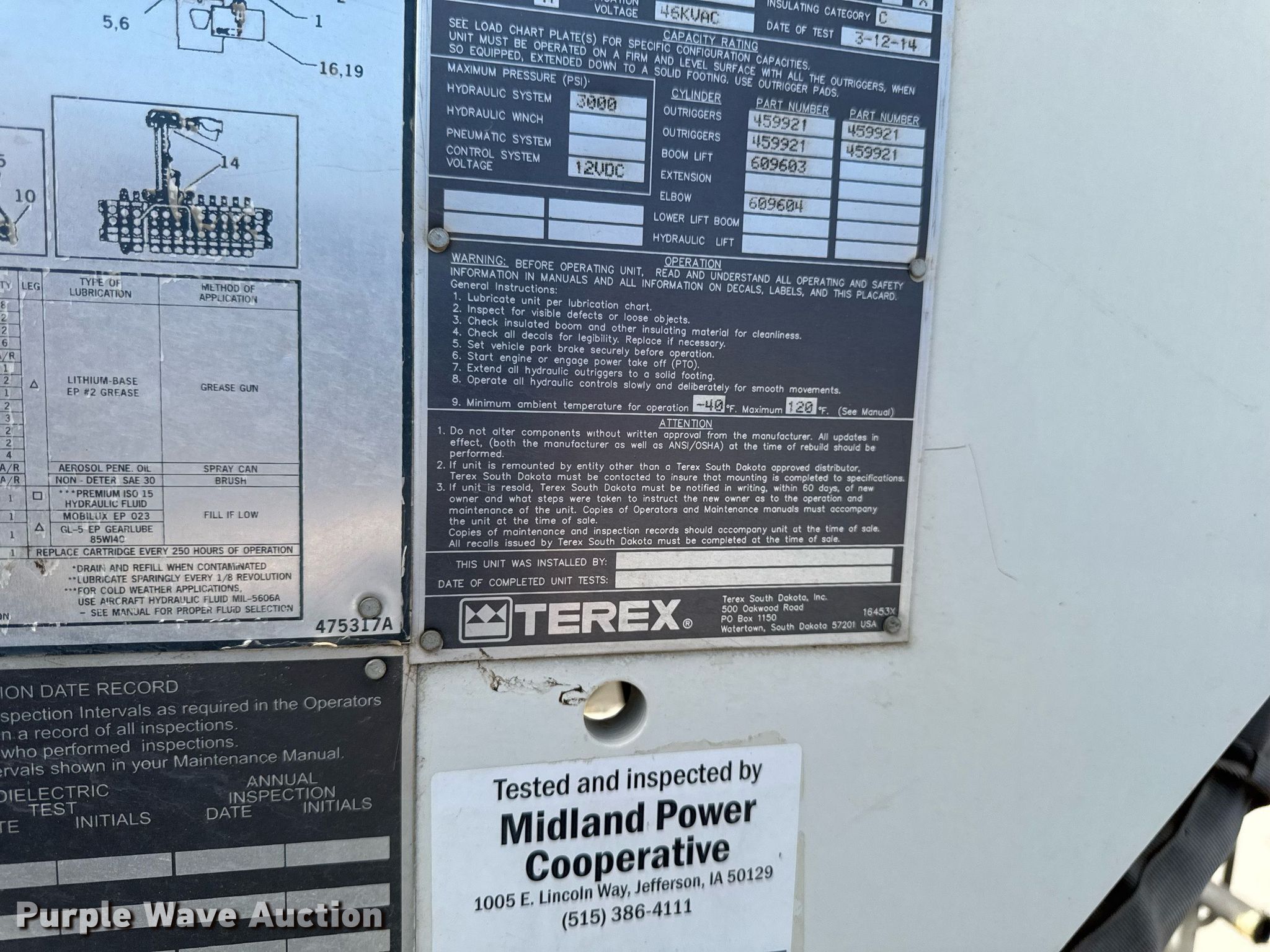 2014 International 4400 bucket truck. Miles: 178,341 on odometer, Hours: 9,863 on meter, VIN: 3HAMKAZN5EL096178. Engine International A330, Displacement: 9.3L, Cylinders: 6, Fuel type: Diesel, HP: 330. Transmission Allison, Automatic. Chassis Axles: Single, Suspension: Spring, Brakes: Air, PTO, GVWR: 33,000 lbs. Interior AC, Heat, Heated mirrors, Power windows, Power locks, Cruise control, Auxiliary controls, Brake controller. Features Bed Brand FX, Serial: 1865826, 14' L x 98" W, Boom 2014 Terex Hi-Ranger HRX-55, Serial: 2140351139, Mast height: 55', Maximum lift capacity: 700 lbs, Boom type: Articulating, Insulated, Man basket, Boom controls Ground, Platform/ basket, Material handler, Pole guide. Tires Front: 315/80R22.5, Rear: 11R22.5. Iowa title. Title distribution may be delayed up to 14 days from verification of funds. Midland Power Cooperative. Jefferson, IA 50129
