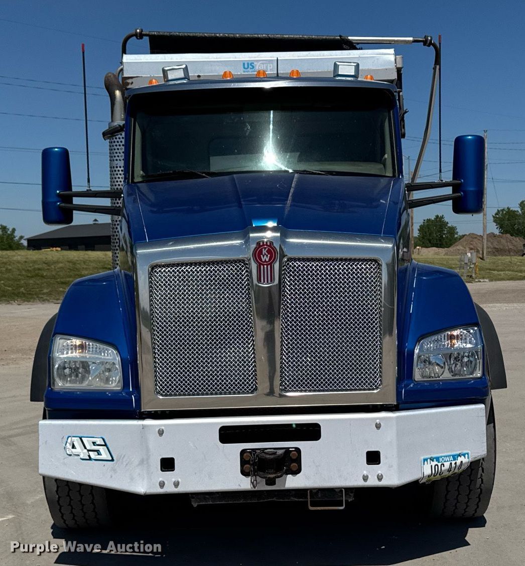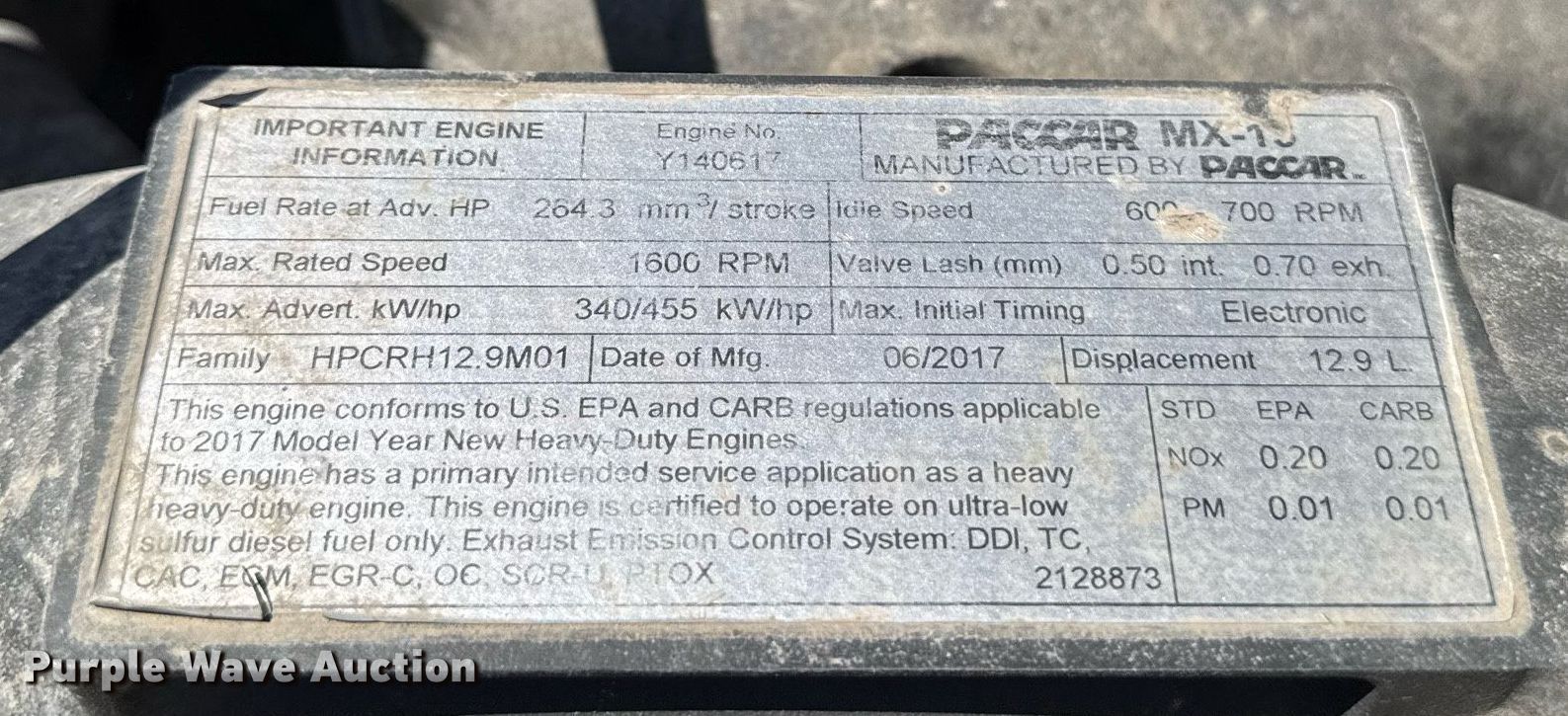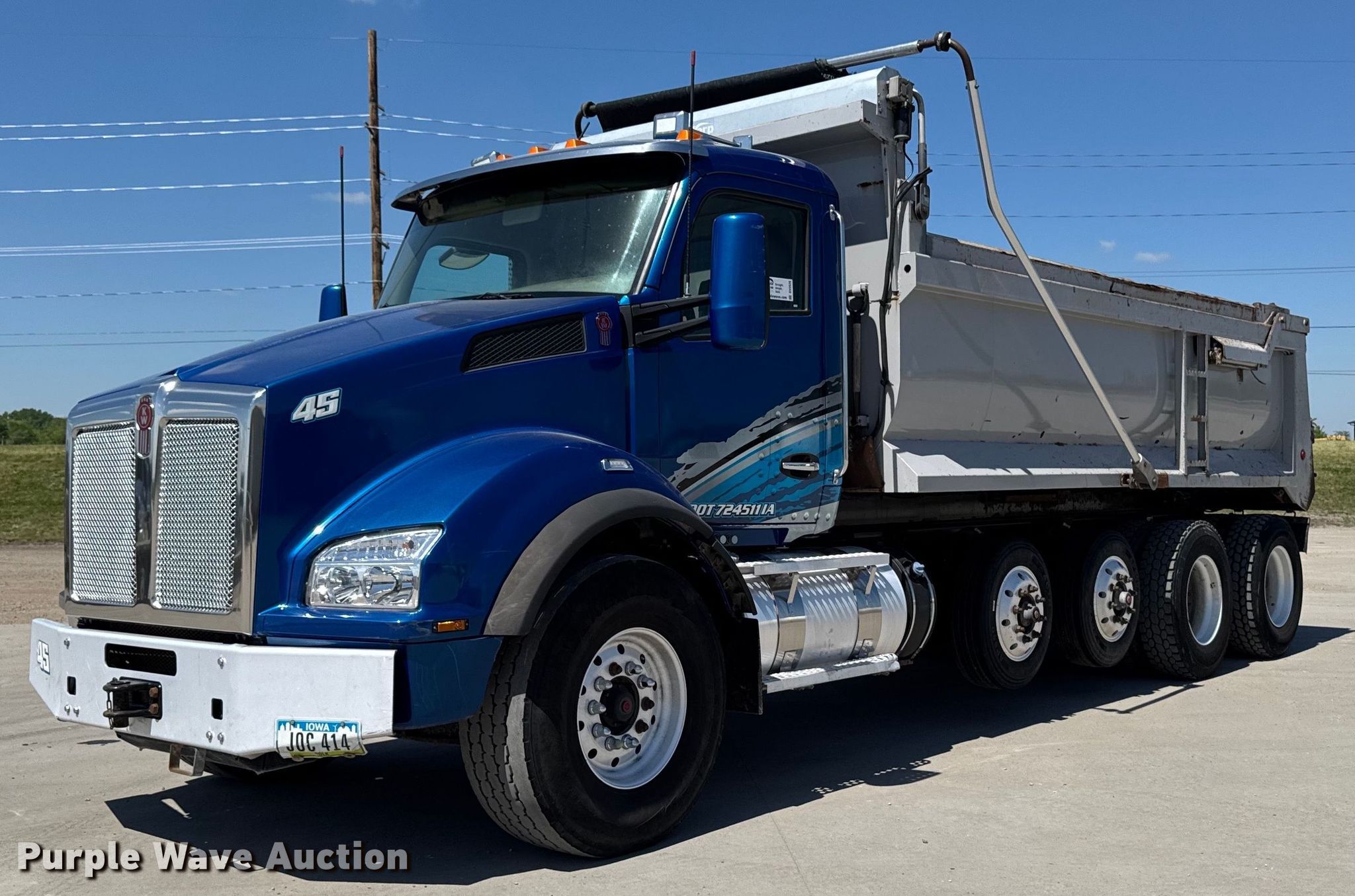 2018 Kenworth T880 dump truck. Miles: 300,207 on odometer, Hours: 14,687 on meter, VIN: 1NKZXPEX4JJ203940. Engine Paccar MX-13, Displacement: 12.9L, Cylinders: 6, Fuel type: Diesel, HP: 455, Engine brake. Transmission Allison 4500RDS, Automatic. Chassis Axles: 4, Pusher axle Steerable, Differential lock: Full, Suspension: Spring over walking beam Hendricks Haulmax, Brakes: Air, PTO, GVWR: 79,760 lbs FAWR: 20,000 lbs, IAWR: 20,000 lbs, RAWR: 20,000 lbs, Lift axle GAWR: 9,880 lbs. Interior AC, Heat, Heated mirrors, Power windows, Cruise control. Features Dump bed Hilark 19 3/16, 19' L x 96" W, Side height: 49", Side board height: 5", Bed type: Steel, Roll tarp, Ram: Single, End gate: Air operated. Tires Front: 425/65R22.5, Rear: 11R22.5, Lift axle: 245/70R19.5. Iowa title. Title distribution may be delayed up to 14 days from verification of funds. Larry Fleck & Son Trucking, LLC. Des Moines, IA 50327