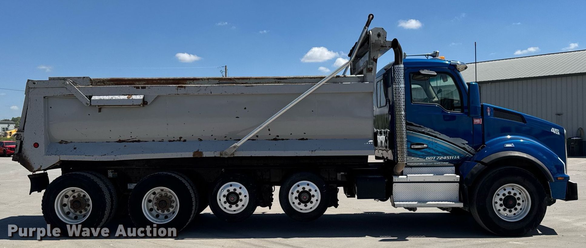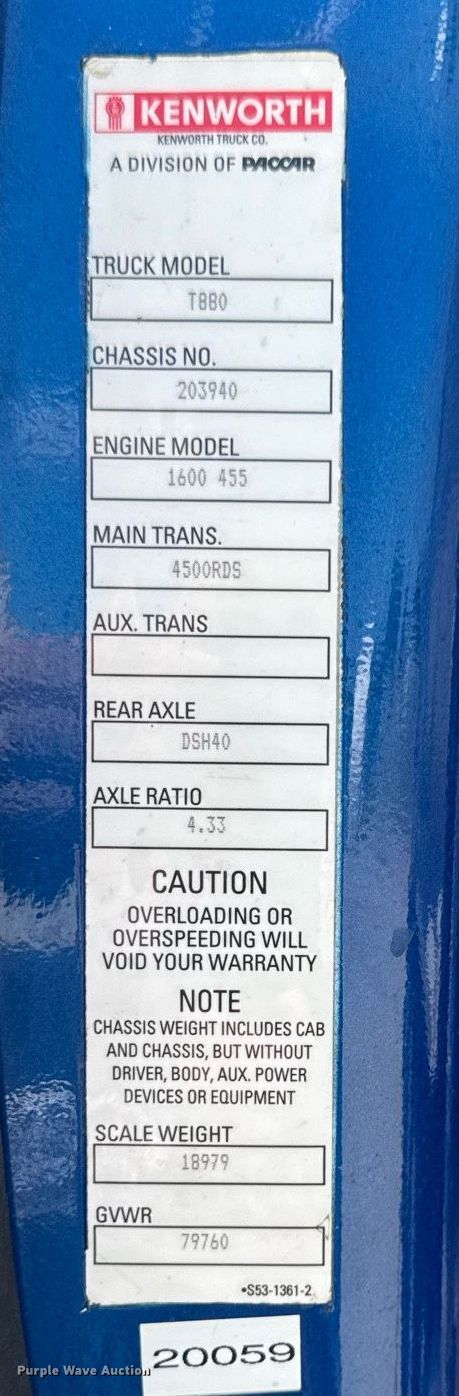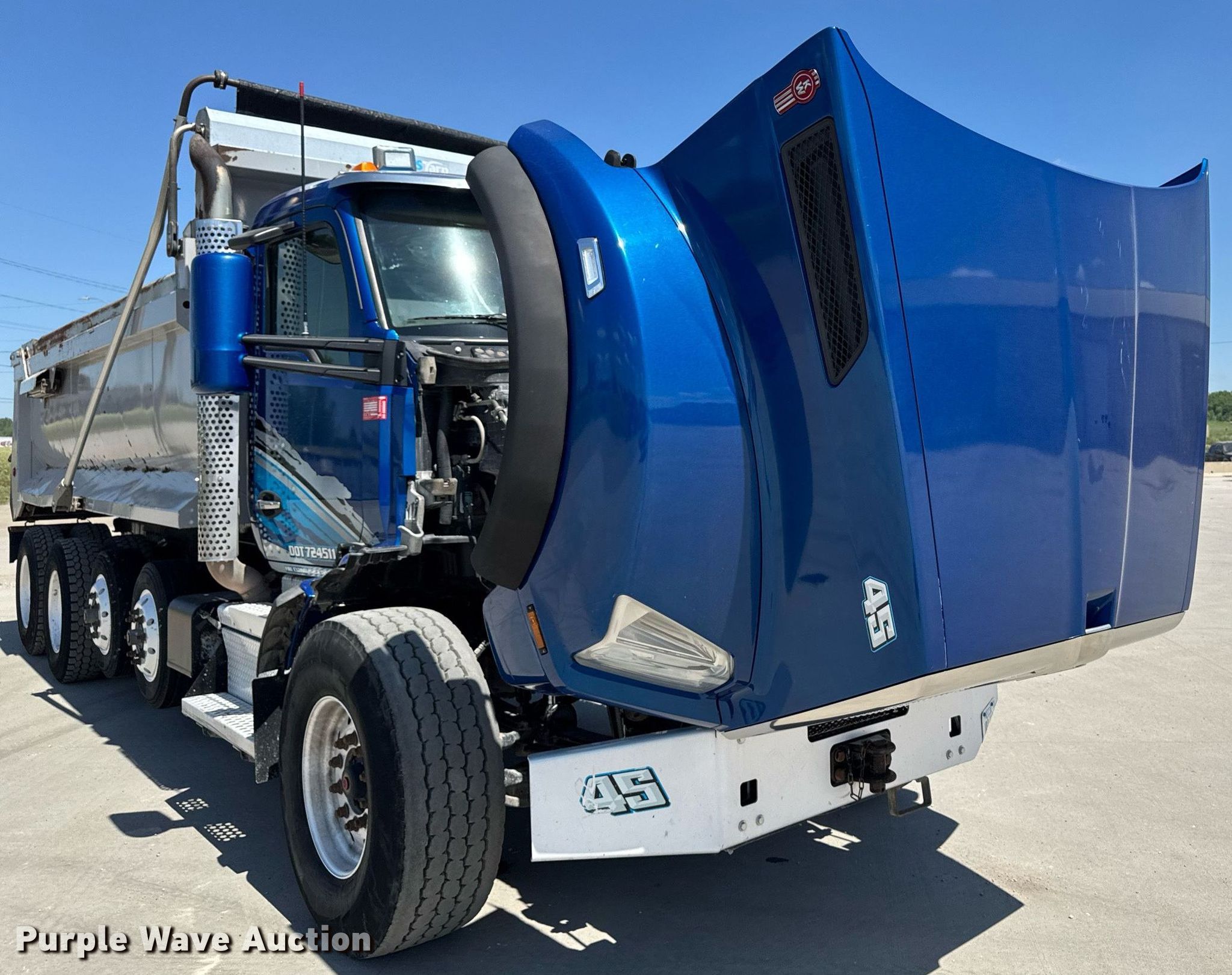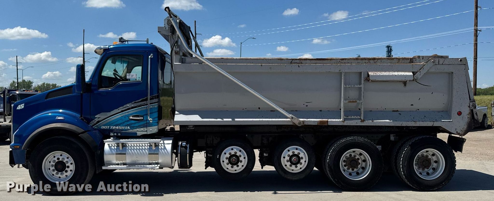 2018 Kenworth T880 dump truck. Miles: 300,207 on odometer, Hours: 14,687 on meter, VIN: 1NKZXPEX4JJ203940. Engine Paccar MX-13, Displacement: 12.9L, Cylinders: 6, Fuel type: Diesel, HP: 455, Engine brake. Transmission Allison 4500RDS, Automatic. Chassis Axles: 4, Pusher axle Steerable, Differential lock: Full, Suspension: Spring over walking beam Hendricks Haulmax, Brakes: Air, PTO, GVWR: 79,760 lbs FAWR: 20,000 lbs, IAWR: 20,000 lbs, RAWR: 20,000 lbs, Lift axle GAWR: 9,880 lbs. Interior AC, Heat, Heated mirrors, Power windows, Cruise control. Features Dump bed Hilark 19 3/16, 19' L x 96" W, Side height: 49", Side board height: 5", Bed type: Steel, Roll tarp, Ram: Single, End gate: Air operated. Tires Front: 425/65R22.5, Rear: 11R22.5, Lift axle: 245/70R19.5. Iowa title. Title distribution may be delayed up to 14 days from verification of funds. Larry Fleck & Son Trucking, LLC. Des Moines, IA 50327